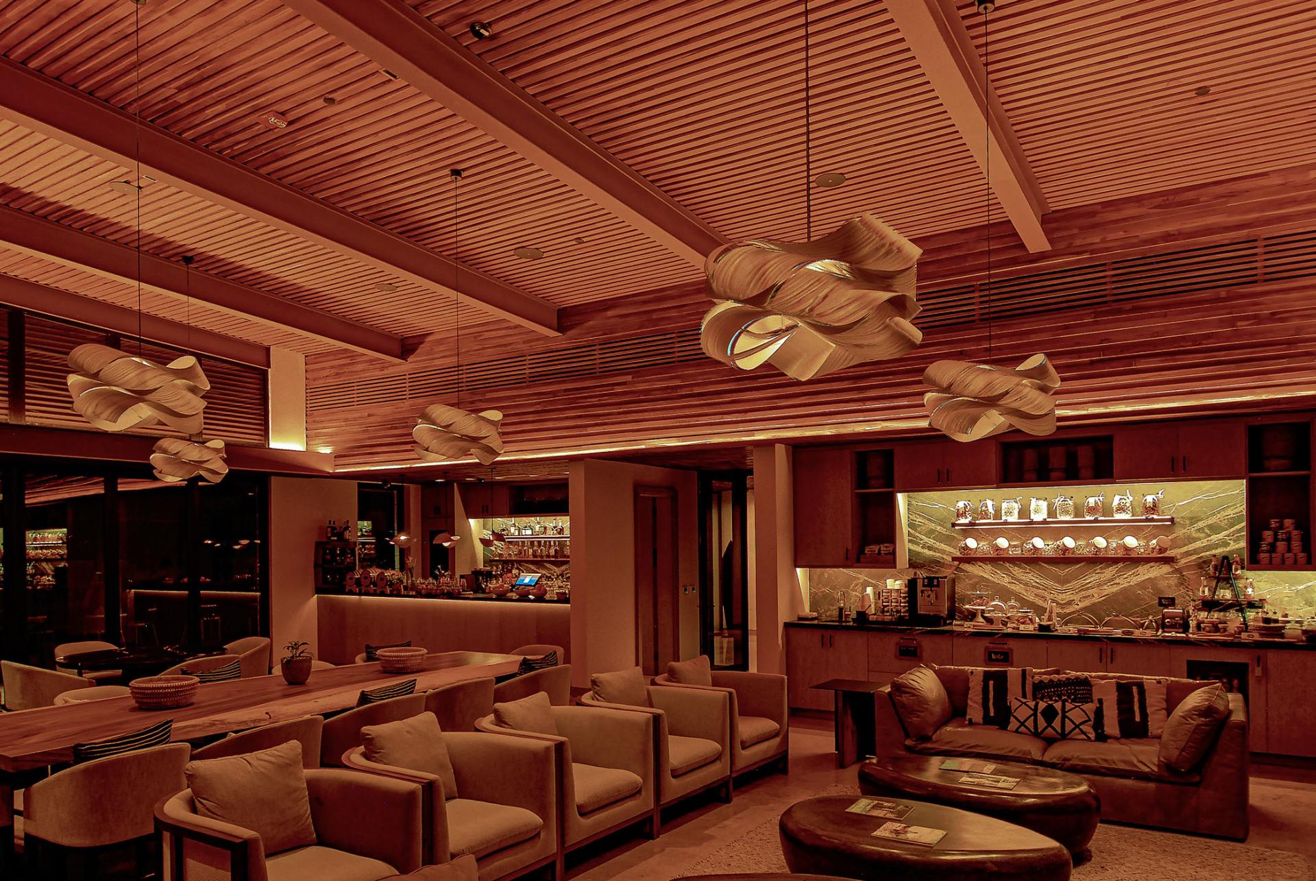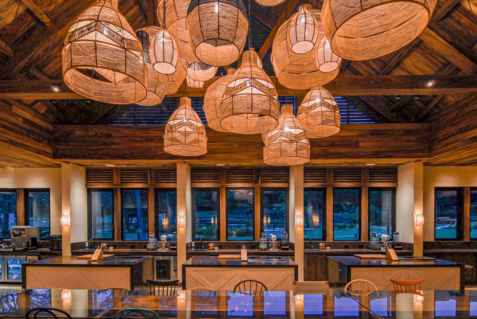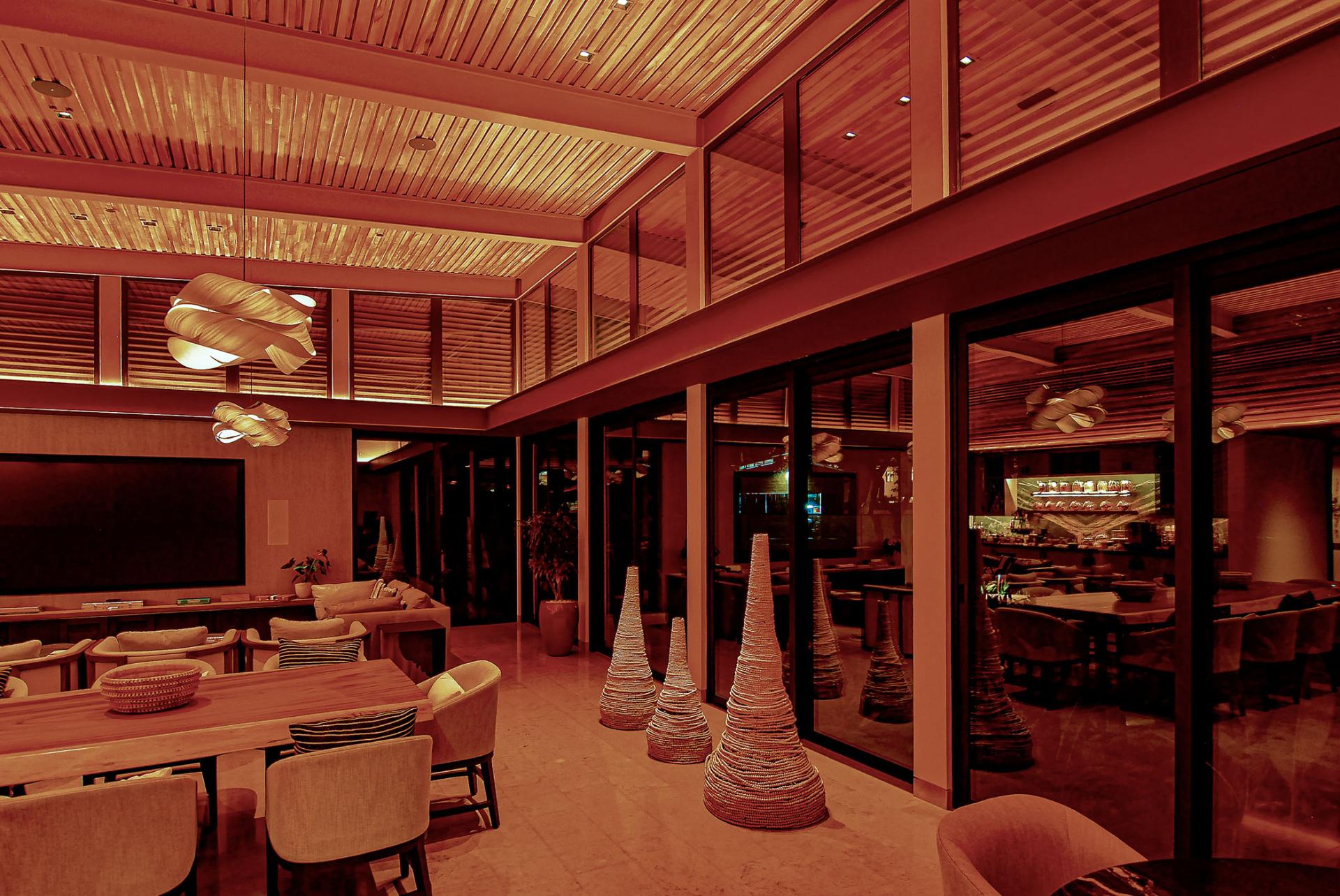 The architectural design goal for the Beach Club and Restaurant was showcasing wood and other natural materials typical of Costa Rica in a contemporary aesthetic. The lighting intent was to use minimal downlighting and create glowing spaces with warm-dim sources that accentuate the natural materials. Spaces used for relaxing, lounging and dining are designed to be warm and comfortable while balancing drama and the perception of light. Timeclock-triggered lighting scenes are programmed with the time of day so carefully set lighting scenes blend seamlessly from day to evening.