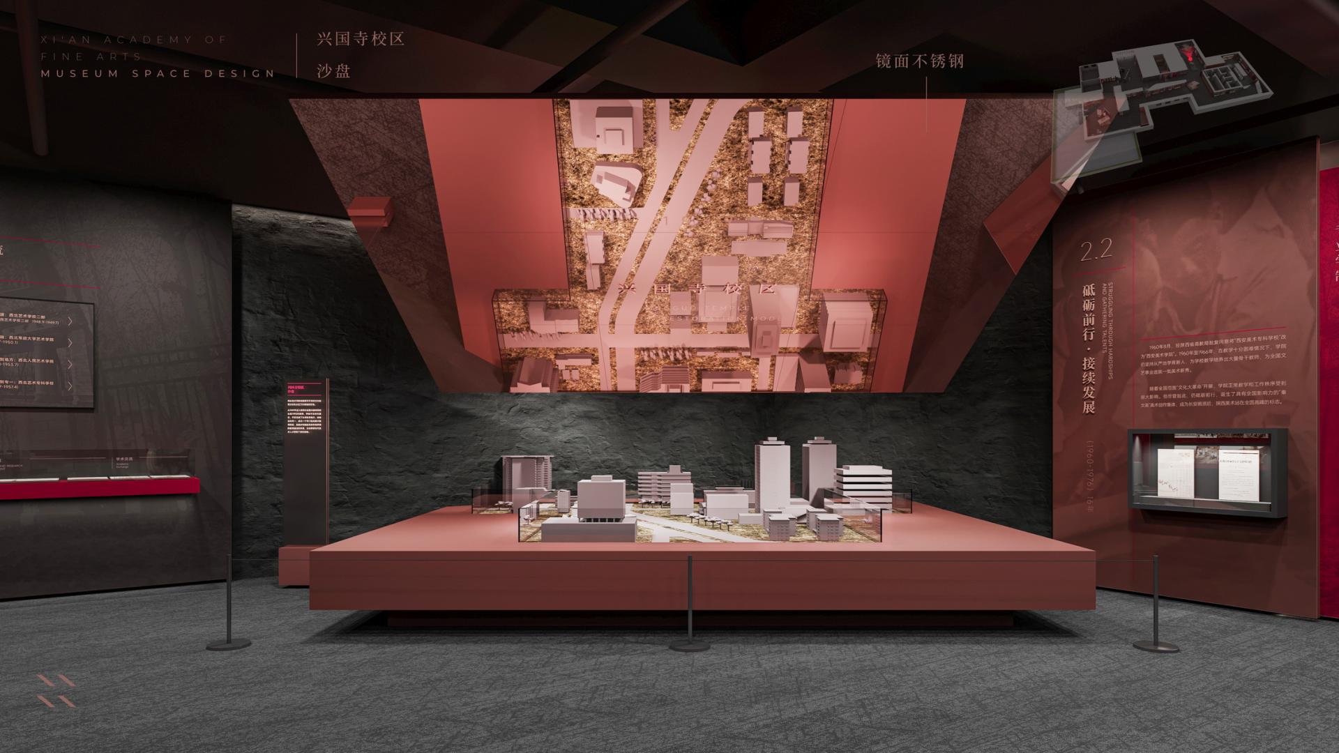 The design of the exhibition space draws inspiration from the medium of paper, which holds deep significance in Chinese art history. Central to the design is the theme “Layers of Cultural Heritage in Xi’an Academy”, symbolizing the transmission of artistic traditions across generations. The exhibit features models of the academy's campuses from various periods, and tilted mirrored stainless-steel panels are positioned above the models, allowing visitors to view both the front and top. This innovative presentation connects the past with the present, offering a glimpse into the academy’s ongoing evolution and future aspirations.