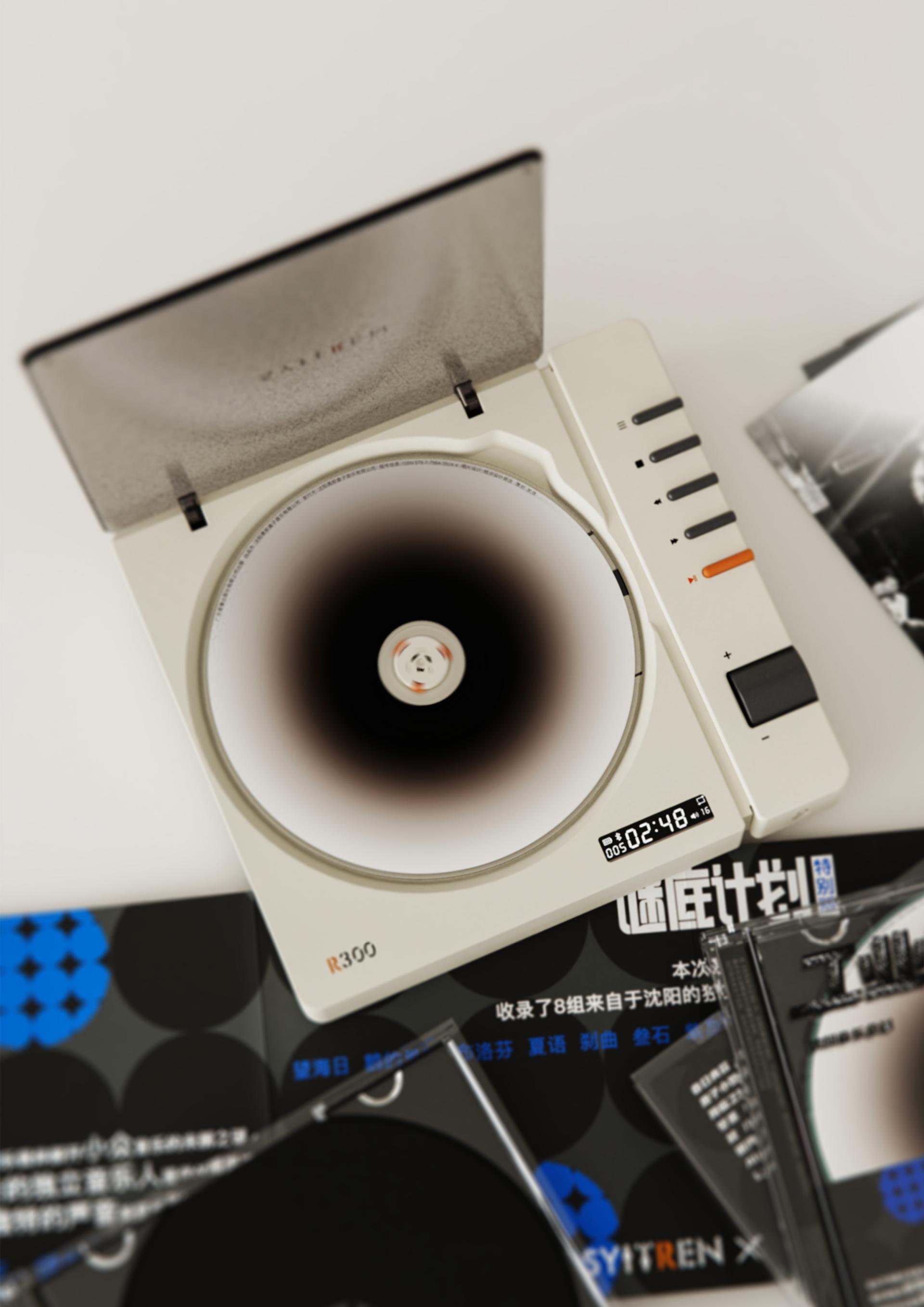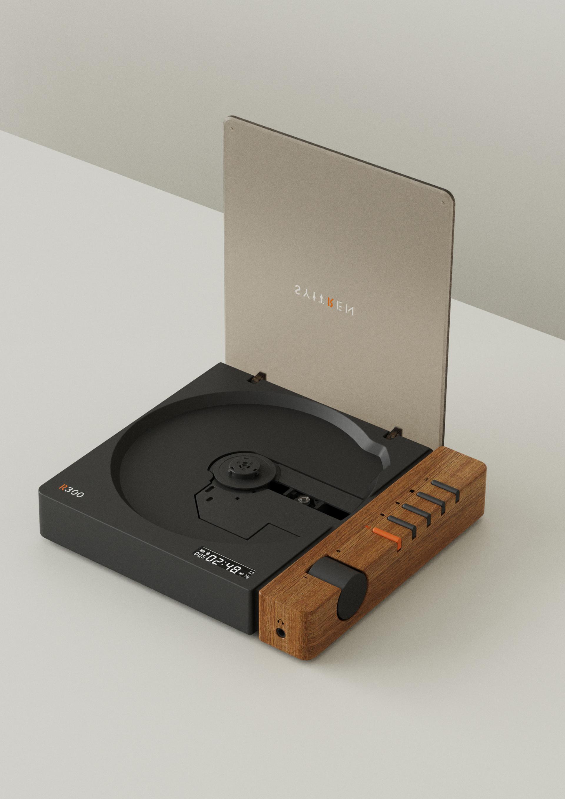 Characterized by a distinct industrial style appearance, the CD player exhibits exceptional functional capabilities. Its exterior features a simple yet elegant design, defined by smooth lines and classic colour schemes such as wood grain, black, and white. This combination not only highlights modern industrial aesthetics but also facilitates the product's integration into diverse home environments, thereby creating a vibrant and personalized living space for users. The inclusion of orange as an accent colour enhances the product's vibrant visual appeal. To facilitate a seamless and intuitive interaction, the design incorporates a left and right zoning layout: the interactive buttons are centrally located on the right side, while the left side accommodates the disc compartment, ensuring unhindered disc rotation. The logical arrangement of buttons promotes a more intuitive and straightforward operational experience. This product not only preserves the traditional characteristics of CD players but also introduces multifunctional features that cater to the contemporary user's desires for convenience, style, and superior sound quality, showcasing the design's unique allure.