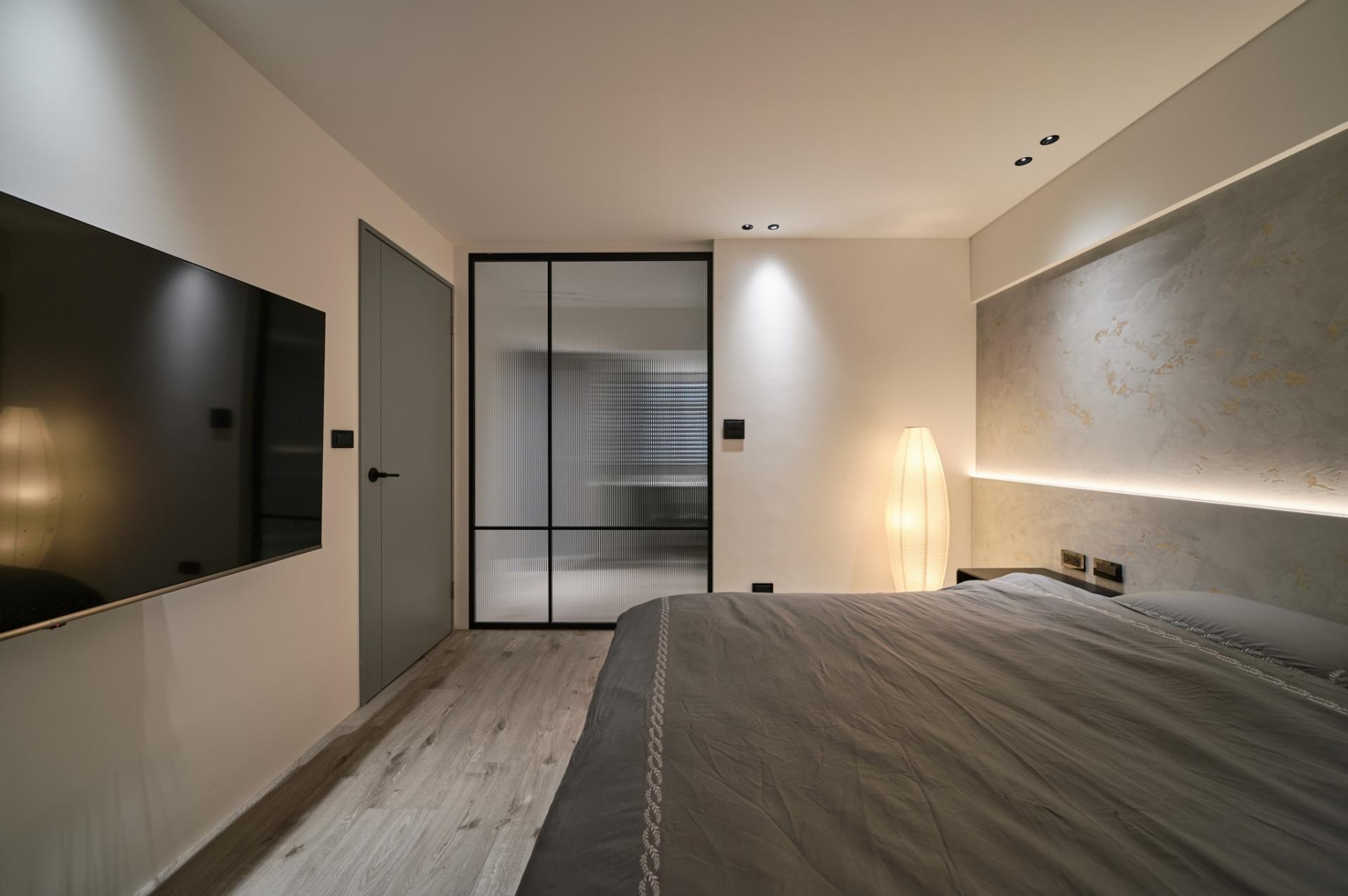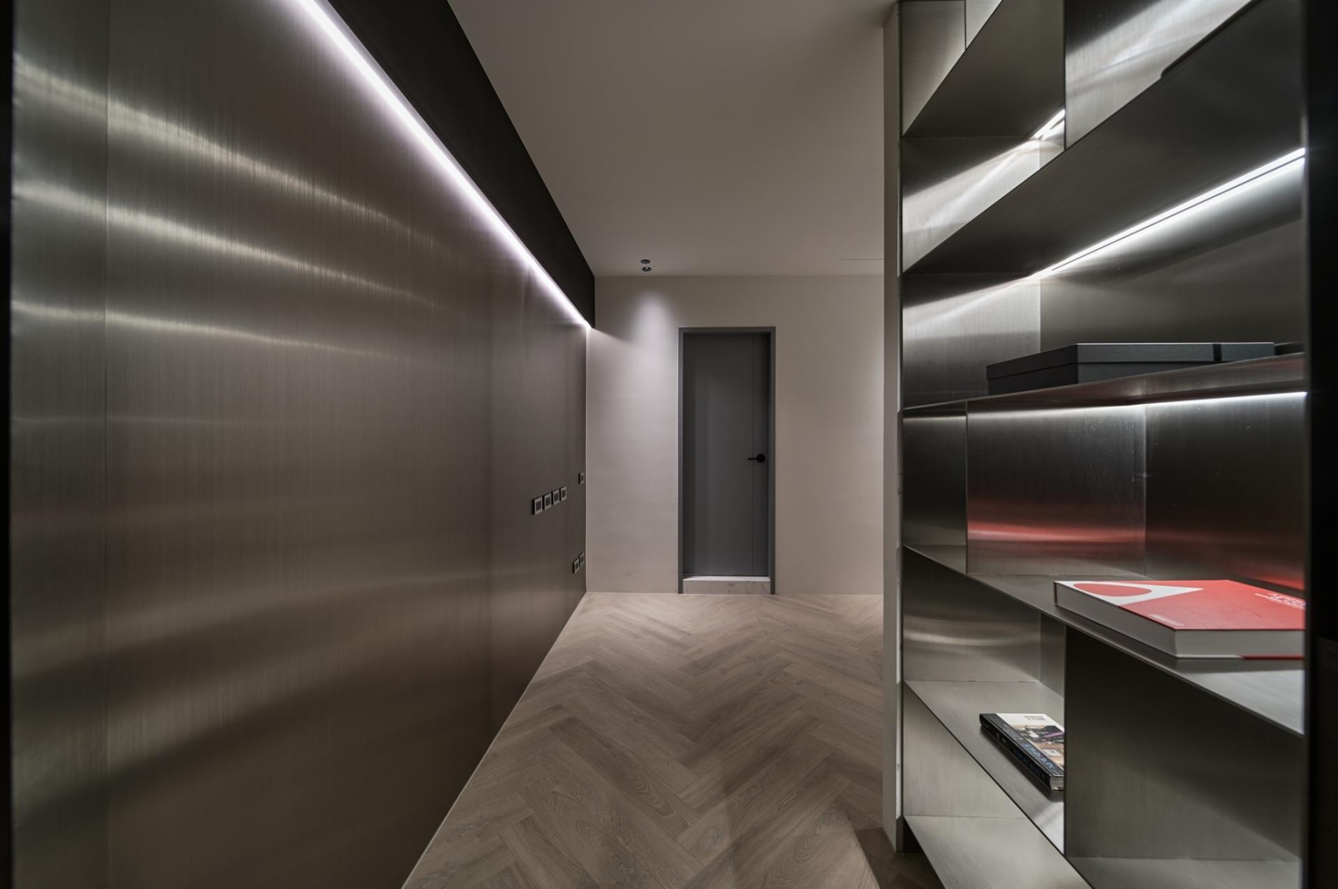 The design concept integrates metallic finishes, dark wood tones, and artistic textures to create a sense of depth and modern elegance. A standout feature is the curved metal ceiling in the hallway, enhanced by indirect lighting to establish a gallery-like corridor that connects the public and private areas. The master bedroom showcases an accent wall with artistic paint and gold details, exuding understated luxury. In the bathroom, green tiles and floral patterns introduce a playful yet refined character.