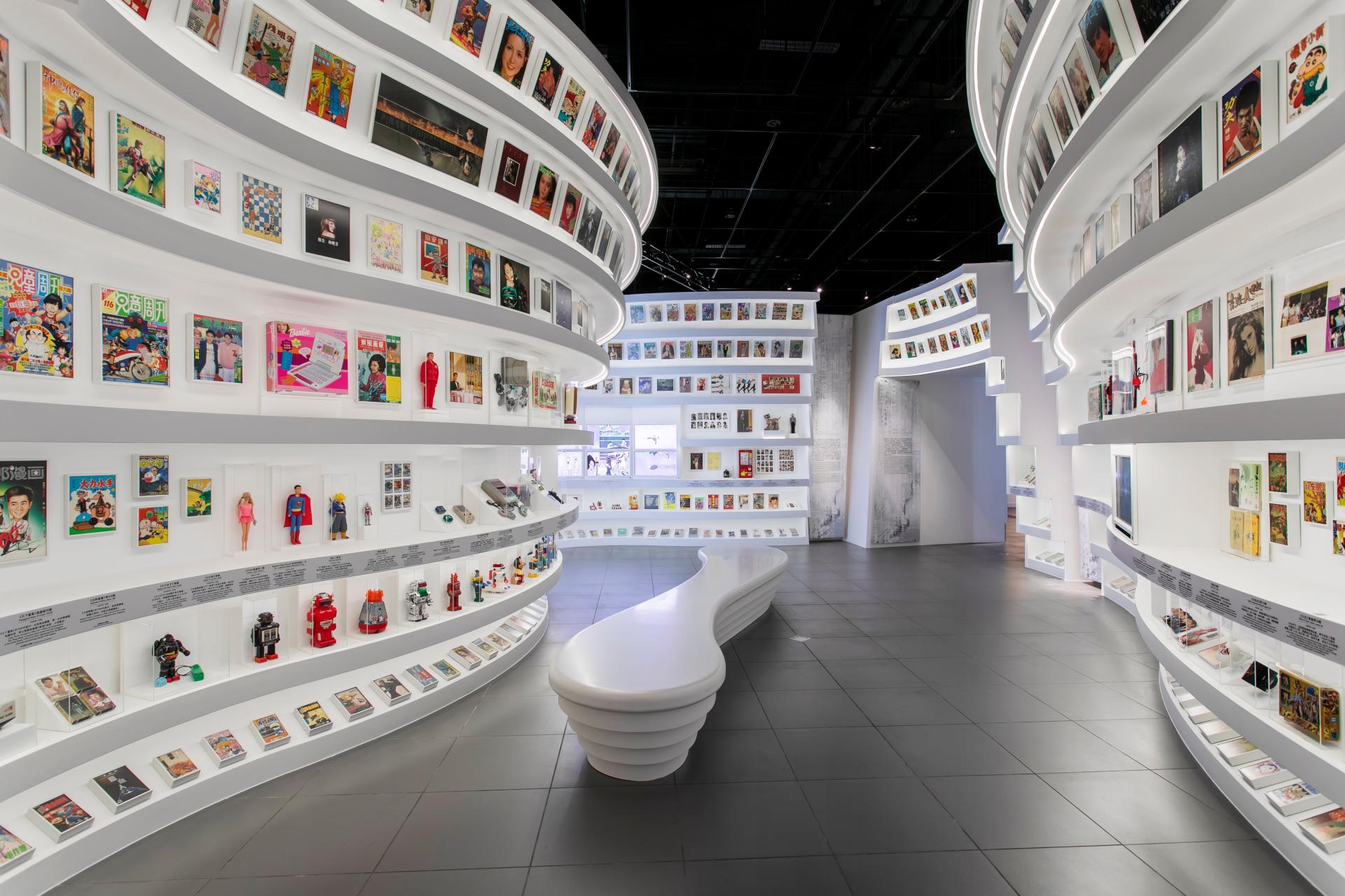 The exhibition concludes with the 'Other Popular Culture' Gallery, which displays a wider sample of Hong Kong's pop culture in other media such as toys, comics, books, posters, and art, both historically and modern, showcasing the increasing fluidity of cultural elements combining global and local influences for a vibrant and unique cultural landscape. This 'fluid cultural landscape' is represented by the organic stepped wall structures, interrupted by cuts in the curved forms which contain section panels. Projections above the displays change to reflect the latest trends and influences in contemporary Hong Kong culture.