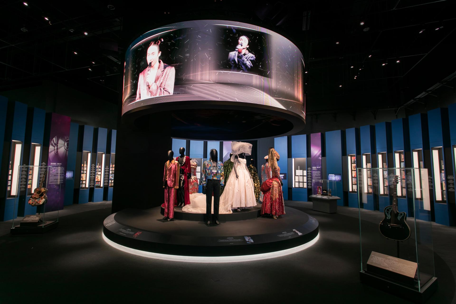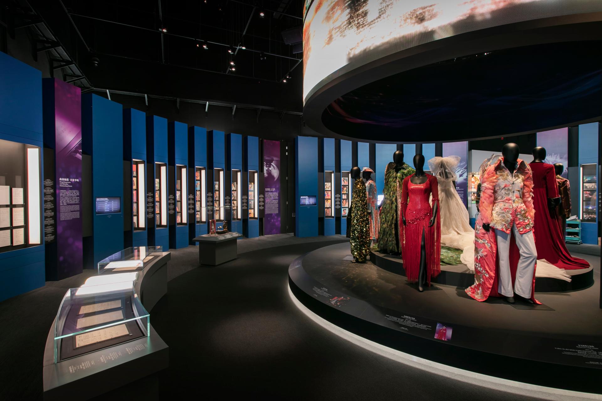 The 'Music Culture' space celebrates the iconic tunes and music legends of Hong Kong. A central performance stage presents costumes worn by Hong Kong's most notable performers and celebrates popular Cantonese music produced over multiple decades. Above is a suspended circular LED screen that displays clips from famous concerts illuminated by theatrical lighting effects.