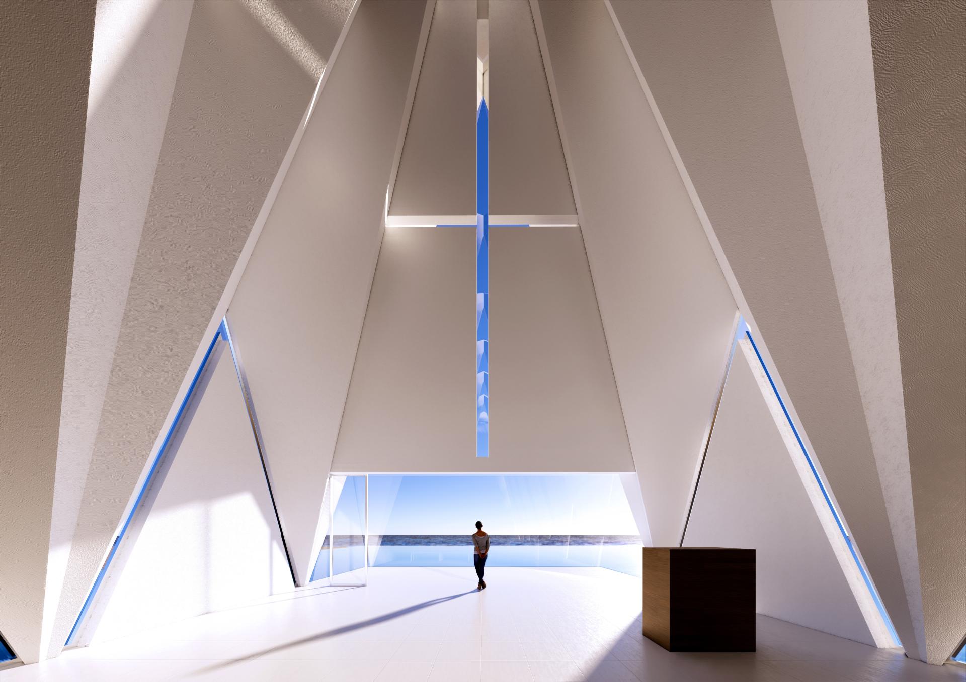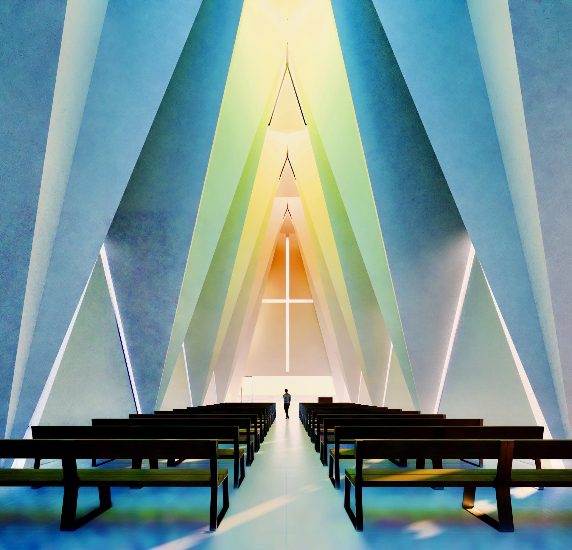 We took the stained glass stained glass windows of Gothic churches as a prototype and applied them to the design of the chapel. A long colored glass skylight is installed at the top of the auditorium, filtering sunlight through frosted colored glass and casting soft light of different colors indoors. The origami like architectural form is like a box of light and shadow, arranging seven colors of light and shadow in order from warm to cool, creating an extremely mysterious atmosphere of sky light. Looking up, it feels like communicating and conversing with the heavens.