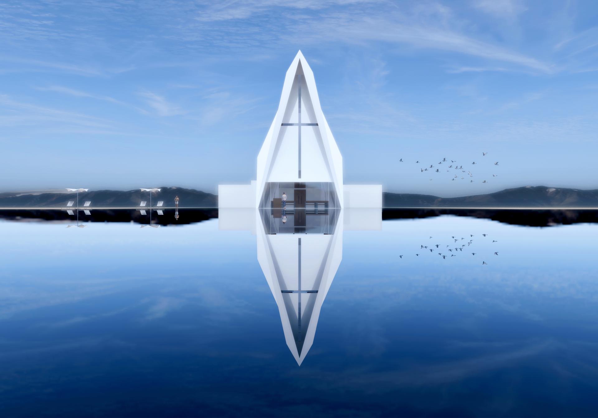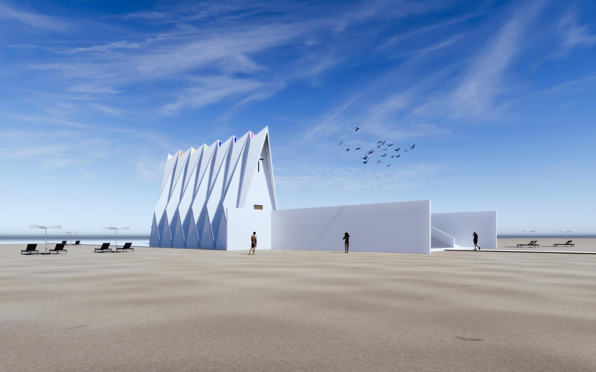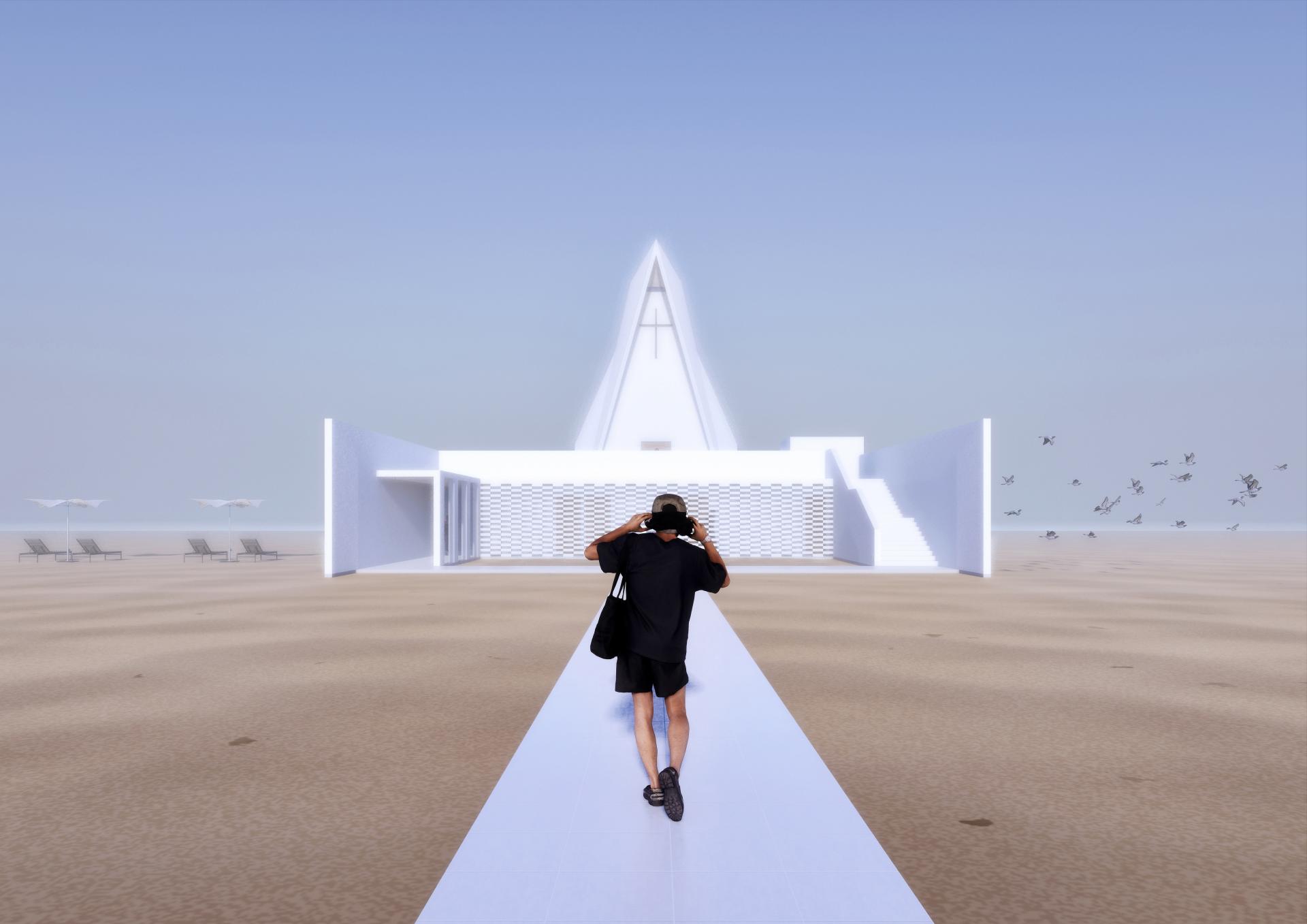 The scheme design seeks architectural prototypes from origami, folds paper to form unit structures, and through continuous repetition and combination, creates a building volume with a sense of rhythm and sculpture. The rough white coating material on the exterior enhances this morphological feature, and against the backdrop of yellow sand, blue sky, and sea, the building reflects soft sunlight, becoming more eye-catching.