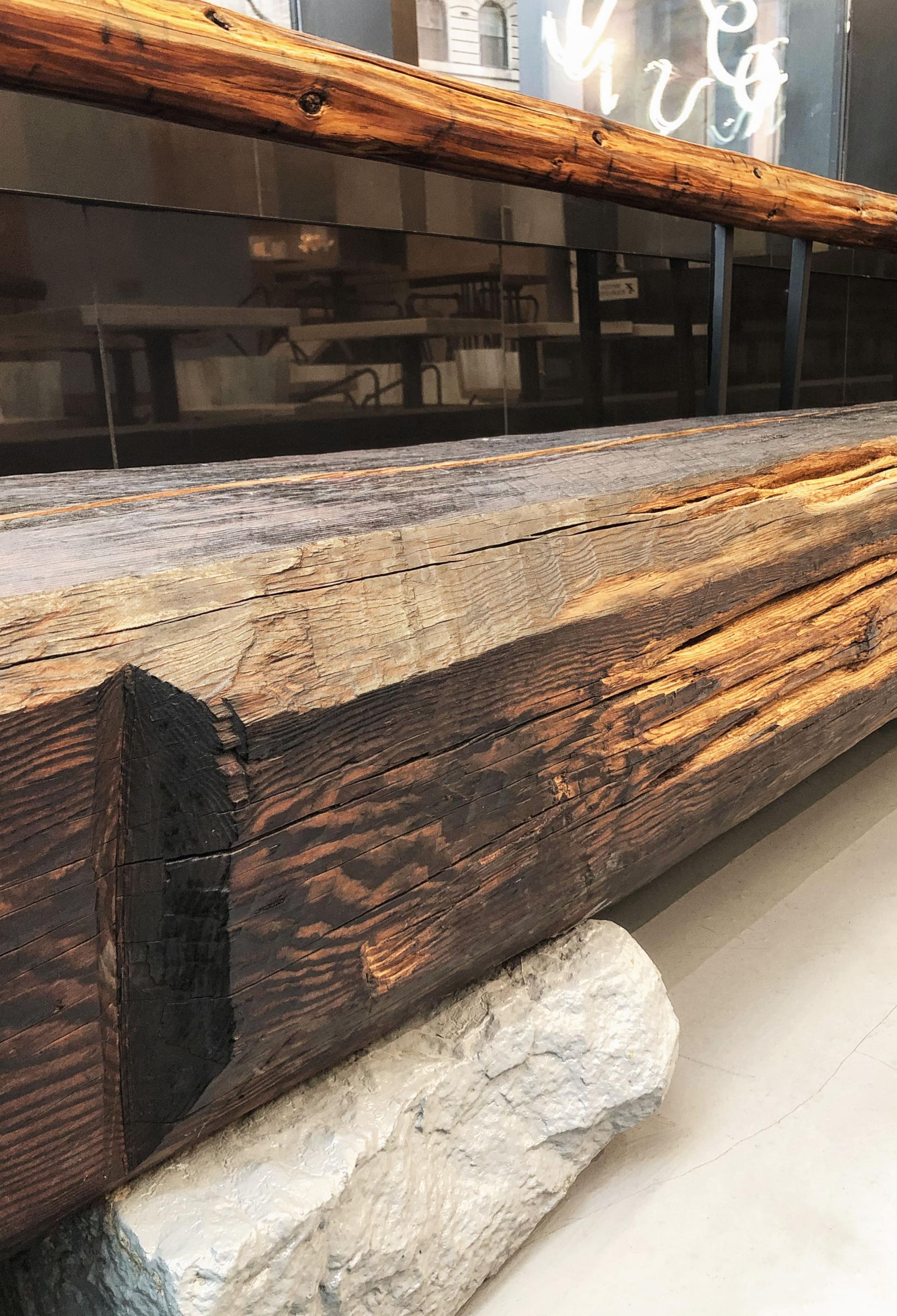In terms of design, the store’s benches are crafted from reclaimed timber and stacked stone. The aged wood originates from dismantled Japanese wooden structures, while the stacked stone was once the foundation supporting floorboards made from aged trees in traditional Japanese folk houses. By incorporating these enduring materials, we aim to create a space that will stand the test of time, remaining relevant and inviting for generations to come.