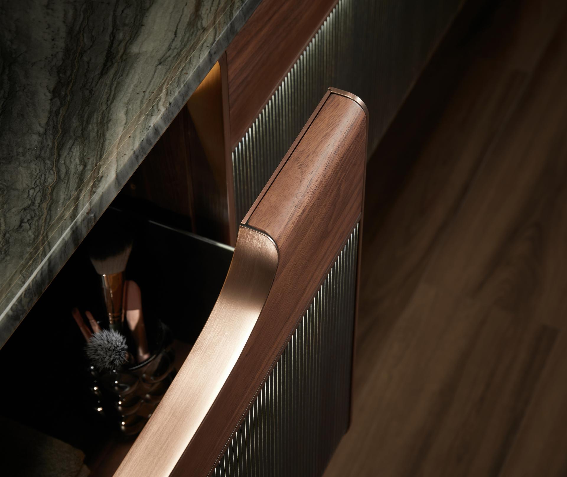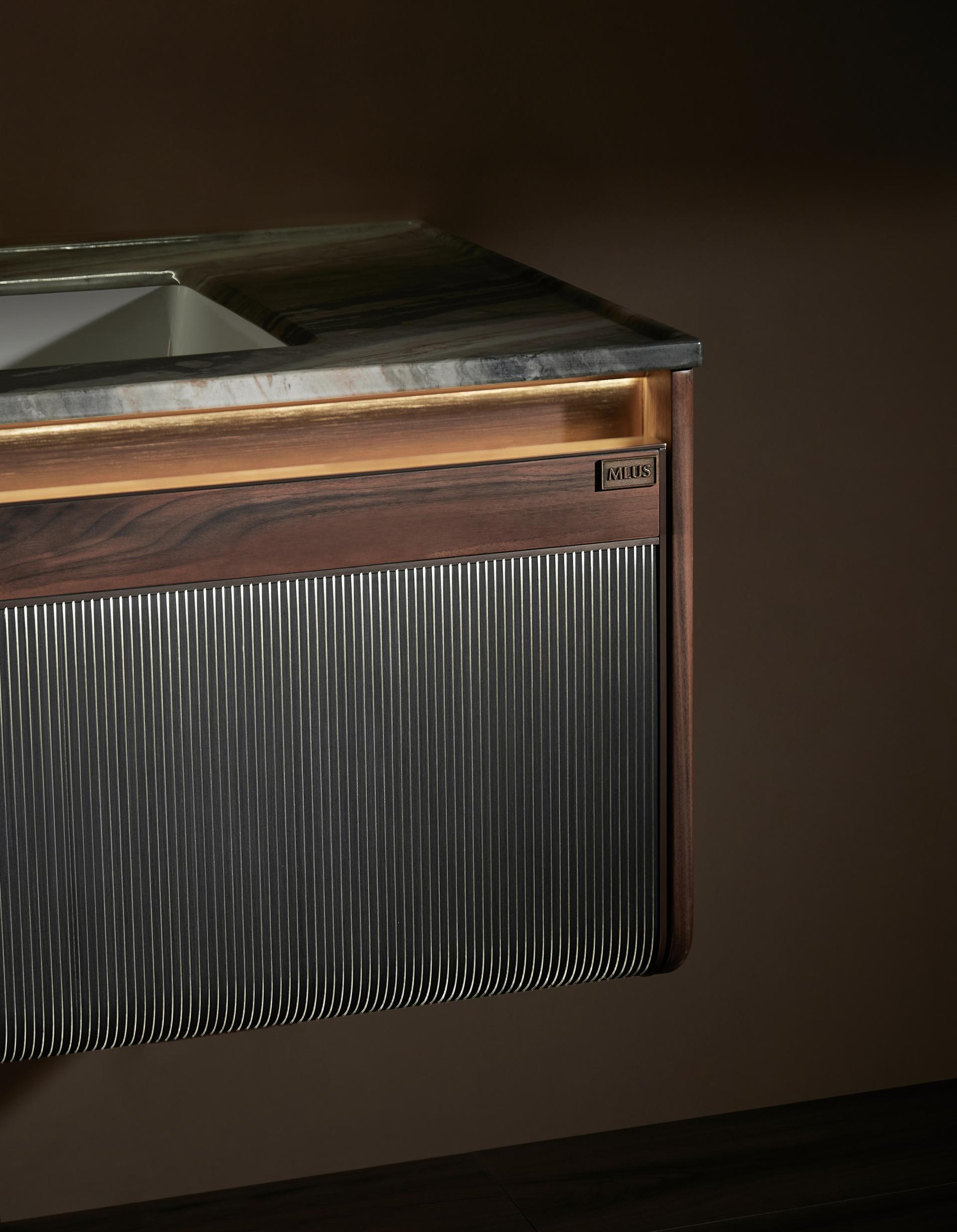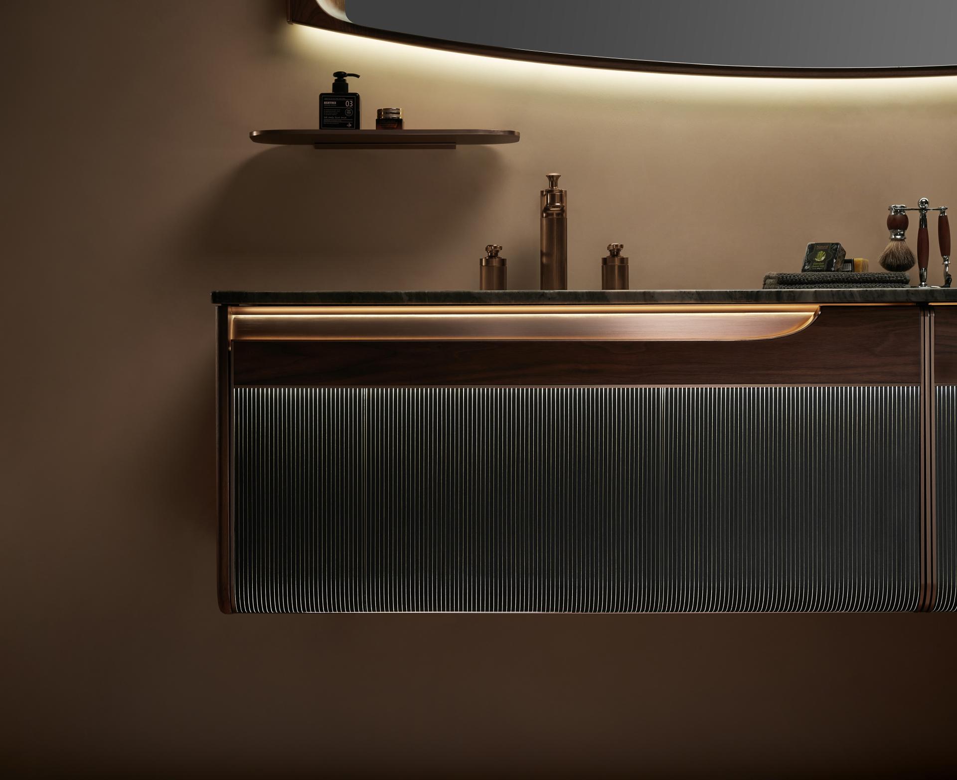 The drawer front features alternating imported wood veneers and acrylic luminous materials, with precise control over line density to ensure optimal light projection, creating a distinctive interplay of light and shadow. Combined with its waterfall-inspired line design and curved cabinet edges, it adds a touch of graceful elegance, making it highly unique and innovative among similar products in the market.