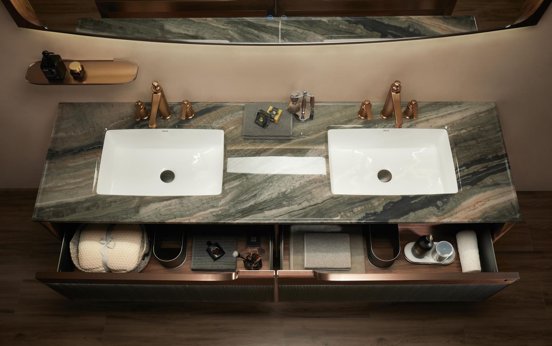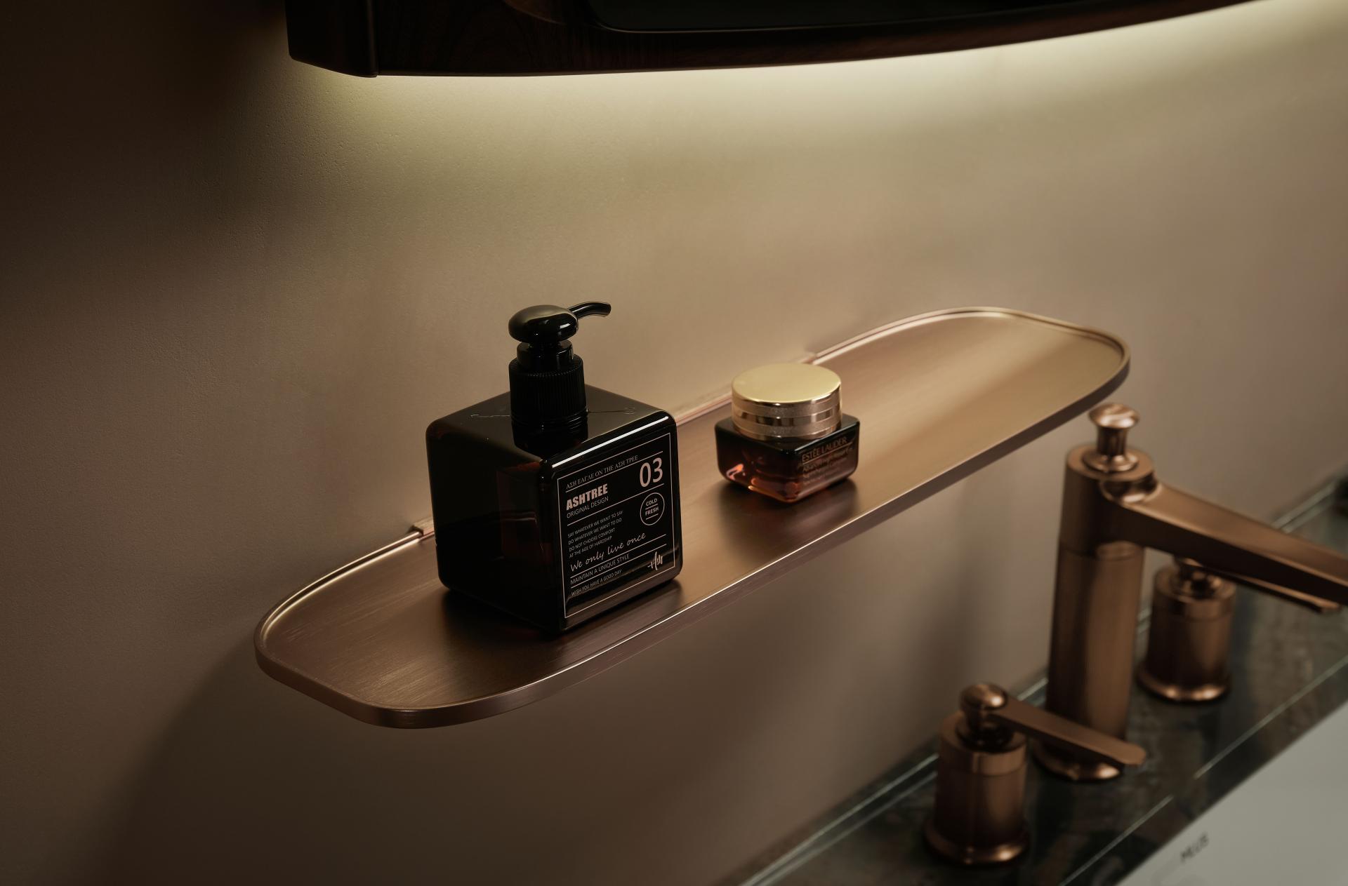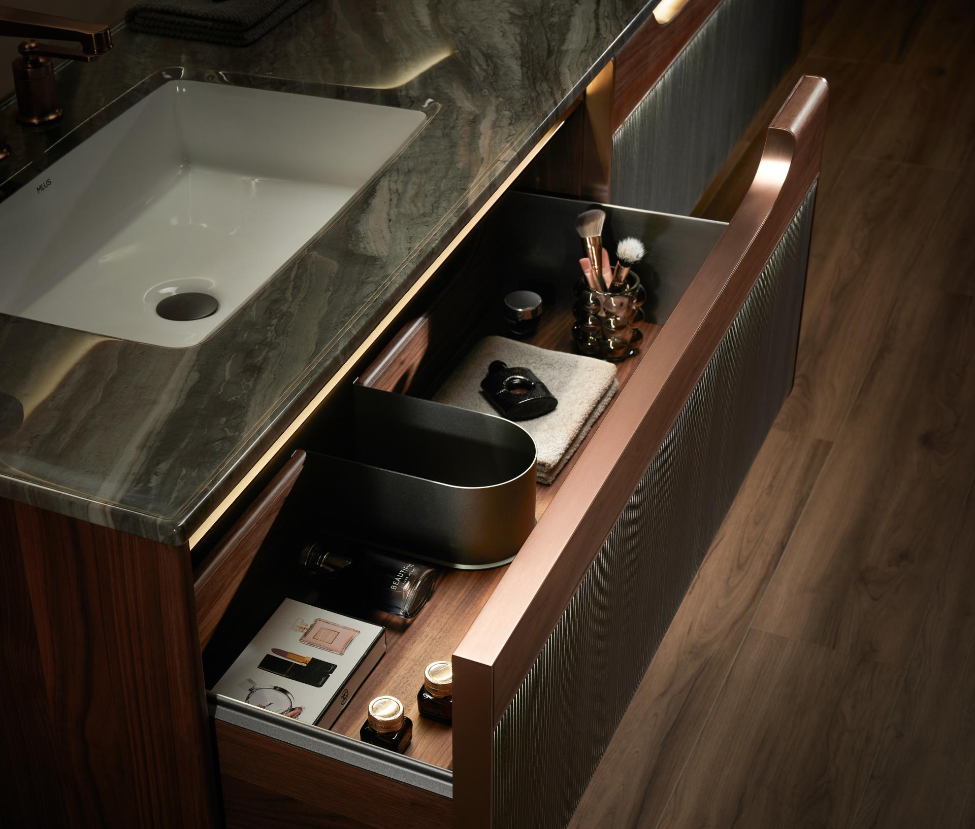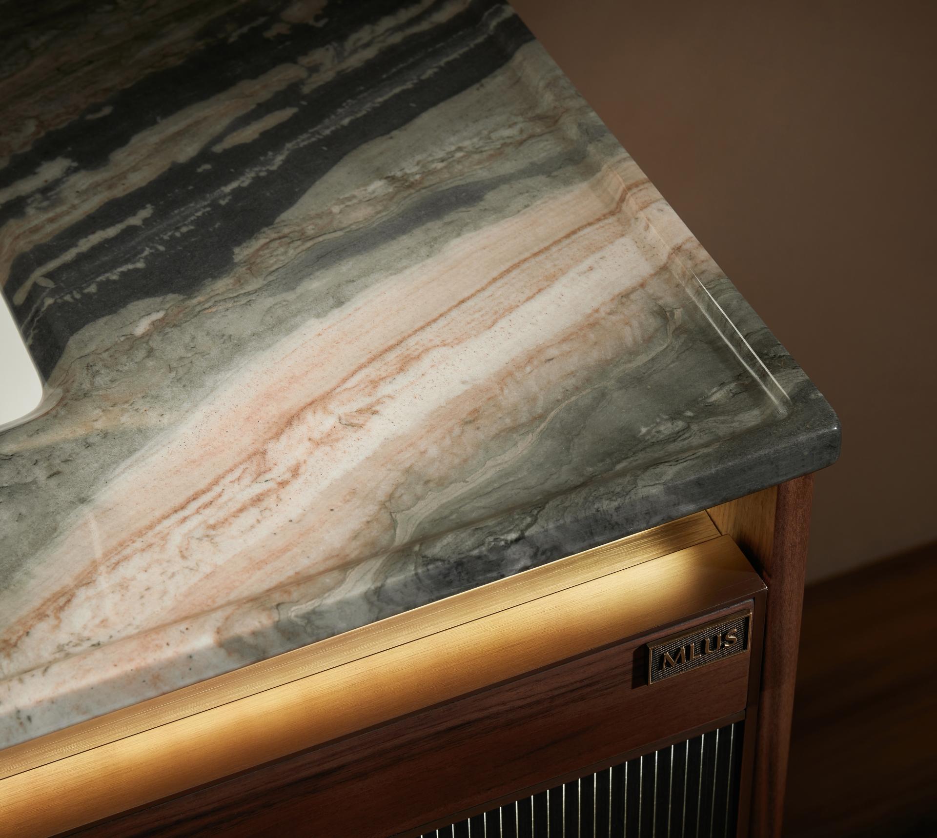 The drawer front features alternating imported wood veneers and acrylic luminous materials, with precise control over line density to ensure optimal light projection, creating a distinctive interplay of light and shadow. Combined with its waterfall-inspired line design and curved cabinet edges, it adds a touch of graceful elegance, making it highly unique and innovative among similar products in the market.