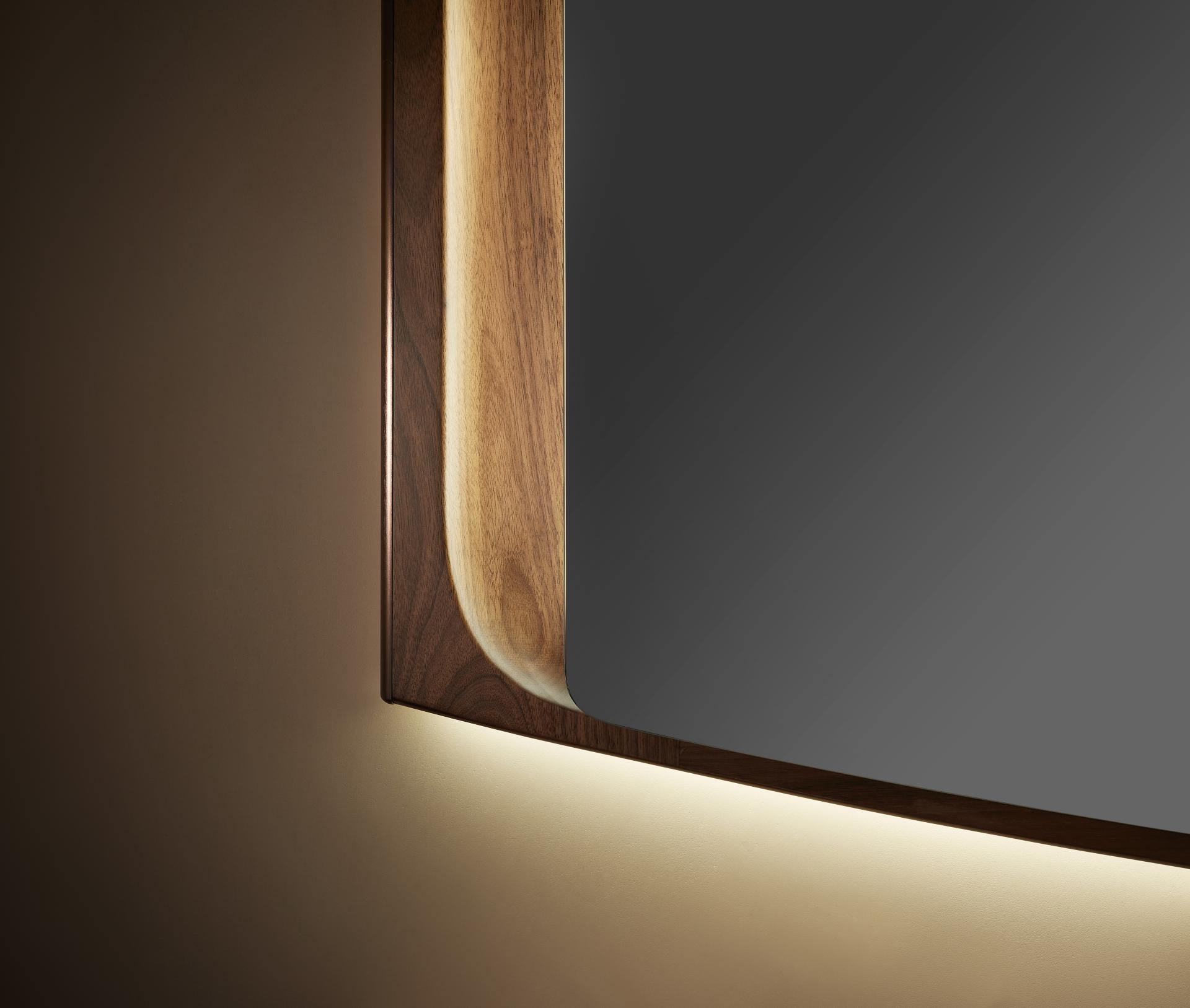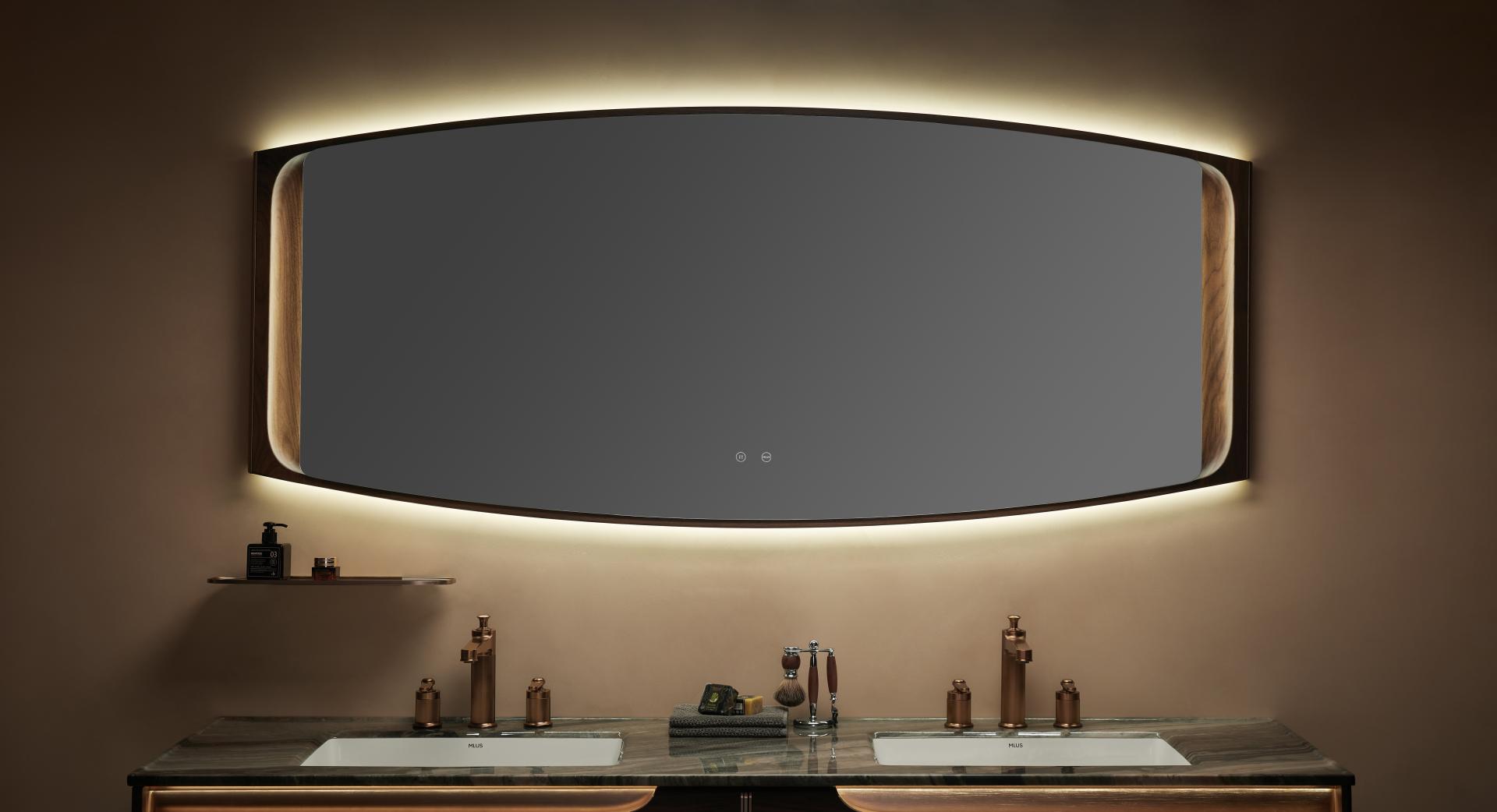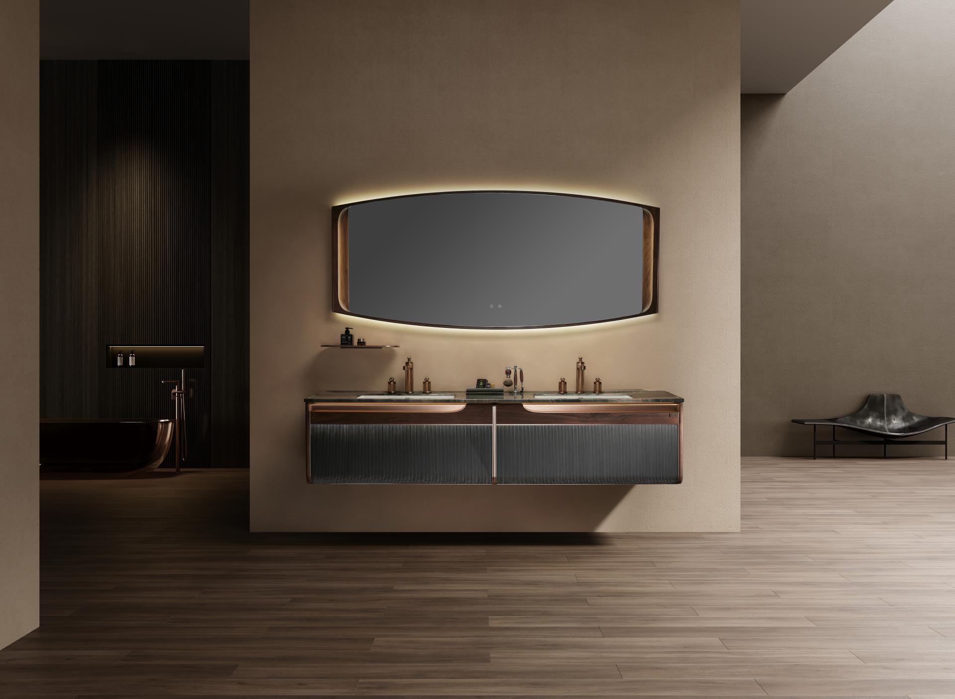 Crafted with an integrated metal handle and precision-milled grooves, the design exudes modern simplicity. The illuminated mirror, framed in walnut wood, adds layers of sophistication, offering a soothing experience with its “light without glare” concept. A minimalist shelf complements the setup, merging rustic charm with refined elegance.