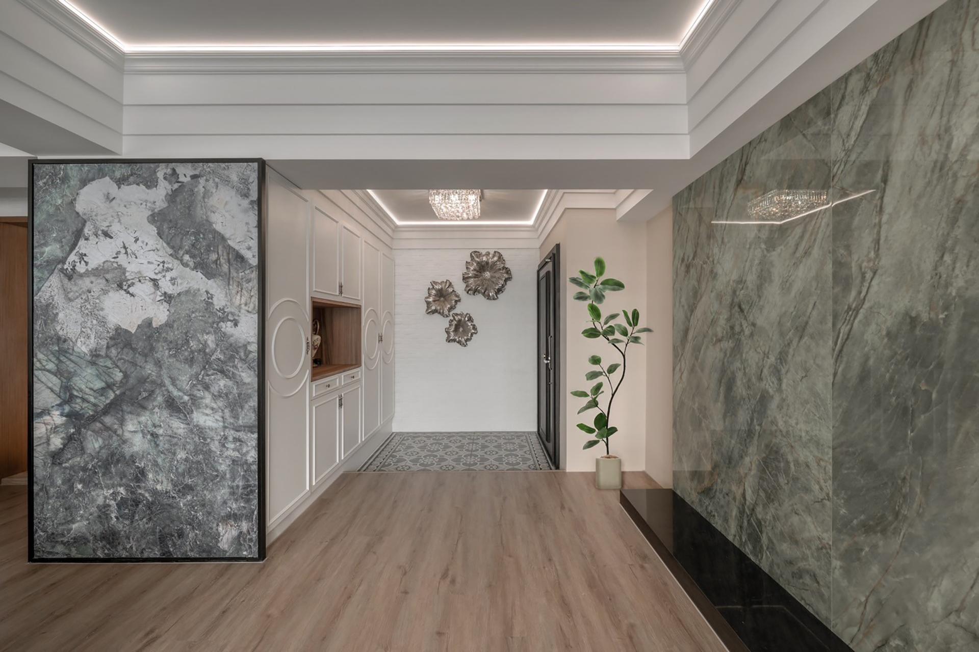 In terms of spatial planning, the designer maximized natural light through an open plan, enhancing the sense of openness. A thoughtfully designed display wall serves as the perfect stage for showcasing the homeowner’s treasured art collection. For materials, a combination of marble, moldings, and wood adds depth and warmth, ensuring the space exudes both artistic elegance and a welcoming atmosphere.