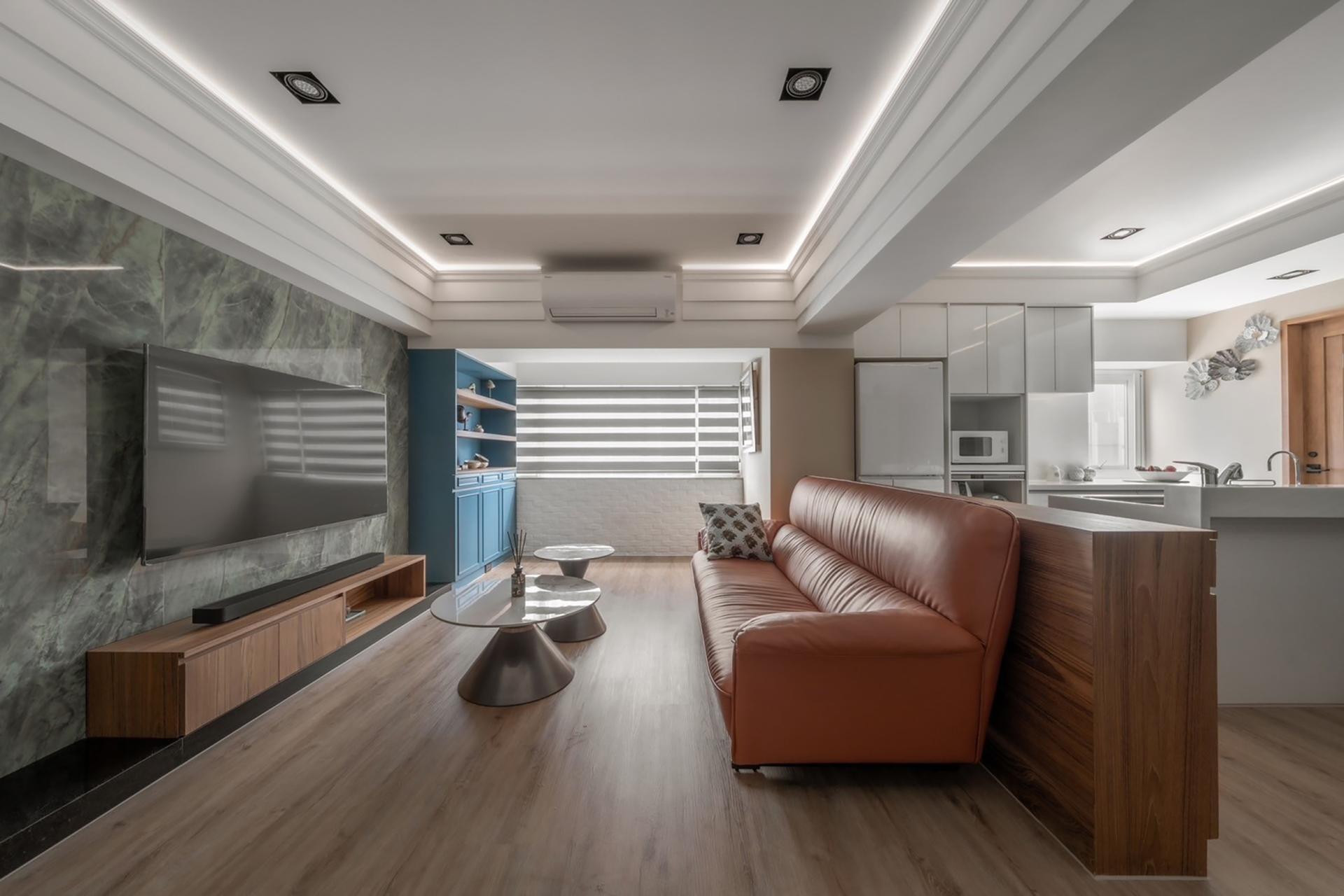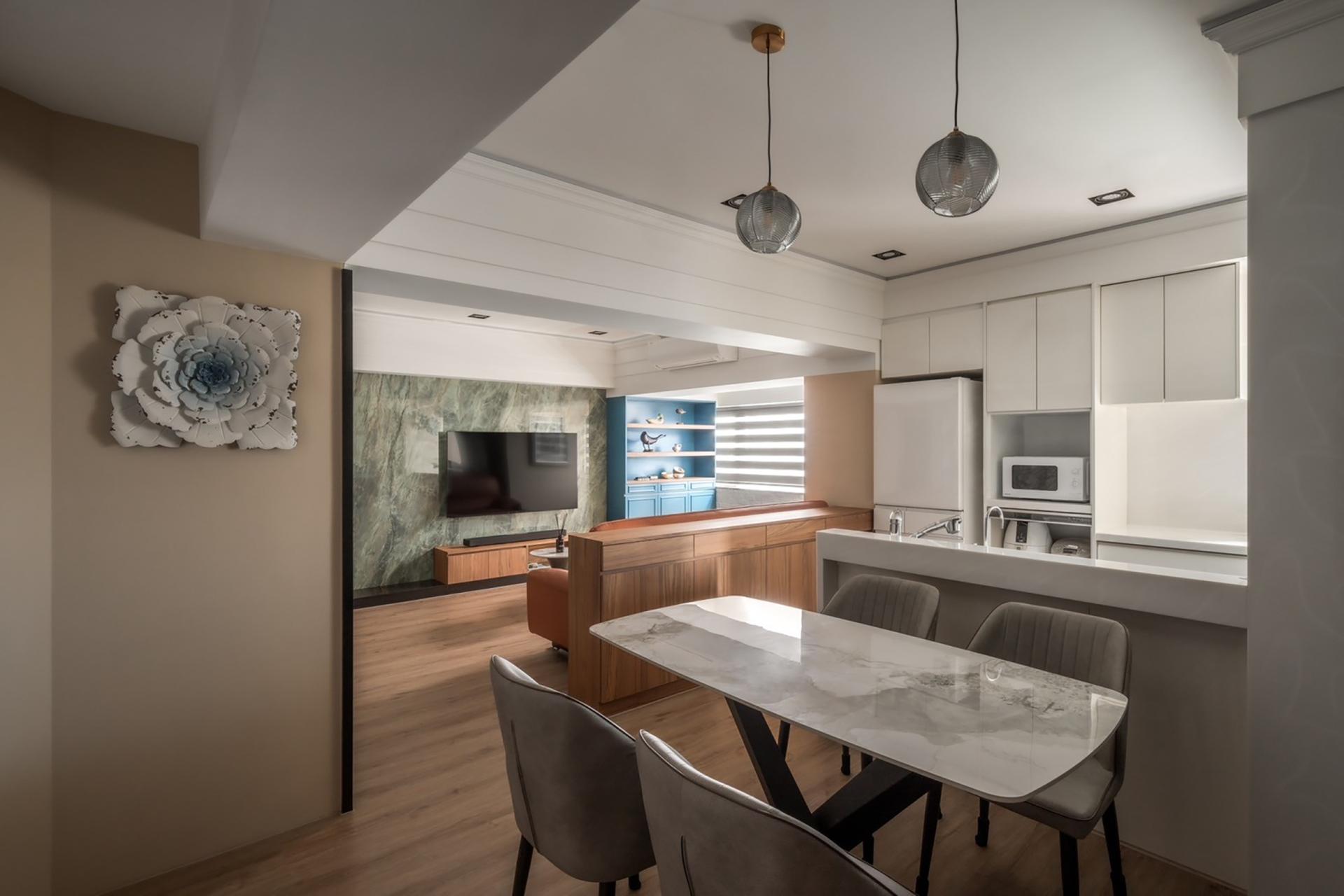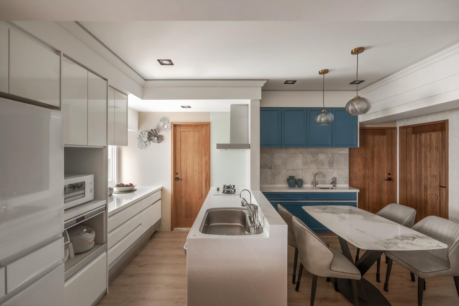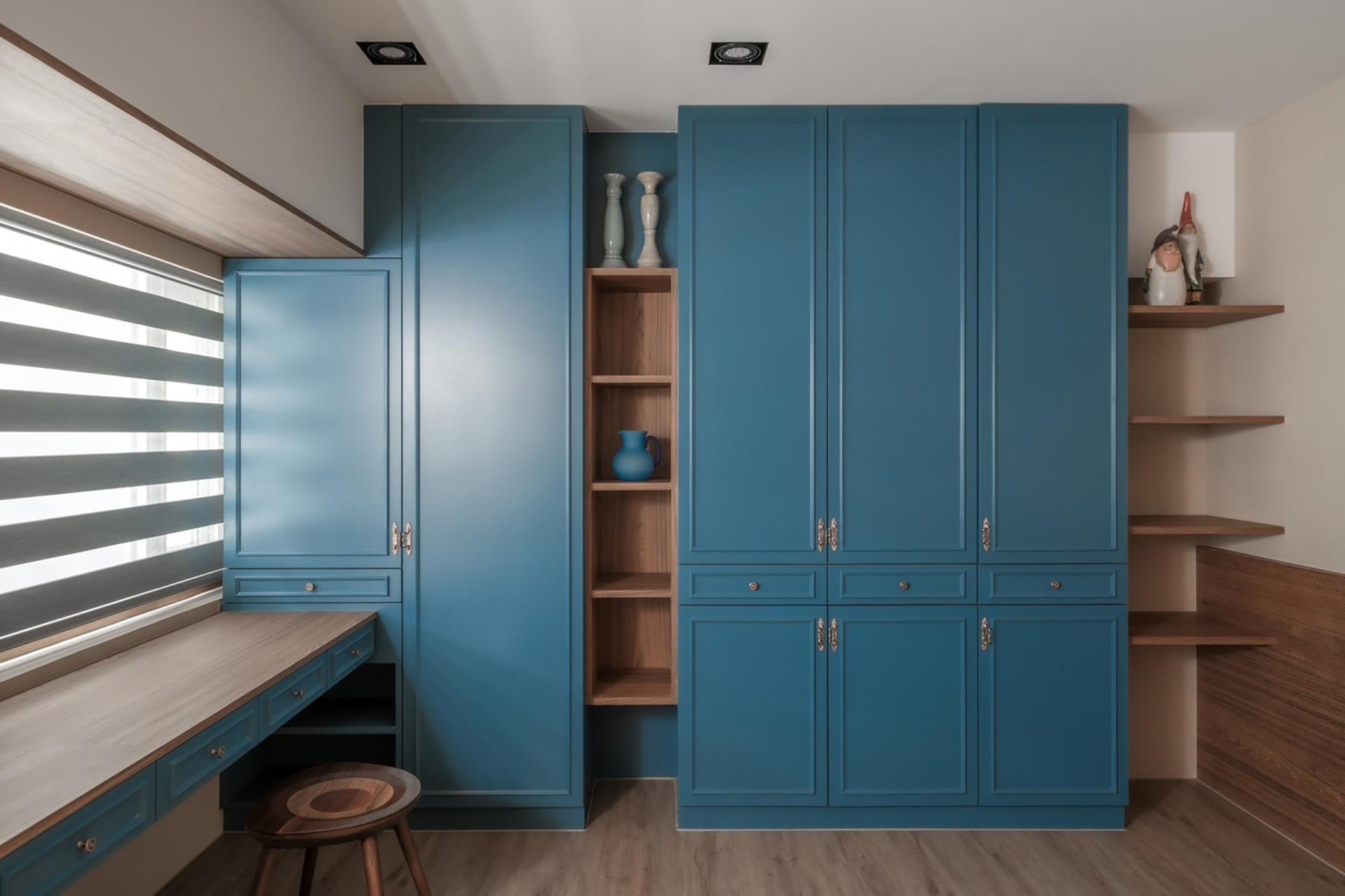 The primary color theme of the project is peacock blue, which is strategically applied throughout the living room, kitchen, and study. Much like the vibrant display of a peacock’s plumage, this strong hue creates a sophisticated and artistic atmosphere. The layering of colors allows the historic essence of the old building to intertwine with the functionality of modern living.