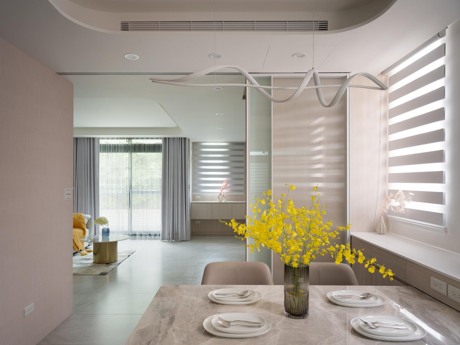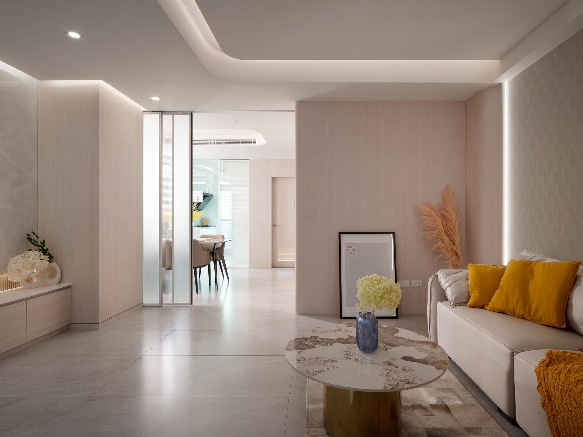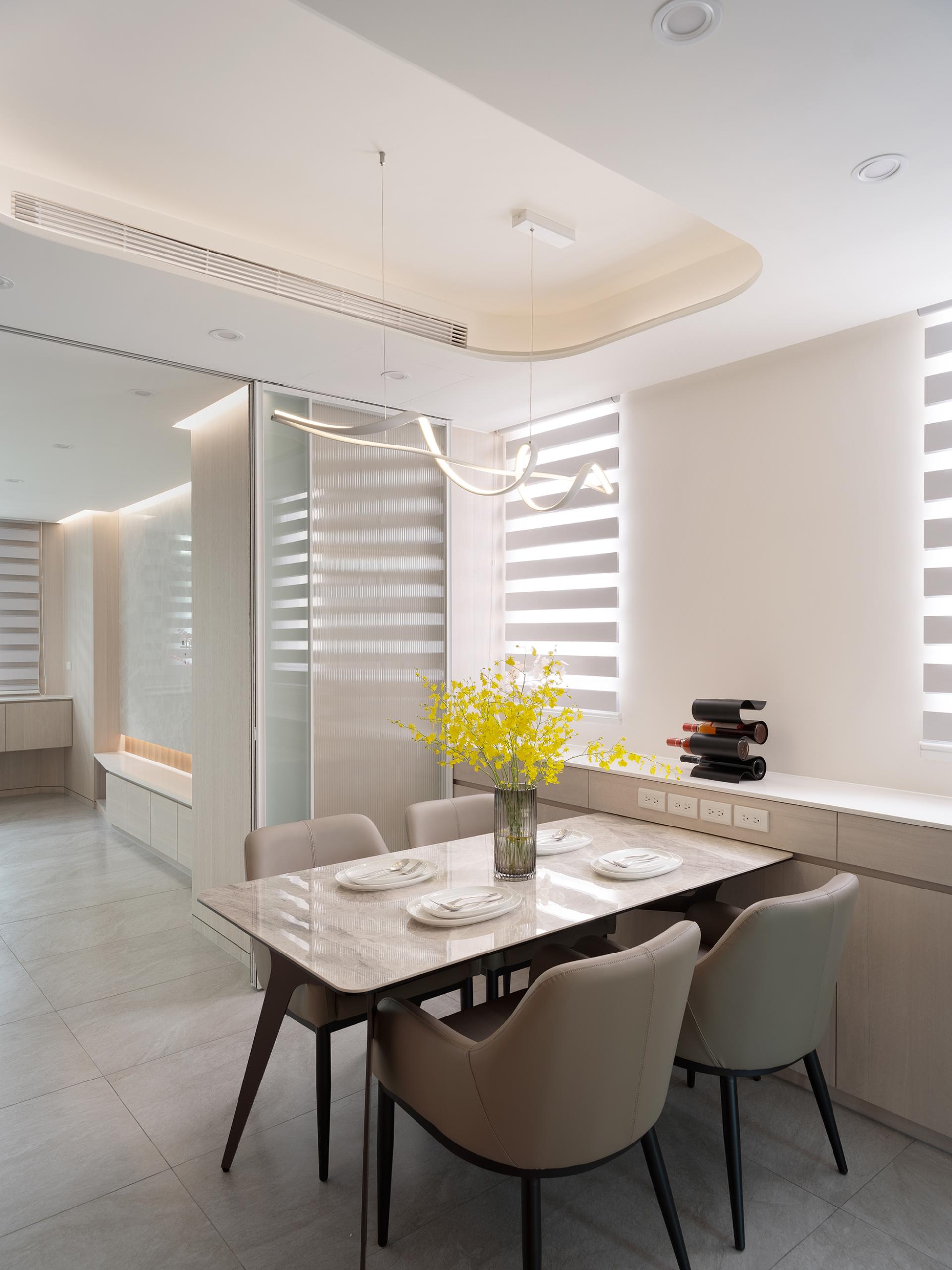 The interior designers skillfully utilize arched elements to adorn columns, corners, and ceilings throughout the design. Paired with indirect lighting, the curved transitions beautifully diffuse gradients of light and shadow, allowing one’s gaze to naturally follow the arc, seamlessly connecting the living room, dining area, and kitchen. This creates a warm atmosphere conducive to family gatherings. The design incorporates concealed air conditioning and maintenance access, making future upkeep more convenient, with vents cleverly hidden within the ceiling.