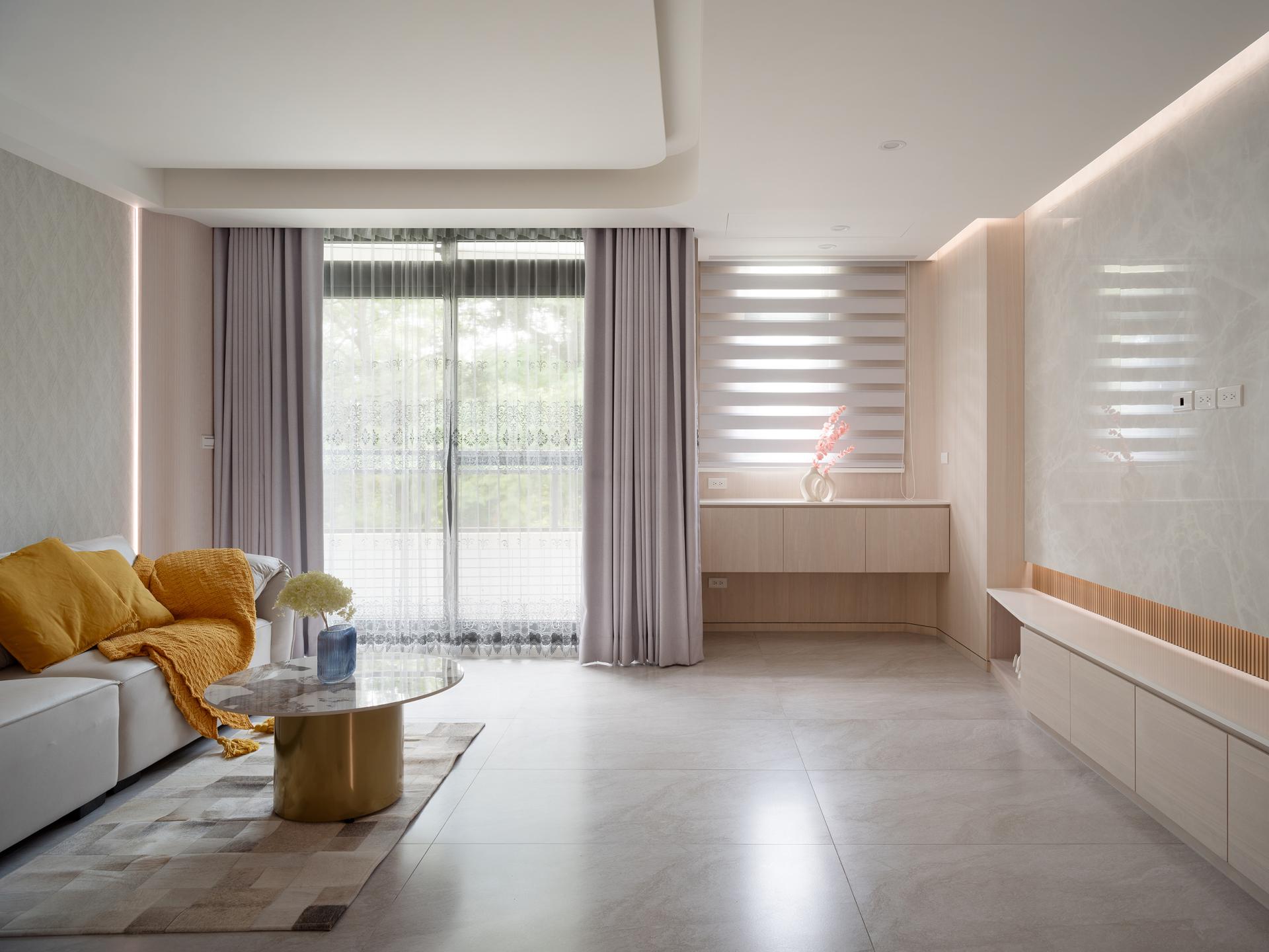 The main visual, the TV wall, is covered with thin, light-reflective surface tiles. This not only simplifies the maintenance of the stone but also reduces the carbon footprint during construction with its lightweight. At the same time, it preserves the delicate texture of the stone. Space is also reserved between the sofa and the television to accommodate a massage chair in the future, enhancing the lightness and ease of the living rhythm.
