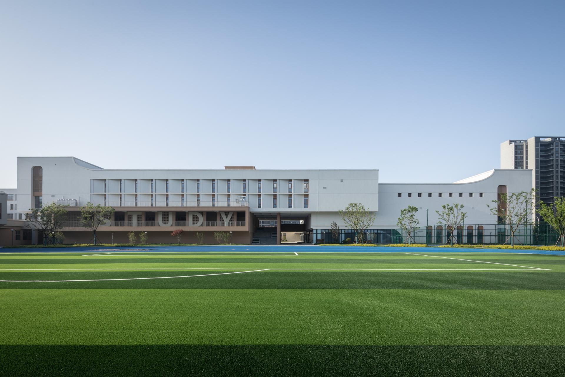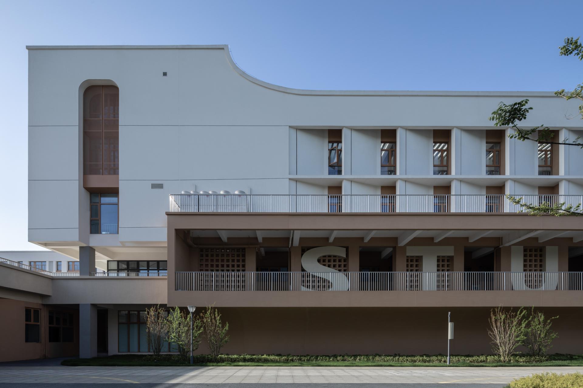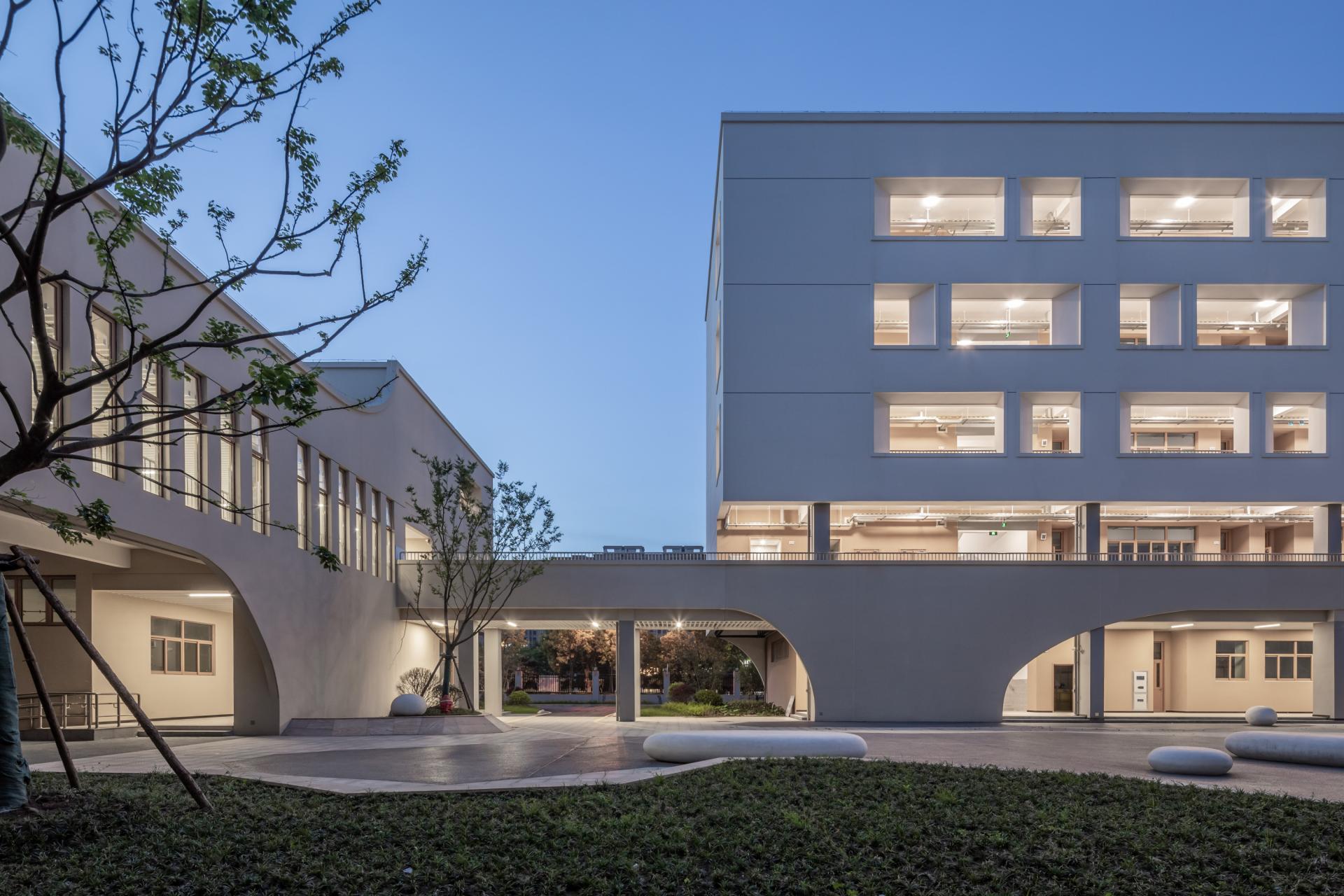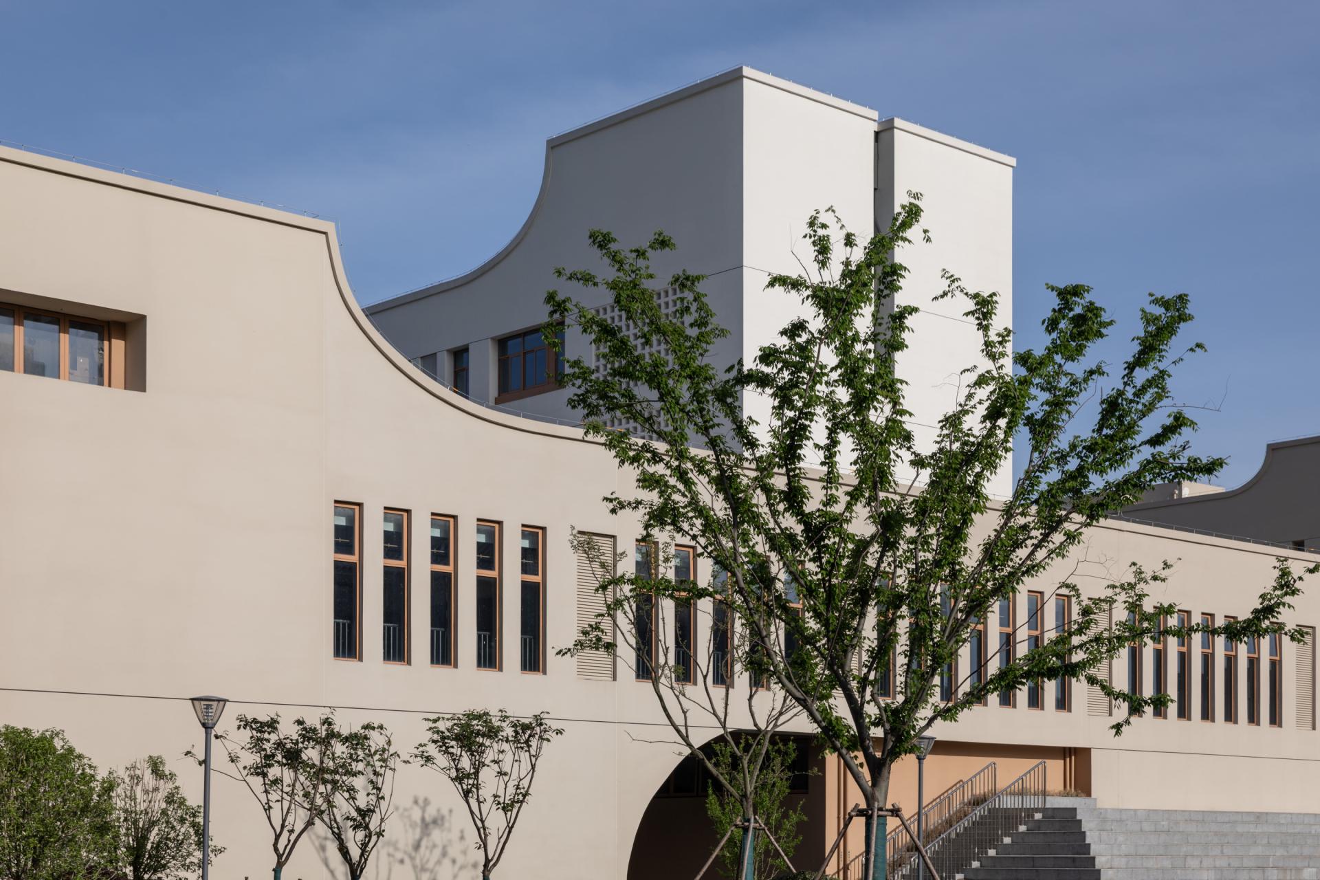 The entire school is clearly divided into two zones, dynamic sports zone on the west side and static teaching zone on the east side, which are separated by an L-shaped public activity platform in the center. Specialized classrooms are arranged on the ground floor of the east teaching zone, and standard classrooms are arranged on the second floor and above to meet the sunlight requirements. Other public teaching rooms such as culture & sports, calligraphy & painting, are arranged around the courtyard to form a teaching center with various education features.