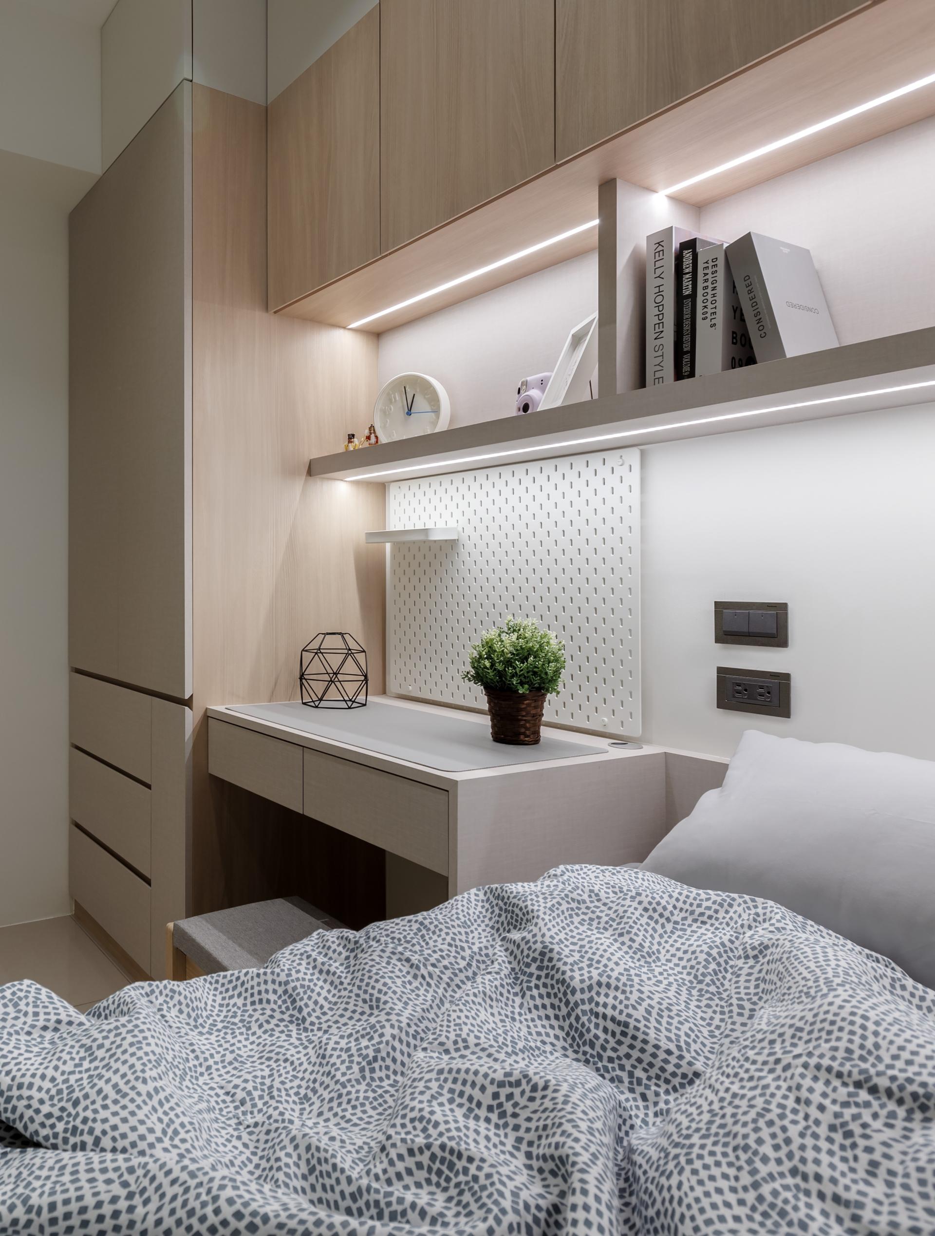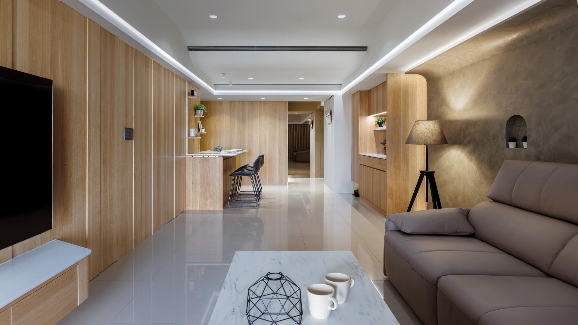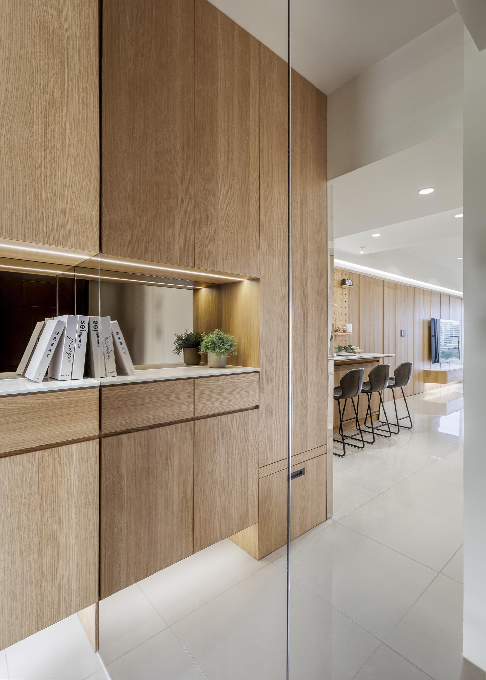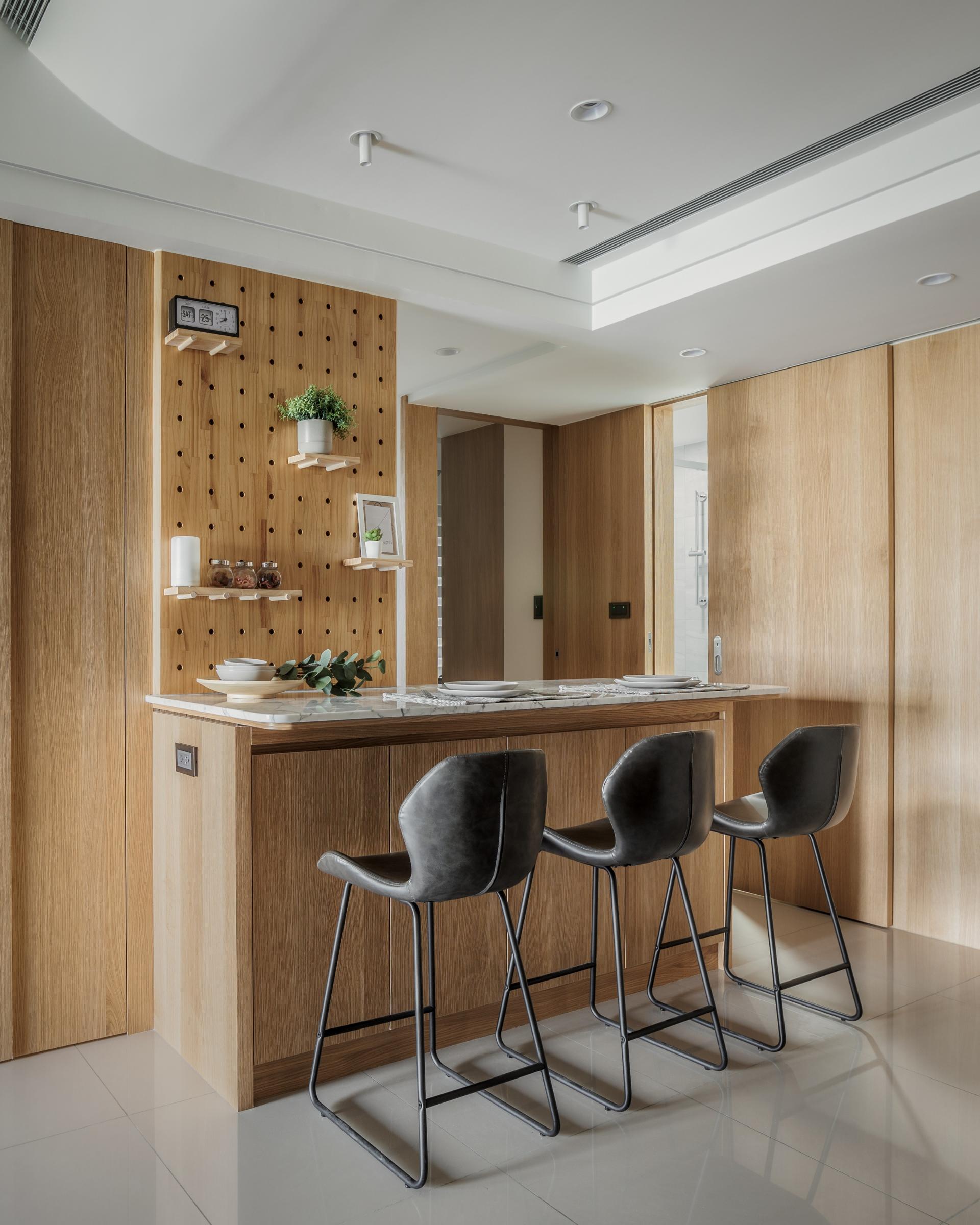 Designed with thoughtful attention to detail, the project addresses the narrow, elongated entry foyer by incorporating tea-tinted glass wall panels, which enhance the sense of spaciousness through reflections and light play. Features such as motion-sensor lighting and a press-to-open shoe bench add both practicality and a touch of elegance. To foster family interaction and maximize spatial efficiency, the original galley kitchen layout was opened up and connected to a high dining counter, replacing a traditional dining room. This setup not only enhances storage and workspace but also extends the depth and layering of the public area. A stone countertop with perforated pegboard backing offers a dynamic display area for decorative items and plants.