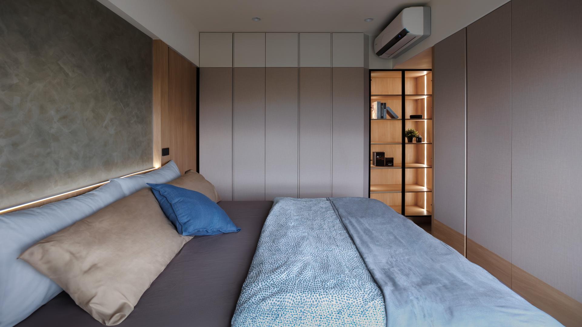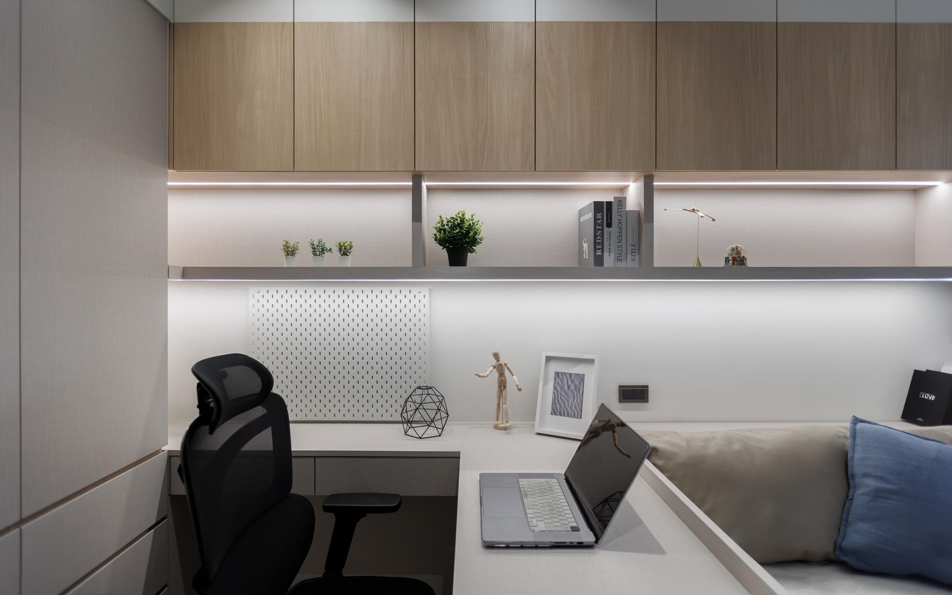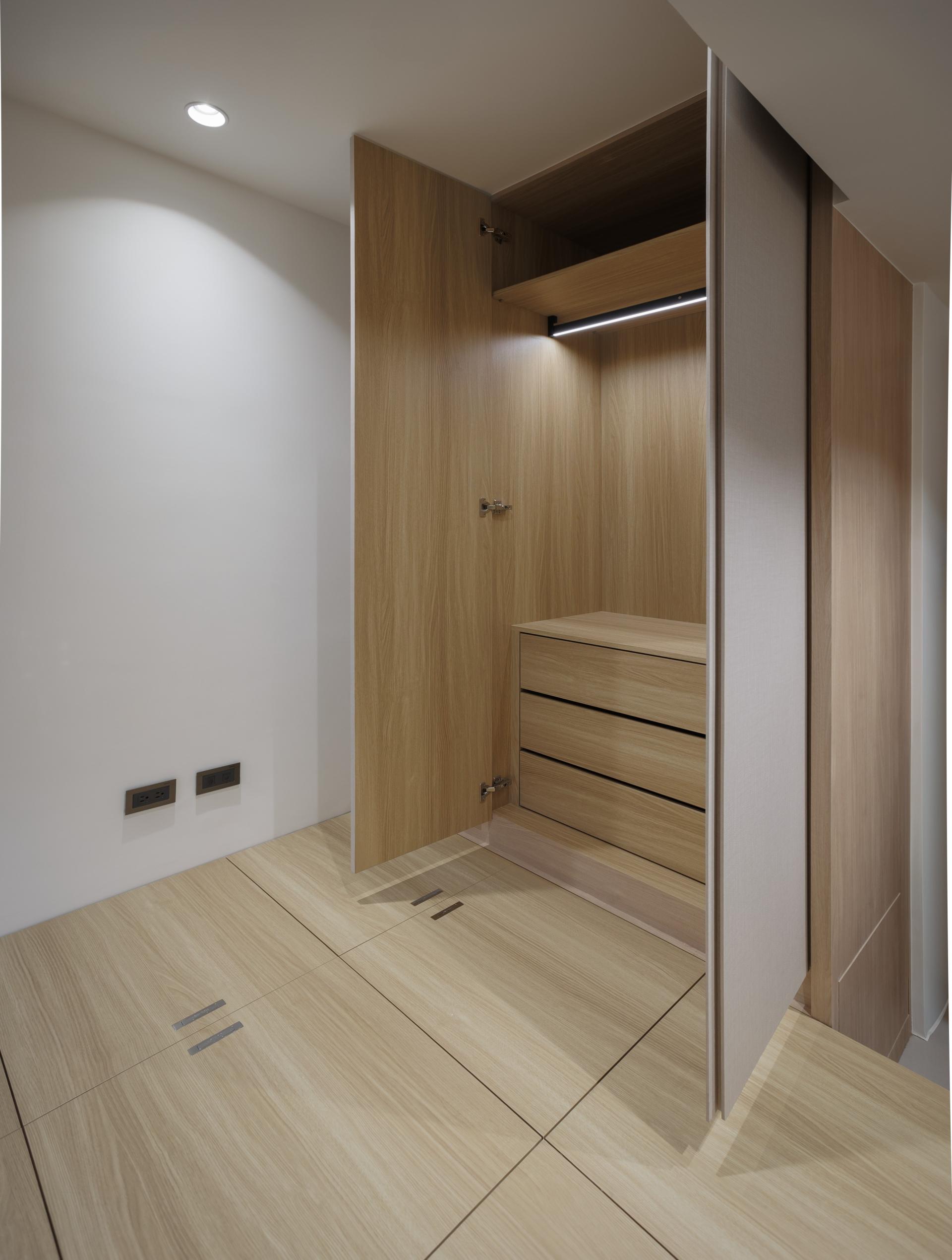 In the private quarters, custom storage solutions and functional layouts were tailored to the proportions and needs of each space. The master bedroom includes separate, spacious wardrobes for him and her, while the two children’s bedrooms are optimized with precise calculations for desks, beds, and closets. The guest room features a raised platform floor with abundant storage space beneath, ensuring practicality without compromising aesthetics.