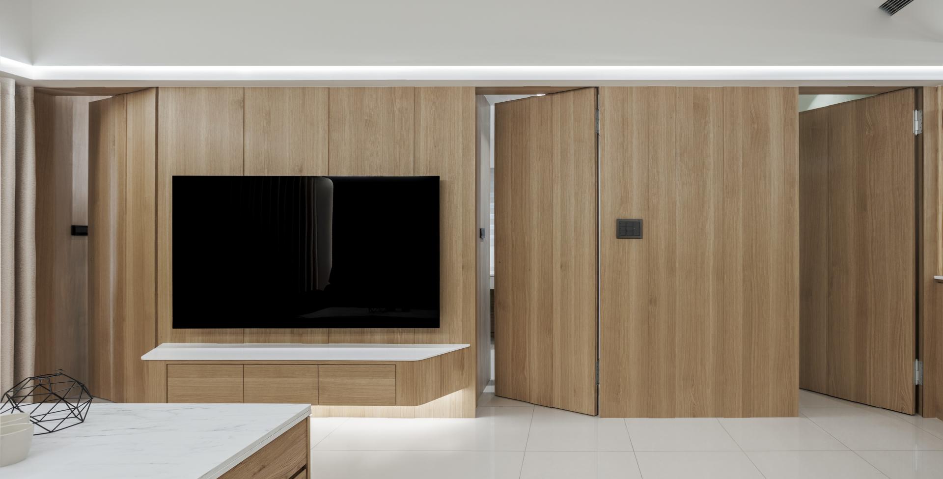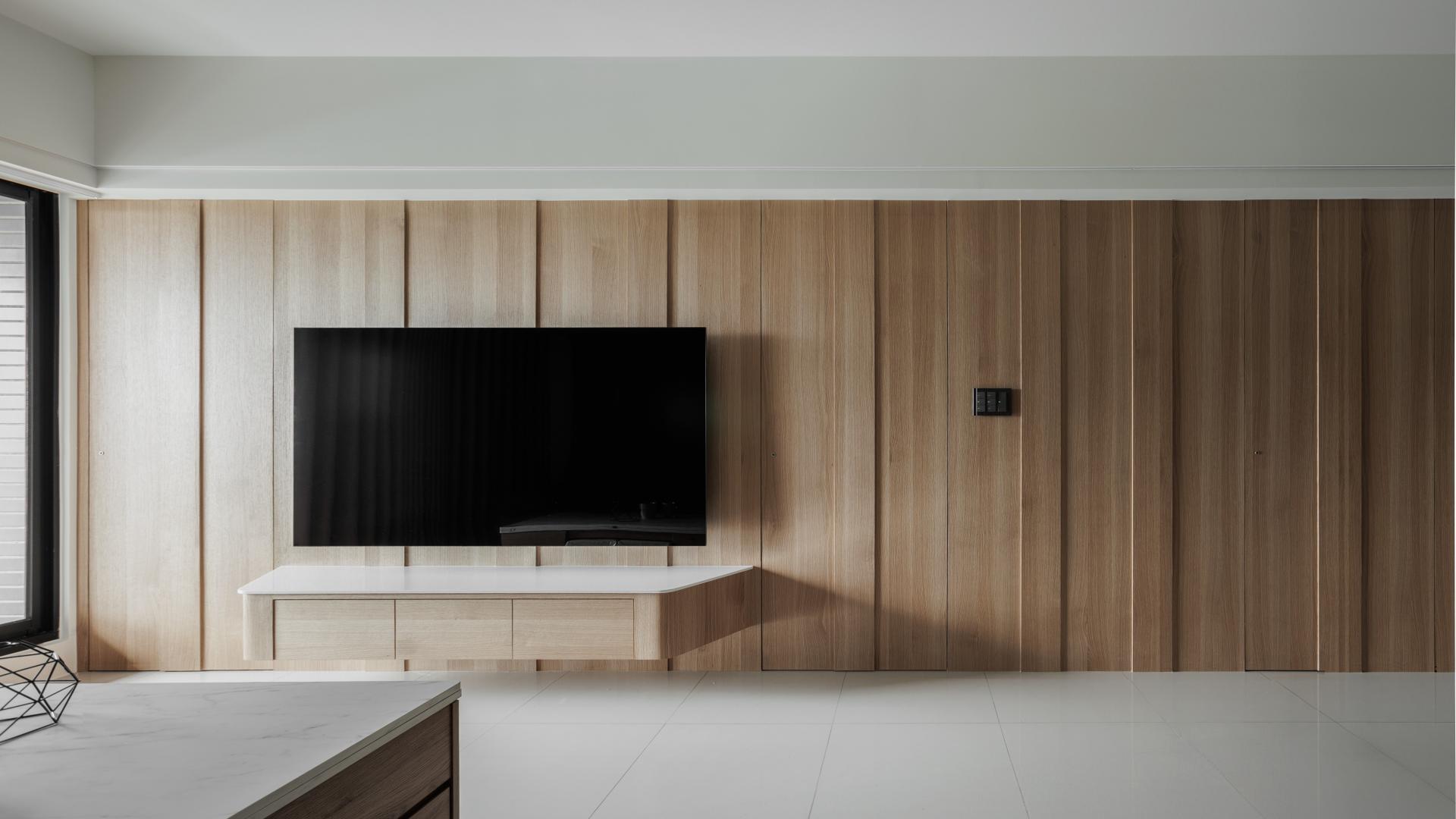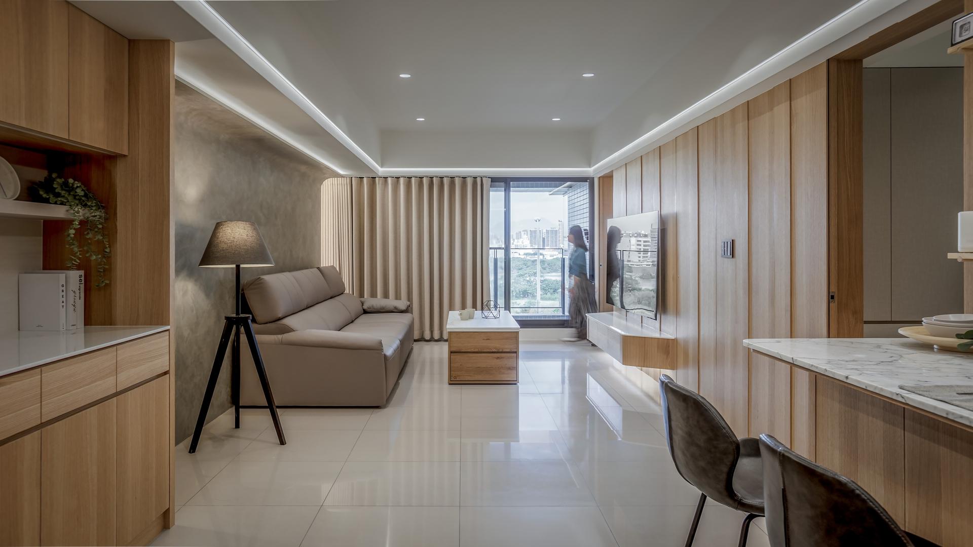 The open-plan living room and dining area features a functional sequence of elements: a multifunctional tall cabinet, a piano, and an L-shaped sofa, accentuated by recessed edge lighting. The sofa back wall is defined by a handcrafted, curved plaster design that elegantly conceals the beams, creating a cozy gathering space for family activities. The minimalist TV wall emphasizes safety and style with a low-mounted, wall-hung cabinet featuring curved corners. The expansive wooden paneling, punctuated by irregular vertical grooves, adds a rhythmic sense of movement while cleverly concealing the entrances to three bedrooms.