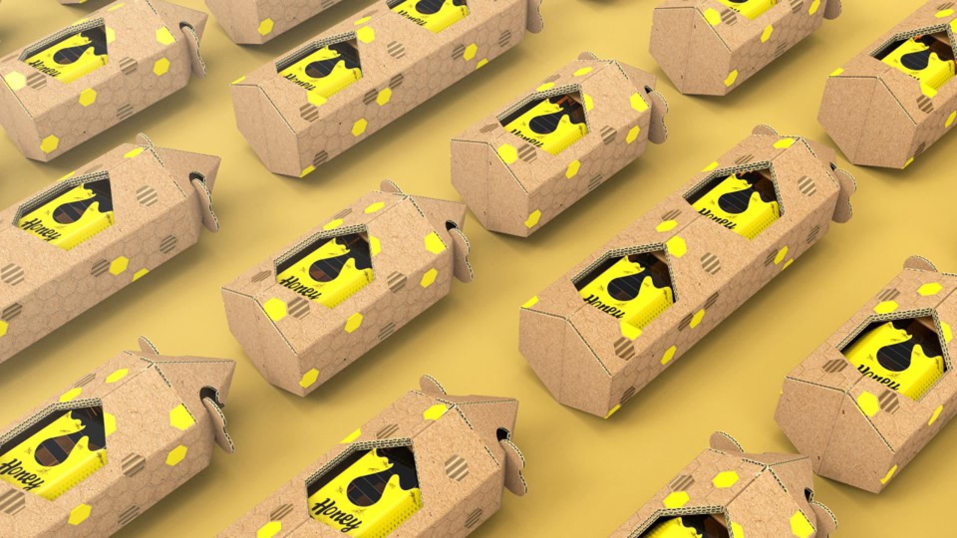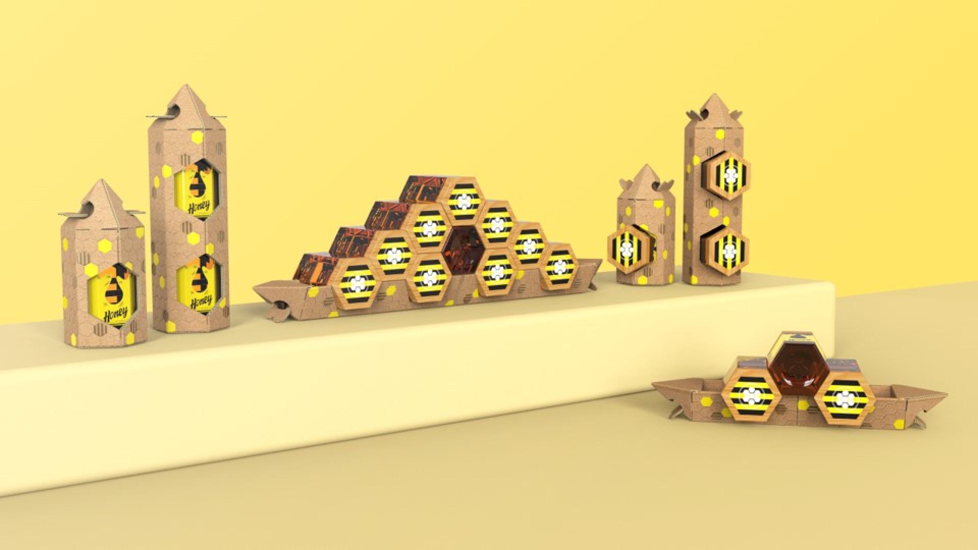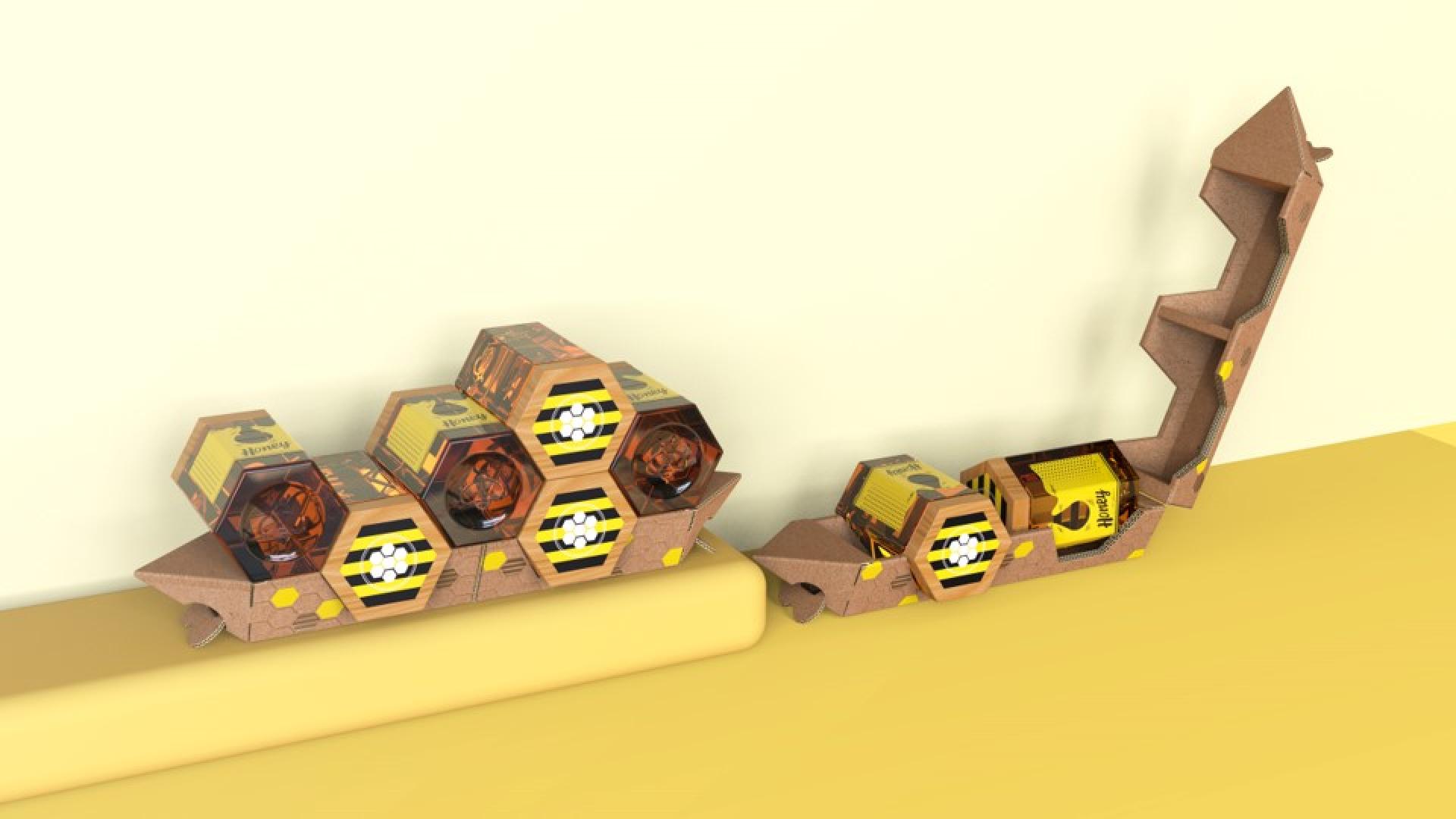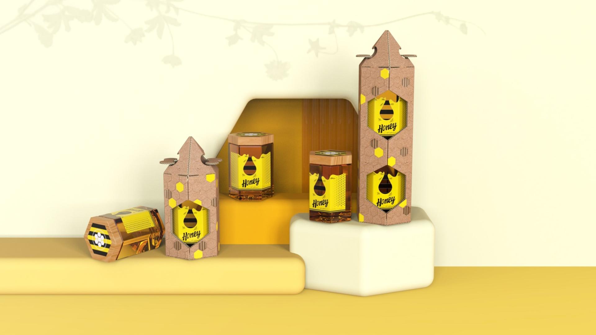 The packaging box design combines multiple display methods, allowing it to be showcased upright or stacked flat, catering to various display needs. Notably, the box features a convenient handle inspired by honeybee wings, reflecting the natural elements of honey while adding a playful and unique touch to the packaging.