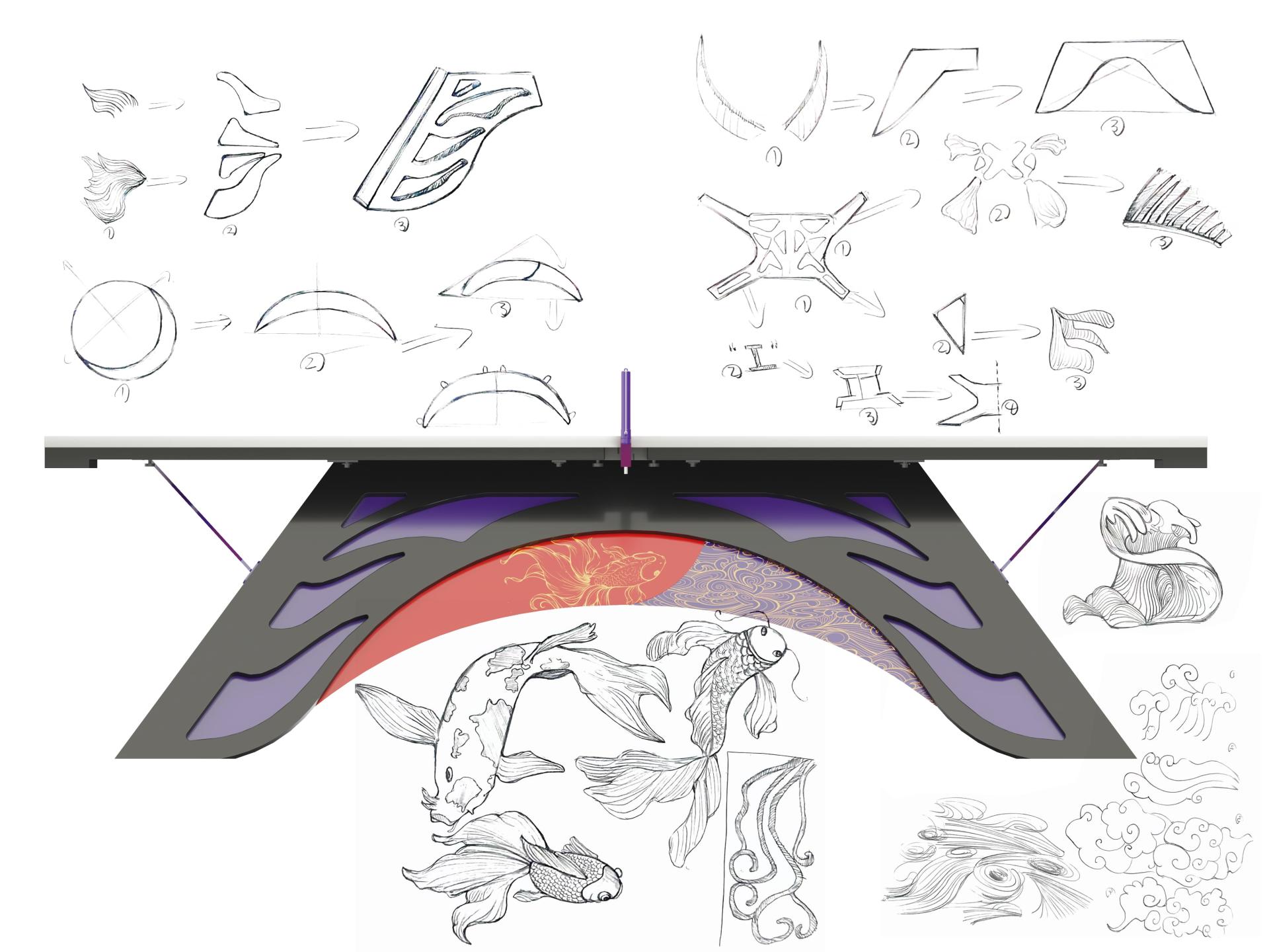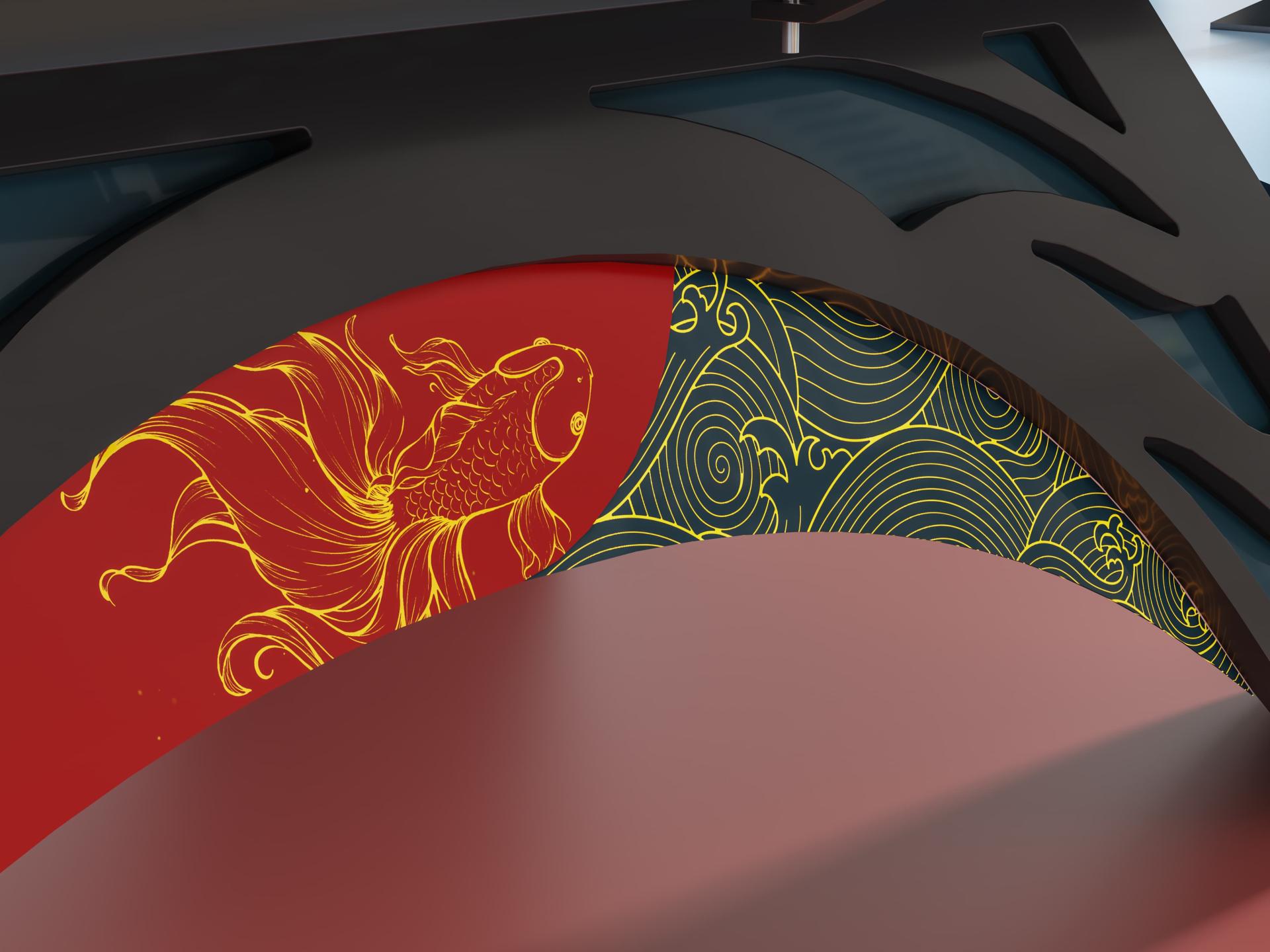 The koi fish, a symbol of good fortune, symmetrically coordinates with cloud and wave patterns, balancing visual differences. Through screen printing, the koi's vivid form embellishes the side crescent boards, infusing life. The cloud pattern, signifying auspiciousness and progress, adorns the tabletop or side boards. Screen-printed with pearlescent gold, it creates an illusory competitive ambience.