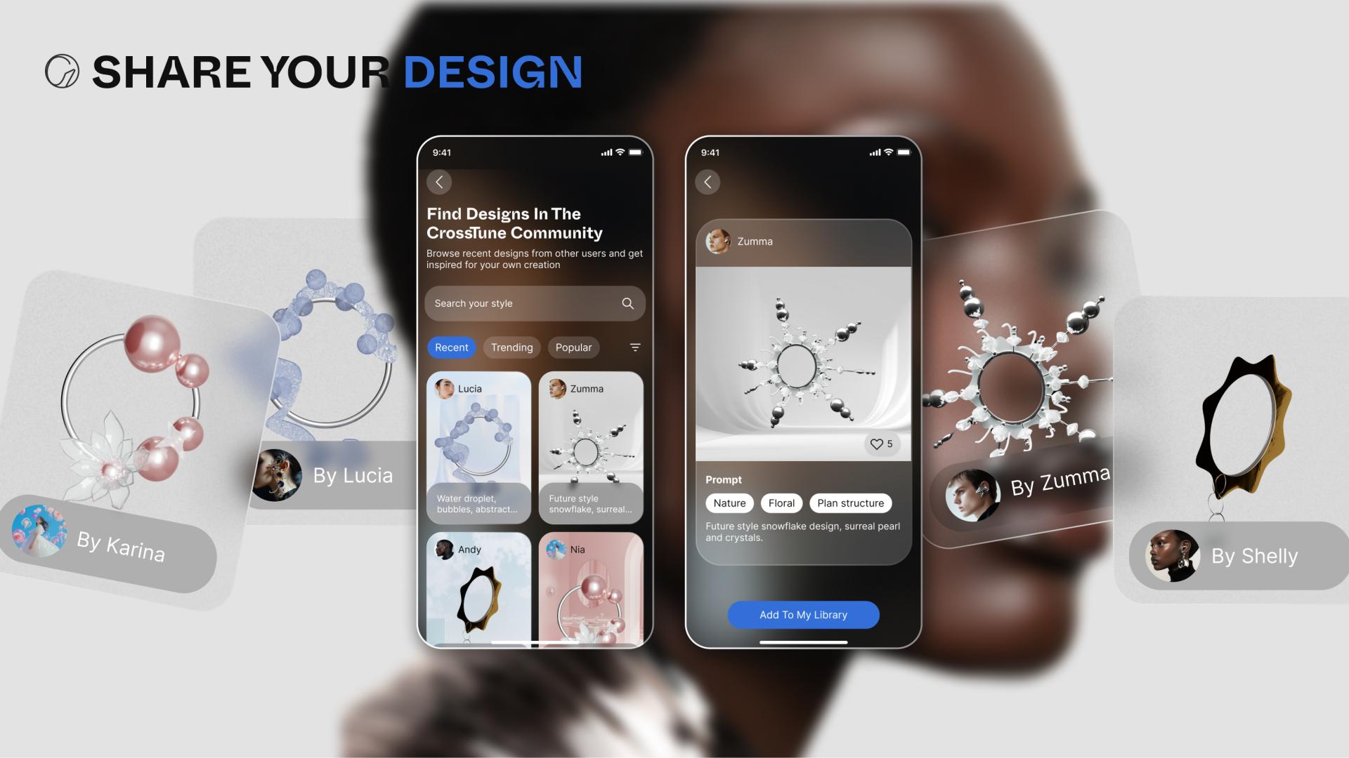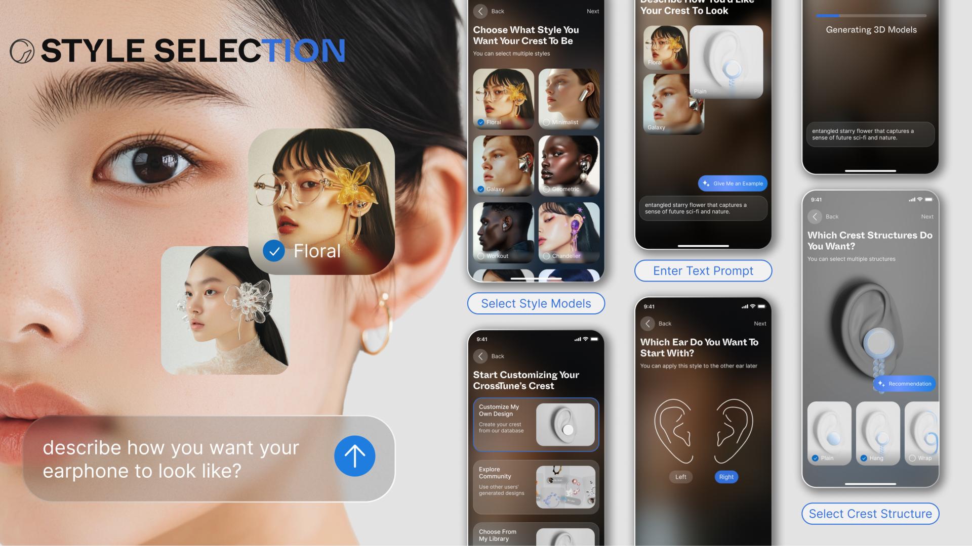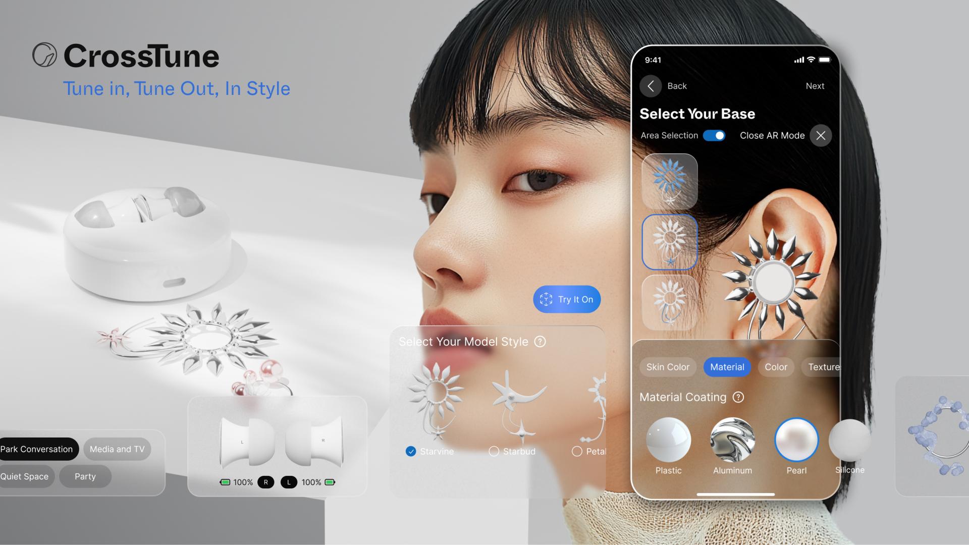 Wearing hearing aids or hearing-enabled earphones often feels restrictive, amplifying stigma and limiting self-expression. CrossTune transforms hearing devices with modular, AI-powered generative 3D designs, inviting users—both those with hearing impairments and those seeking bold fashion—to style and personalize their devices. CrossTune’s mission is to promote hearing health and celebrate universal accessibility—all while embracing a bold sense of style.