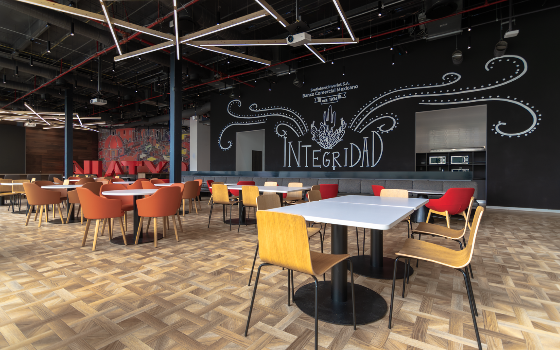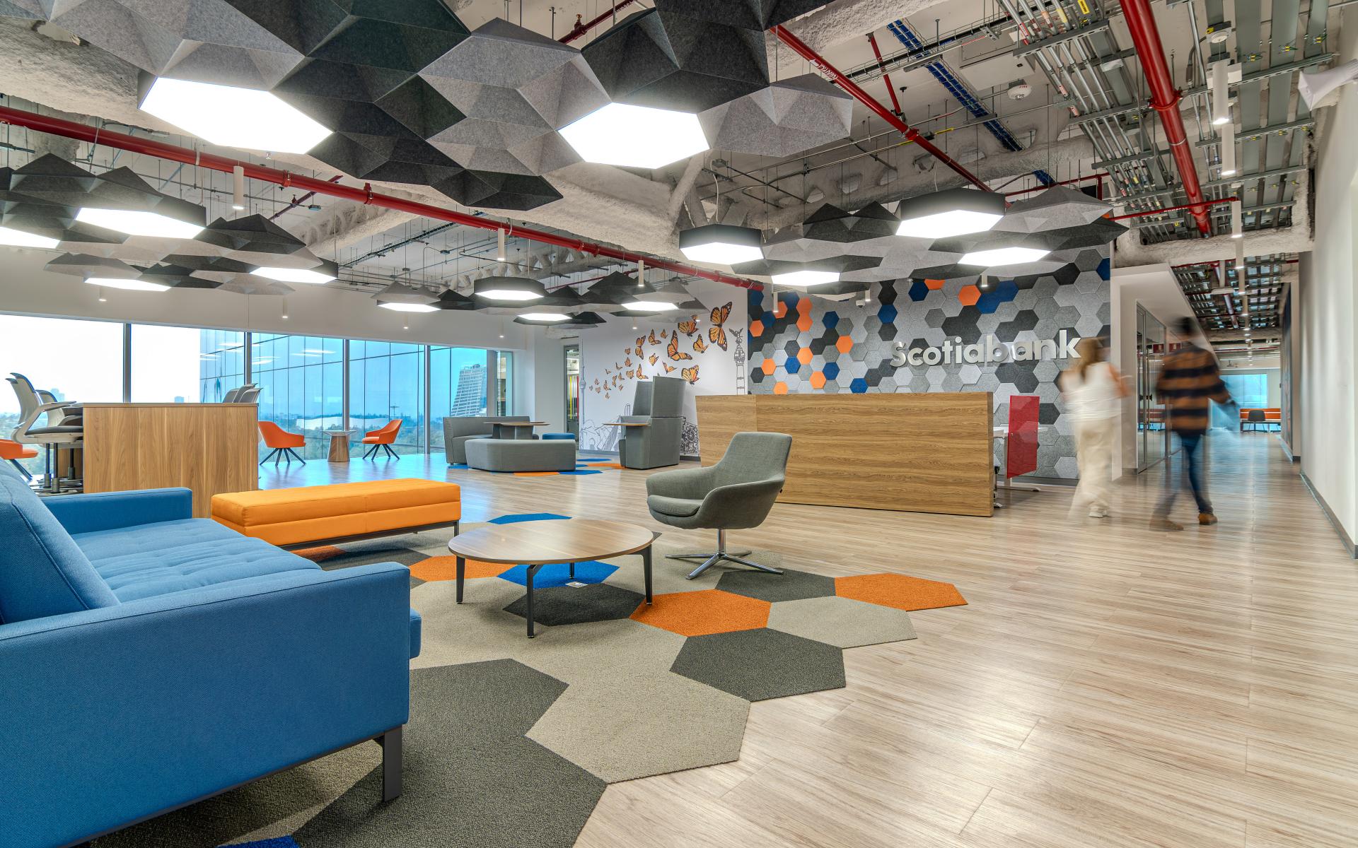 The corporate interior design of Scotiabank achieves the efficient use of open spaces, offering a serene and orderly atmosphere, making it perfect for a high-level corporate environment. The organization will increase its value worldwide, channelling its philosophy with the fusion of organization, teamwork and communication, in an open, welcoming and functional environment in constant interaction with leaders, in addition to ensuring that partners enjoy a unique working environment that provides learning, personality enhancement and professional development.
