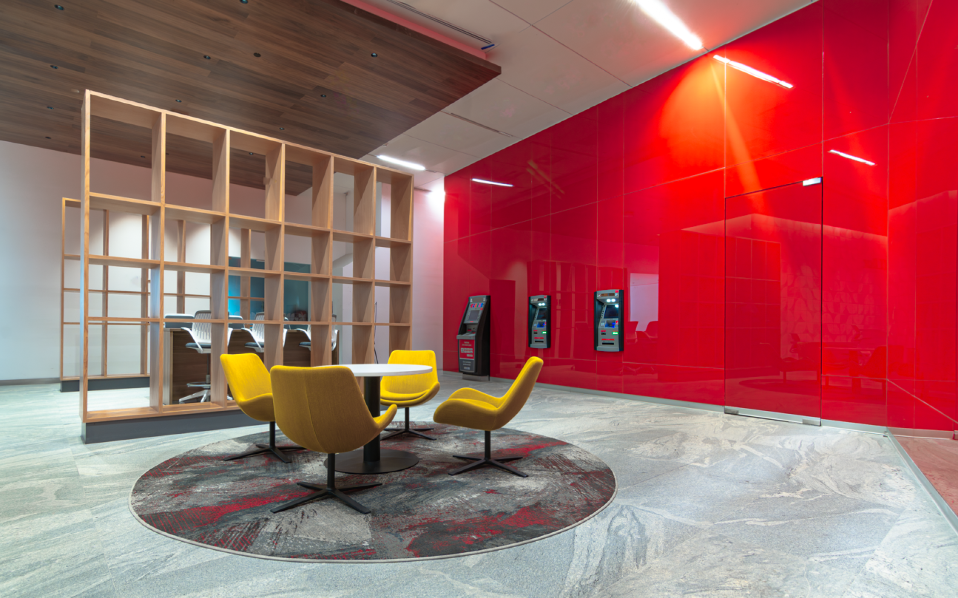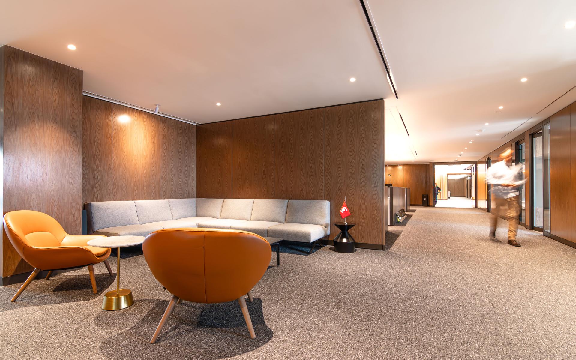 In the design of these offices contemplate the theme sustainable operation includes low energy consumption, light levels below the standard and standardization of materials. The finishings form an integral part of the project, combining them in a way that they complement one another, we reveal marble, carpets, glass, wood and furniture that emphasize the change of the different scenarios. In general warm colors predominate throughout the project but in some key points (walls, columns, carpets) bright tones were used according to a chromatic palette that unifies the image and helps to reinforce their corporate identity. The challenge of achieving a modern, functional, and pleasant environment was overcome by providing employees the warmth of a home that nurtures the path to changing habits, making friends, interacting in activities, using spaces for teamwork, and freely navigating the space.