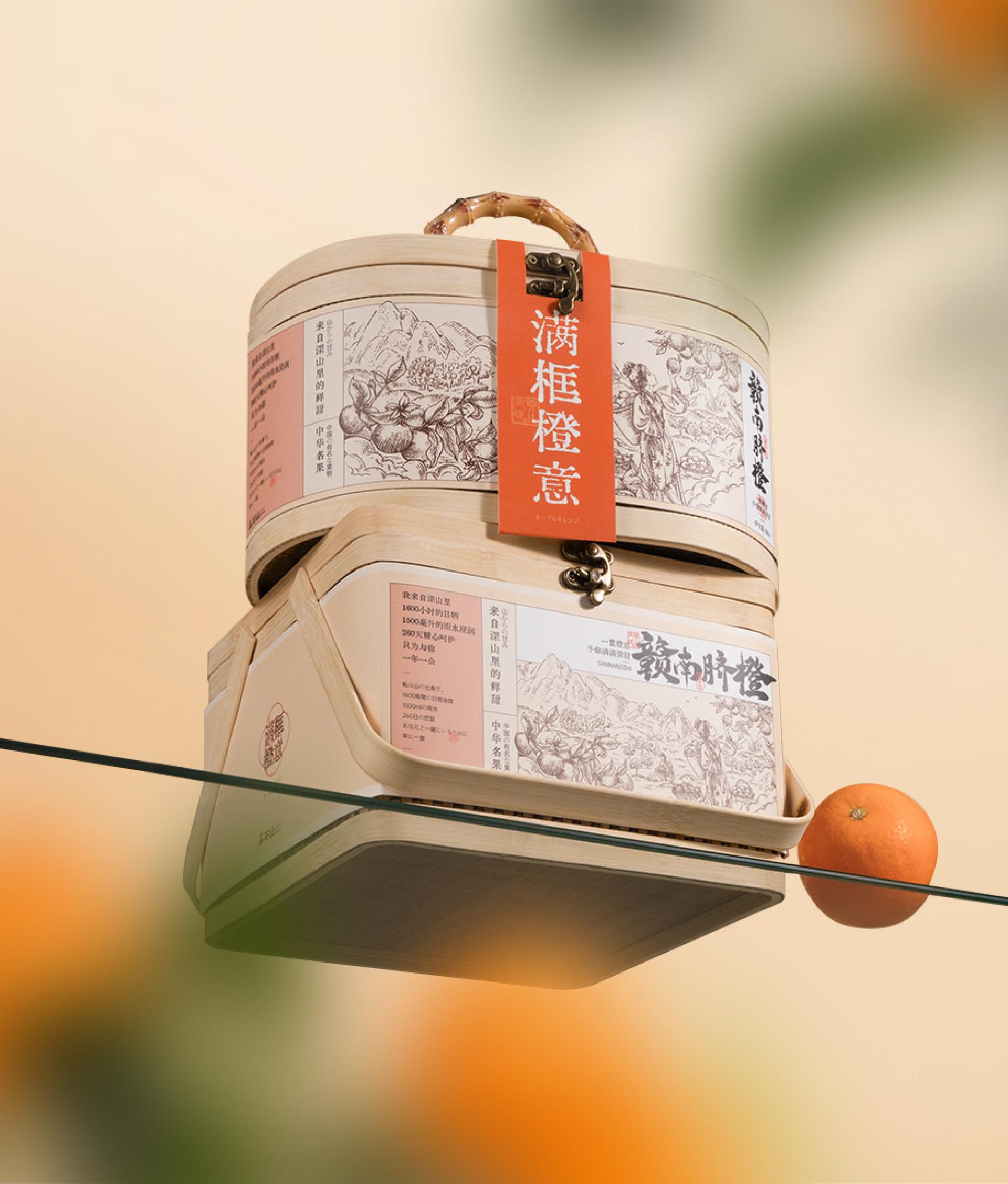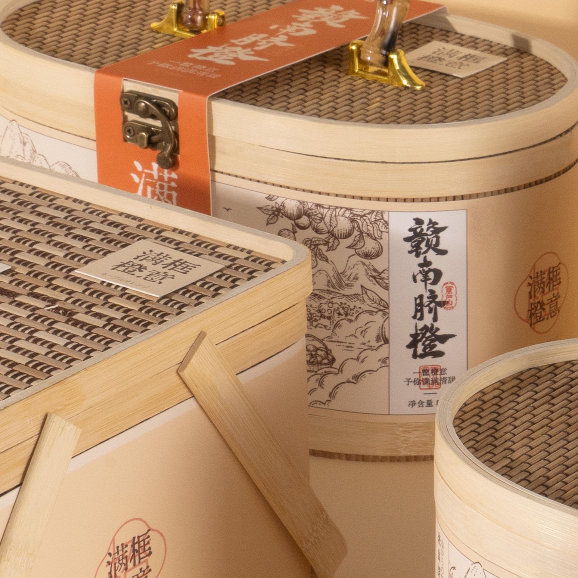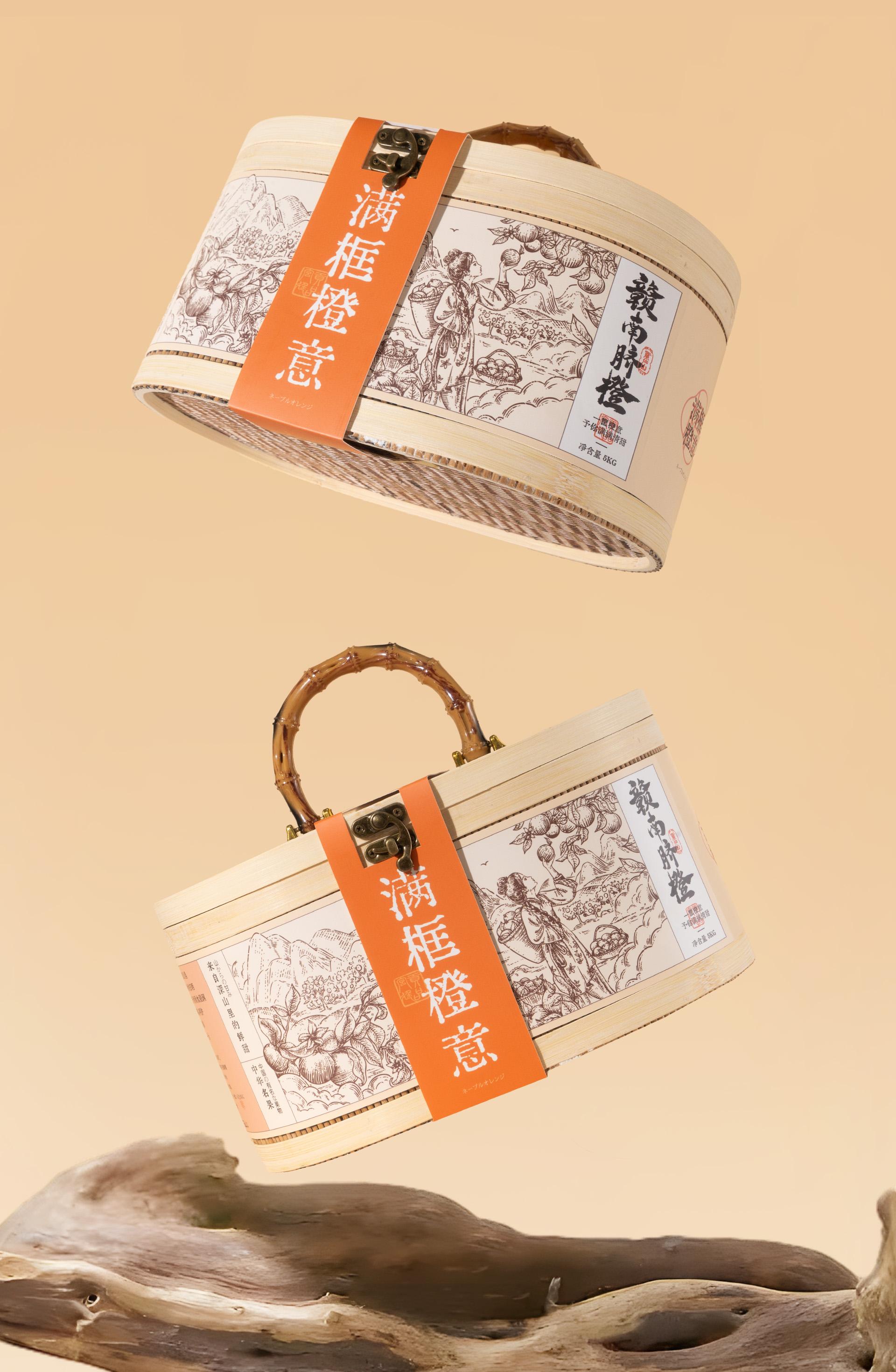 In terms of colorway, the packaging primarily adopts calm brown, accented with vibrant orange, which improves the overall texture and gives a strong visual impact. Moreover, the illustration as the visual center is surrounded by text information in an orderly manner, ensuring clear visual hierarchy while presenting a harmonious, balanced style. As for material selection, the packaging is crafted from eco-friendly bamboo through the traditional bamboo weaving process (commonly used in the baskets for orange picking), reflecting the brand’s commitment to modern environmental principles and achieving a rustic, natural aesthetic.