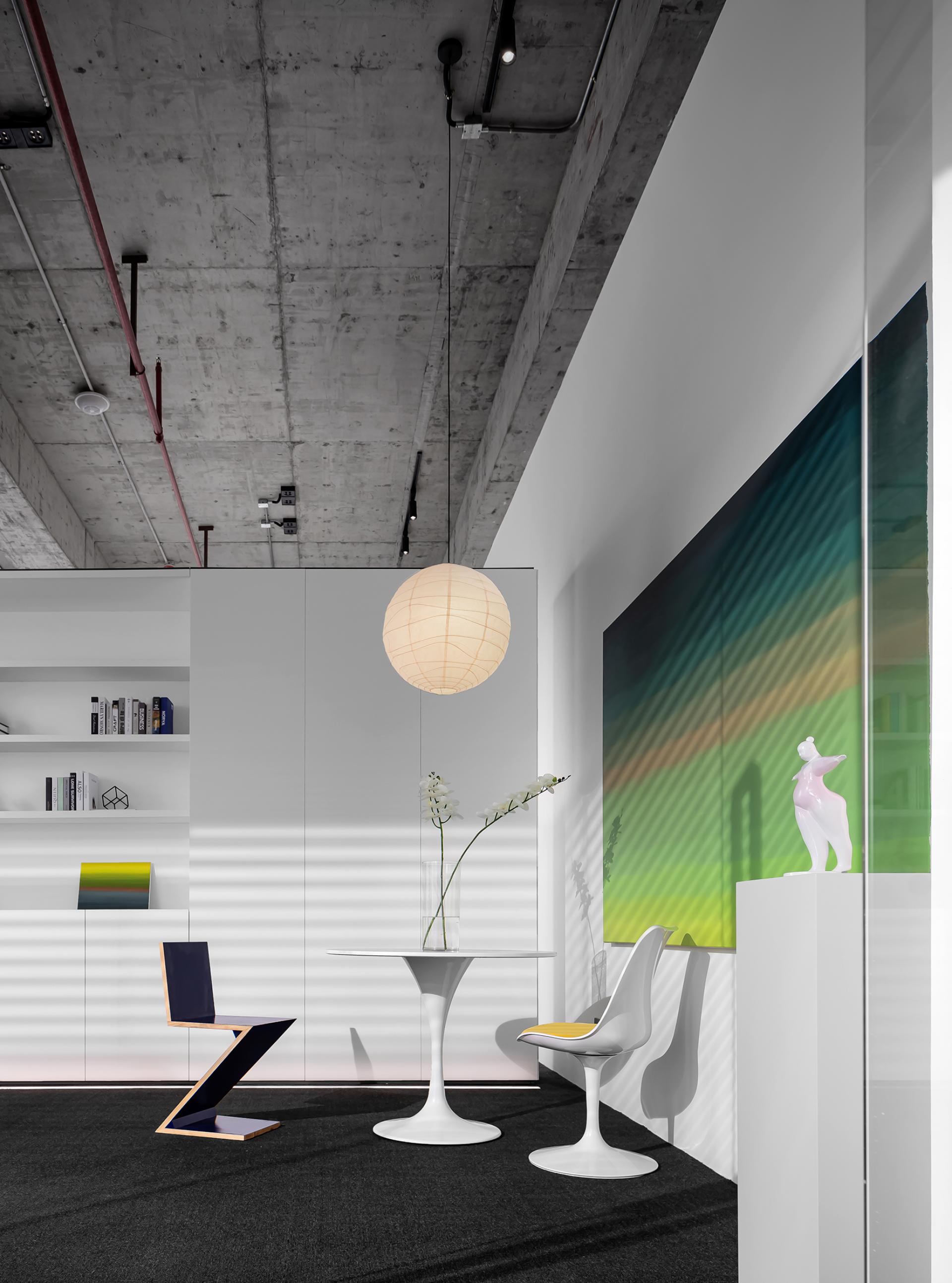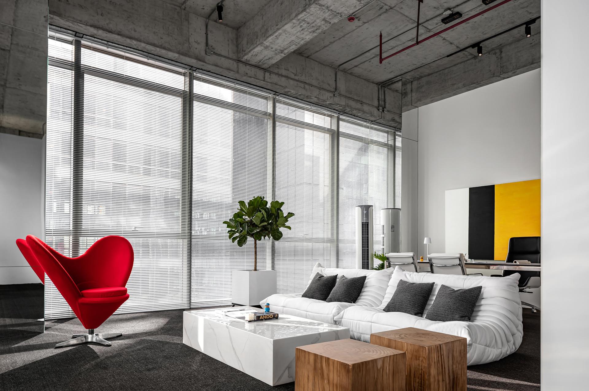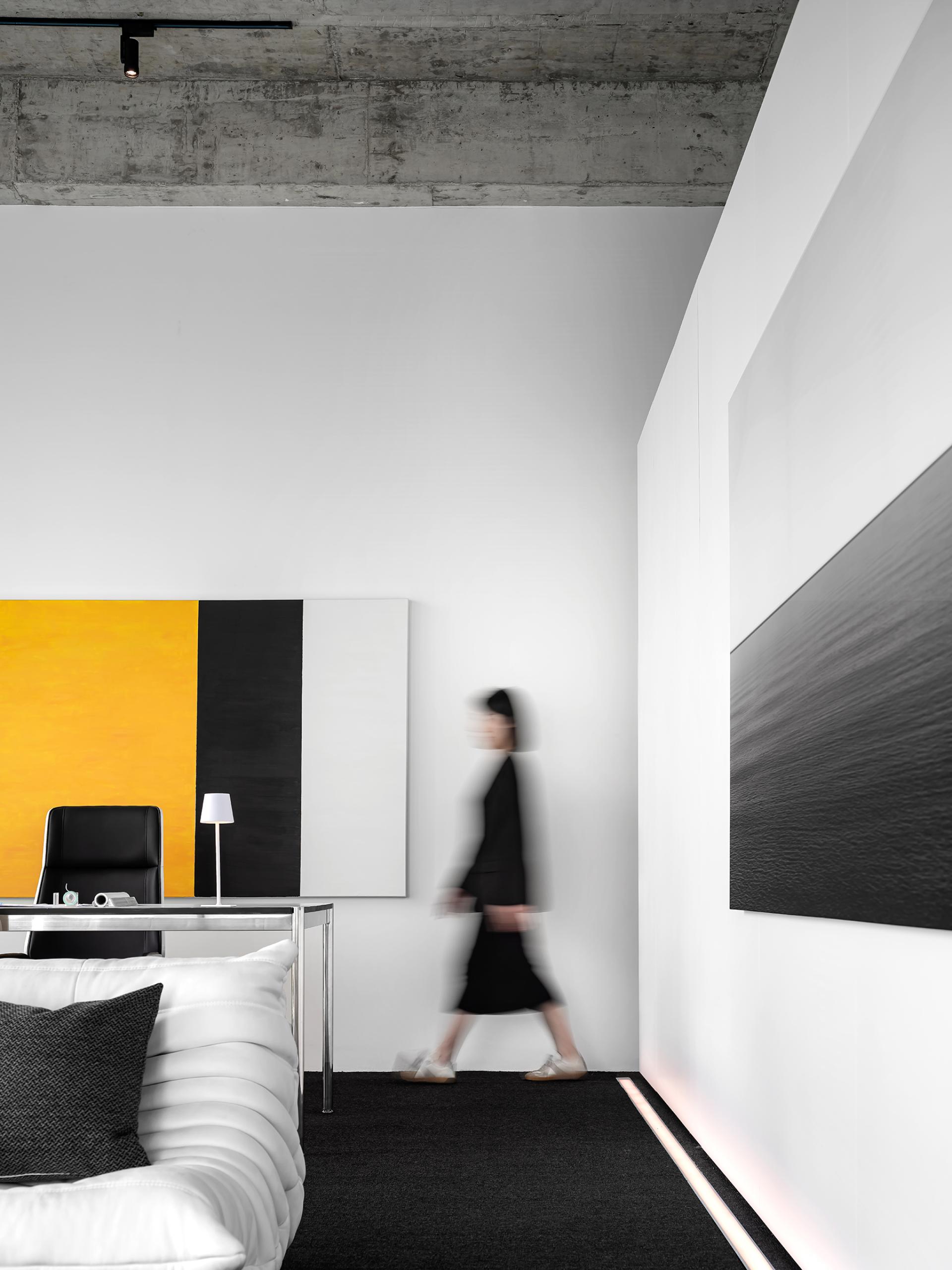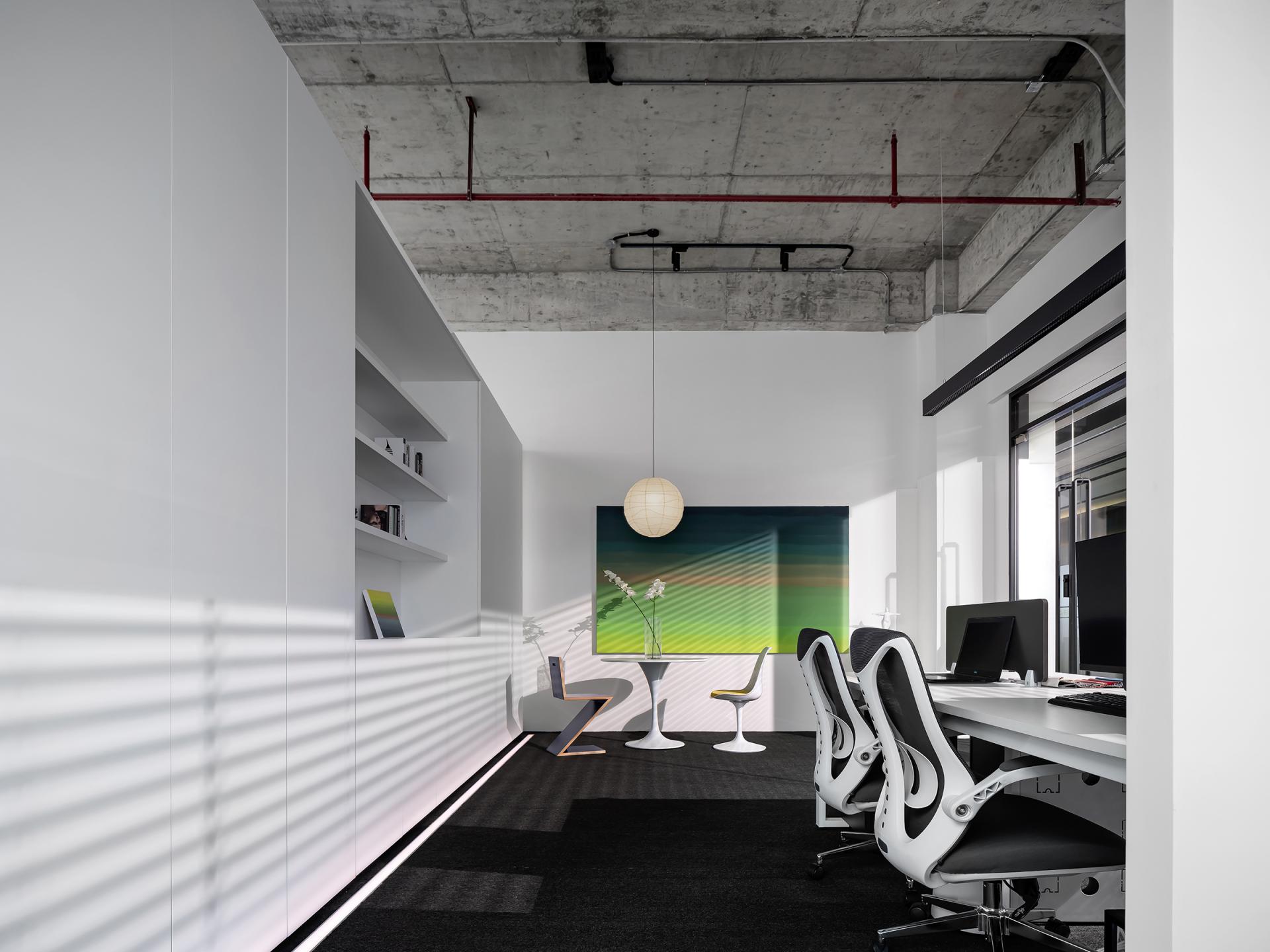 The Times are constantly progressing, and people's needs for office space are constantly changing. Office space is no longer a simple workplace, but also pays attention to the integration of life and work, set work, social, life and other multi-dimensional diversified space. This case redefines the space, aiming to break the traditional function-based office space, reshape the spatial form and give the space more possibilities. The project is composed of three parts: negotiation area, office area and founder's office. In terms of spatial layout, the traditional independent office area is abandoned, and there is no clear wall division. Only soft decoration is used to define functional zones, and artistic elements are integrated to create an open and free modern minimalist office space. The closure of the traditional office space is eliminated, and the casual design evokes the relaxed feeling of visitors as if at home. The whole space is in classic white as the main color, without complex design and too much decoration, minus the sense of oppression in the office. By combining natural and pure white with quiet black, the brand image is presented and expressed succinctly, while creating a harmonious view and feel for the transition of left and right space. The walls are decorated with paintings by designer Kevin Lo. Green is a symbol of life and nature. The gradient itself has a dynamic and hierarchical sense. The green changes from deep to light, like the transition from deep forest to grass, which is natural and soft. Different levels of green are interwoven together, giving the space more depth and dimension. The selection of green plants and red seats brighten the vitality of the office space. Kevin Lo, the designer of this project respects the state of the space itself, and retains the original fair-faced concrete in the ceiling design. Fair-faced concrete is a simple and rough building material, and the texture it shows is a tribute to the original building. By retaining this original rough texture, we allow the space to find a rustic and authentic emotional resonance in the bustling city.