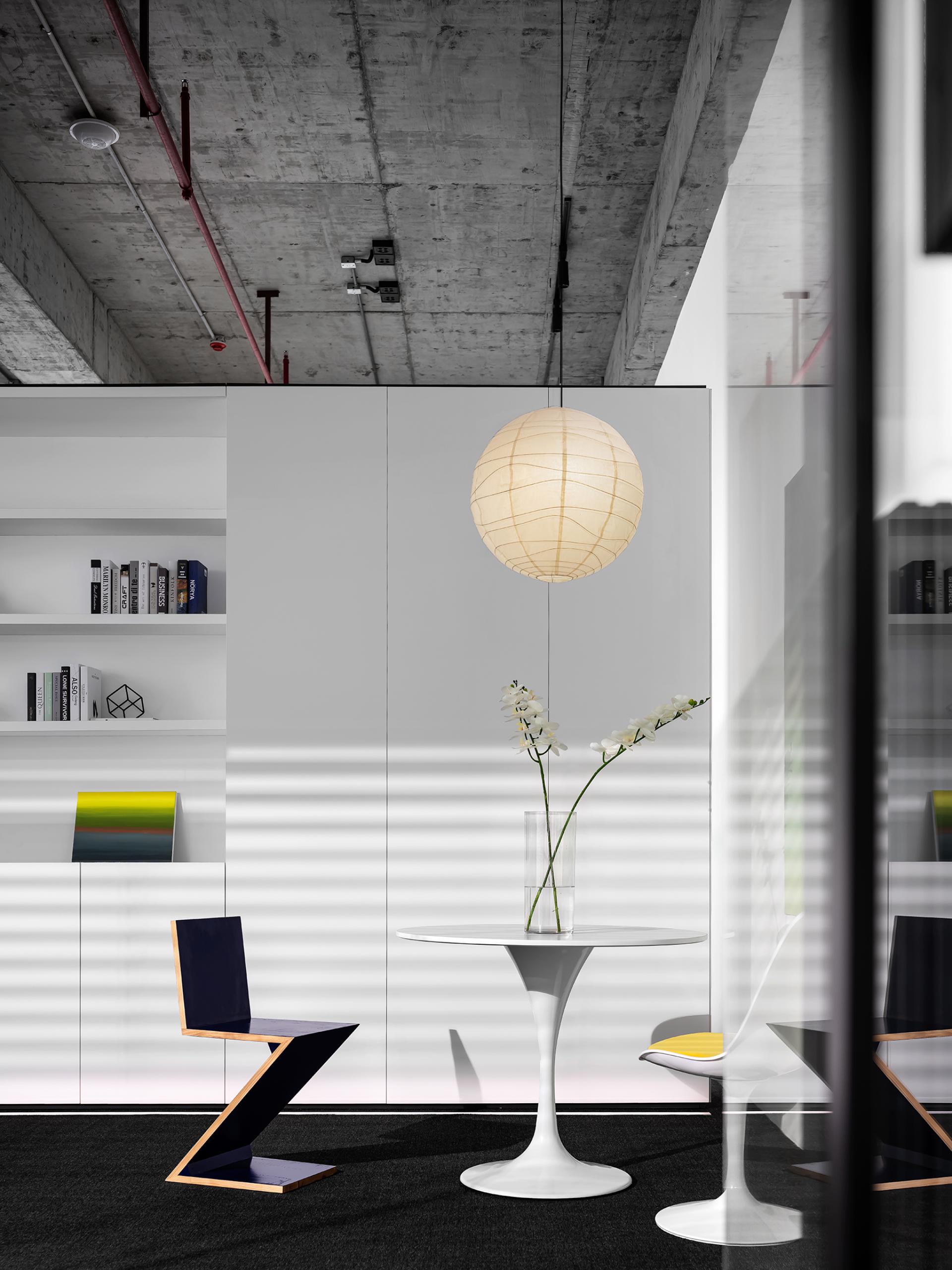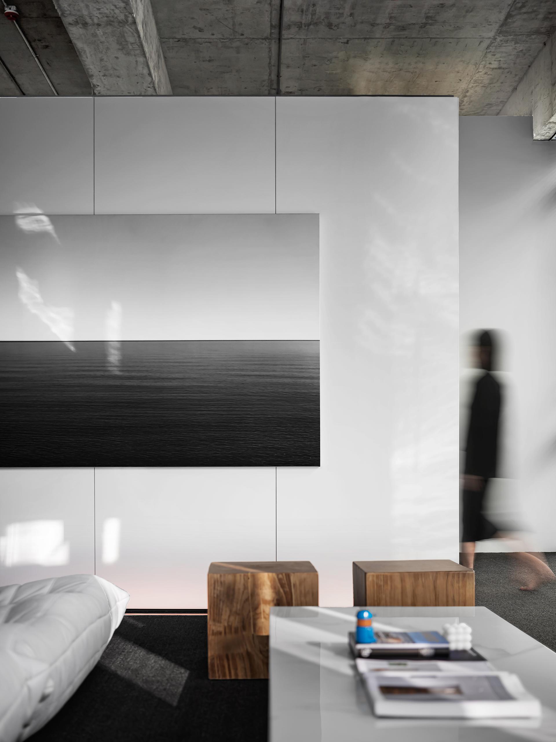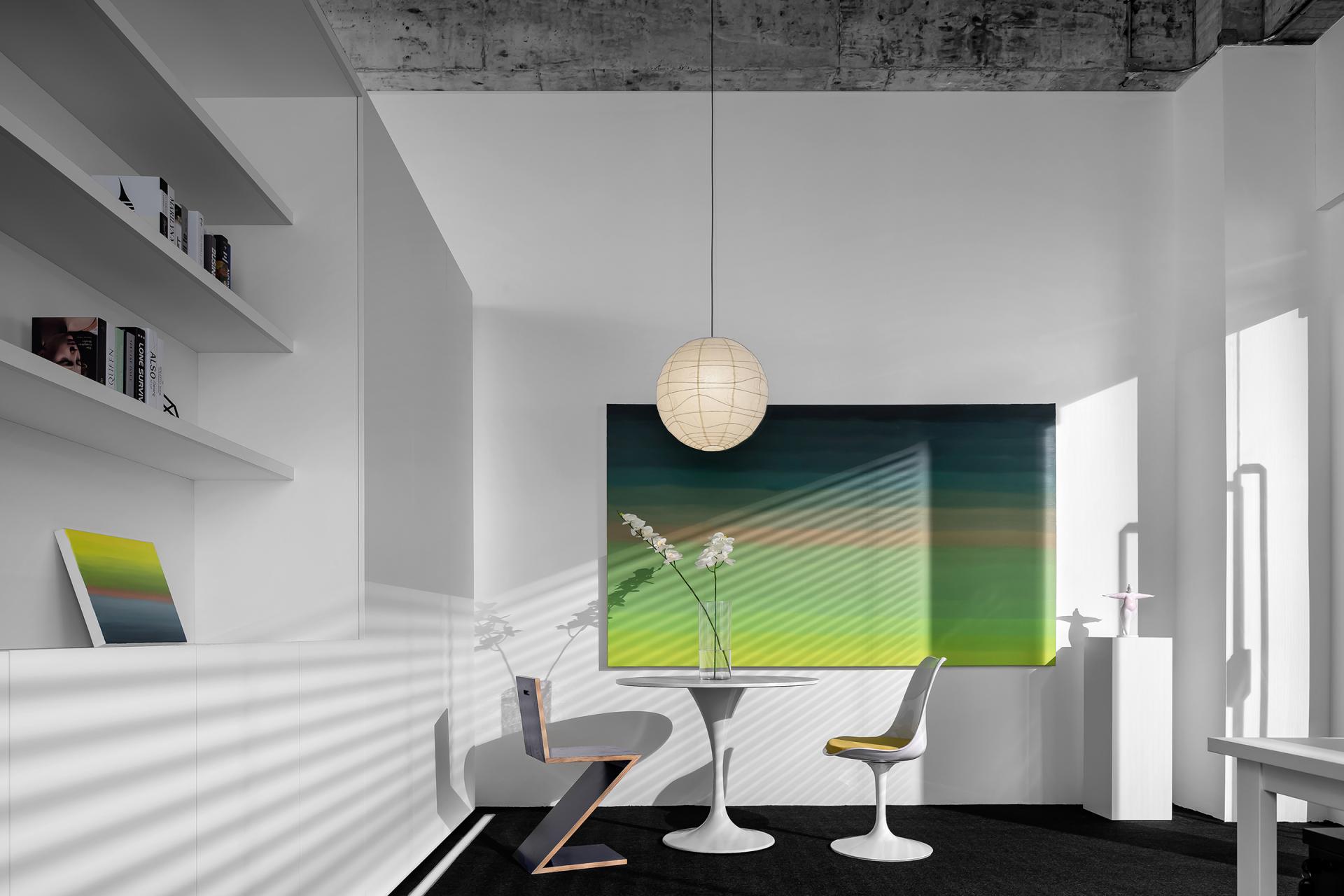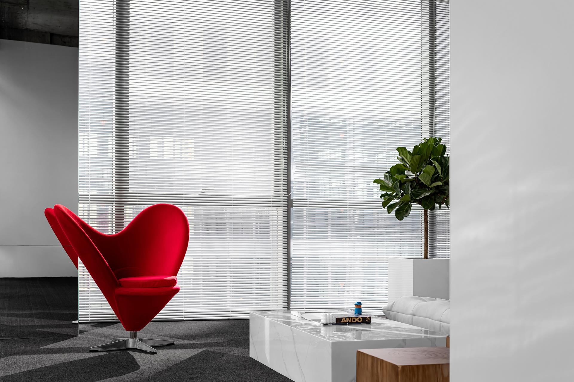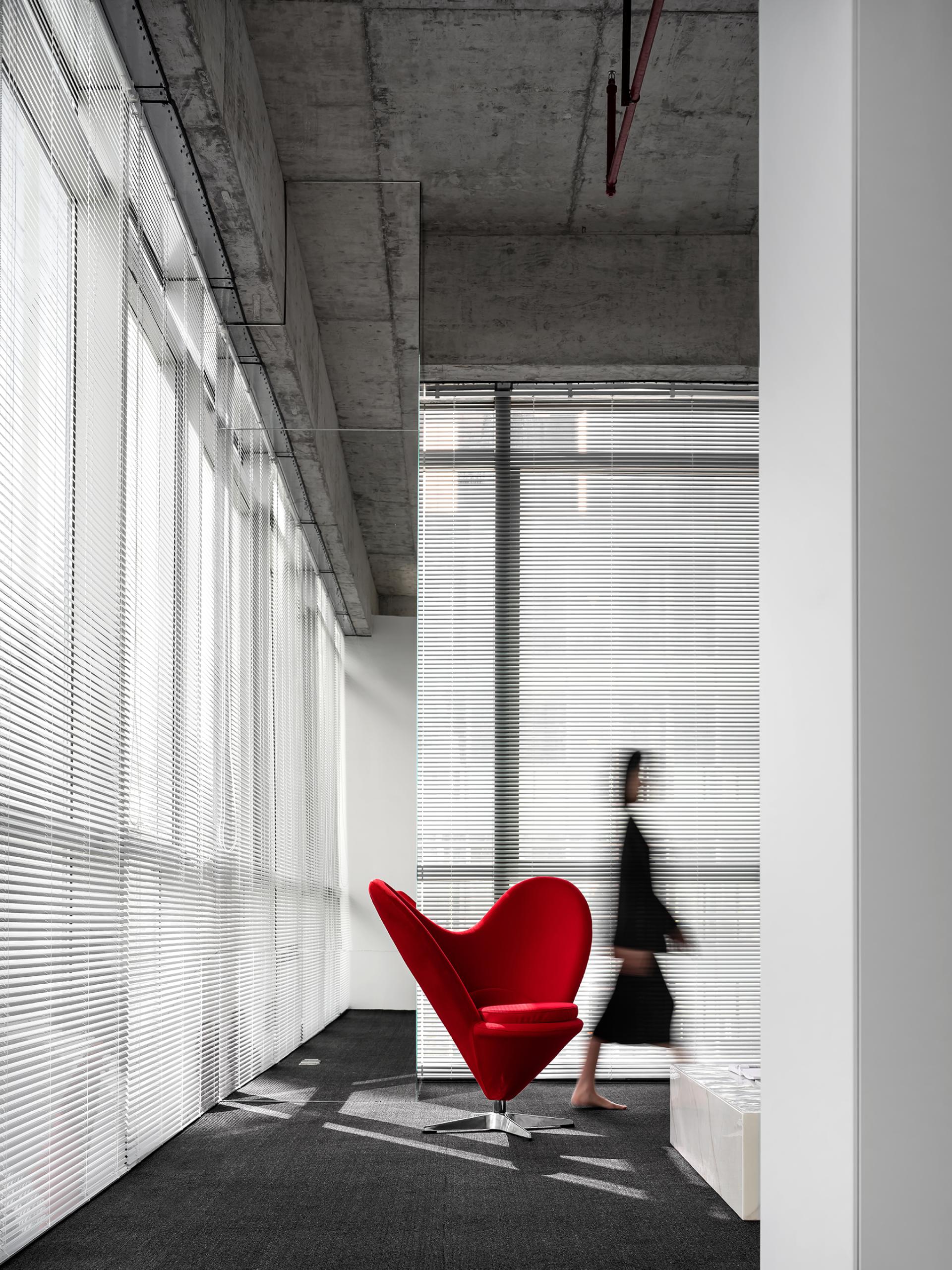 The Times are constantly progressing, and people's needs for office space are constantly changing. Office space is no longer a simple workplace, but also pays attention to the integration of life and work, set work, social, life and other multi-dimensional diversified space. This case redefines the space, aiming to break the traditional function-based office space, reshape the spatial form and give the space more possibilities. The project is composed of three parts: negotiation area, office area and founder's office. In terms of spatial layout, the traditional independent office area is abandoned, and there is no clear wall division. Only soft decoration is used to define functional zones, and artistic elements are integrated to create an open and free modern minimalist office space. The closure of the traditional office space is eliminated, and the casual design evokes the relaxed feeling of visitors as if at home. The whole space is in classic white as the main color, without complex design and too much decoration, minus the sense of oppression in the office. By combining natural and pure white with quiet black, the brand image is presented and expressed succinctly, while creating a harmonious view and feel for the transition of left and right space. The walls are decorated with paintings by designer Kevin Lo. Green is a symbol of life and nature. The gradient itself has a dynamic and hierarchical sense. The green changes from deep to light, like the transition from deep forest to grass, which is natural and soft. Different levels of green are interwoven together, giving the space more depth and dimension. The selection of green plants and red seats brighten the vitality of the office space. Kevin Lo, the designer of this project respects the state of the space itself, and retains the original fair-faced concrete in the ceiling design. Fair-faced concrete is a simple and rough building material, and the texture it shows is a tribute to the original building. By retaining this original rough texture, we allow the space to find a rustic and authentic emotional resonance in the bustling city.
