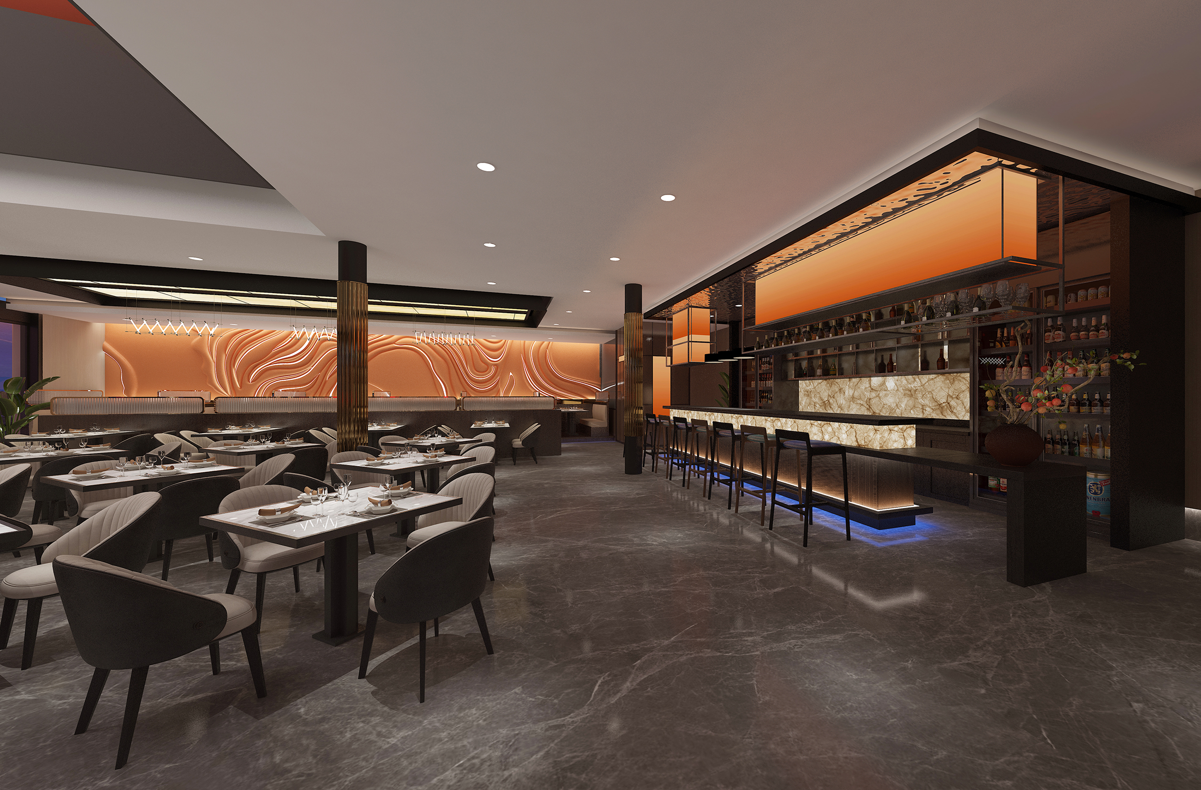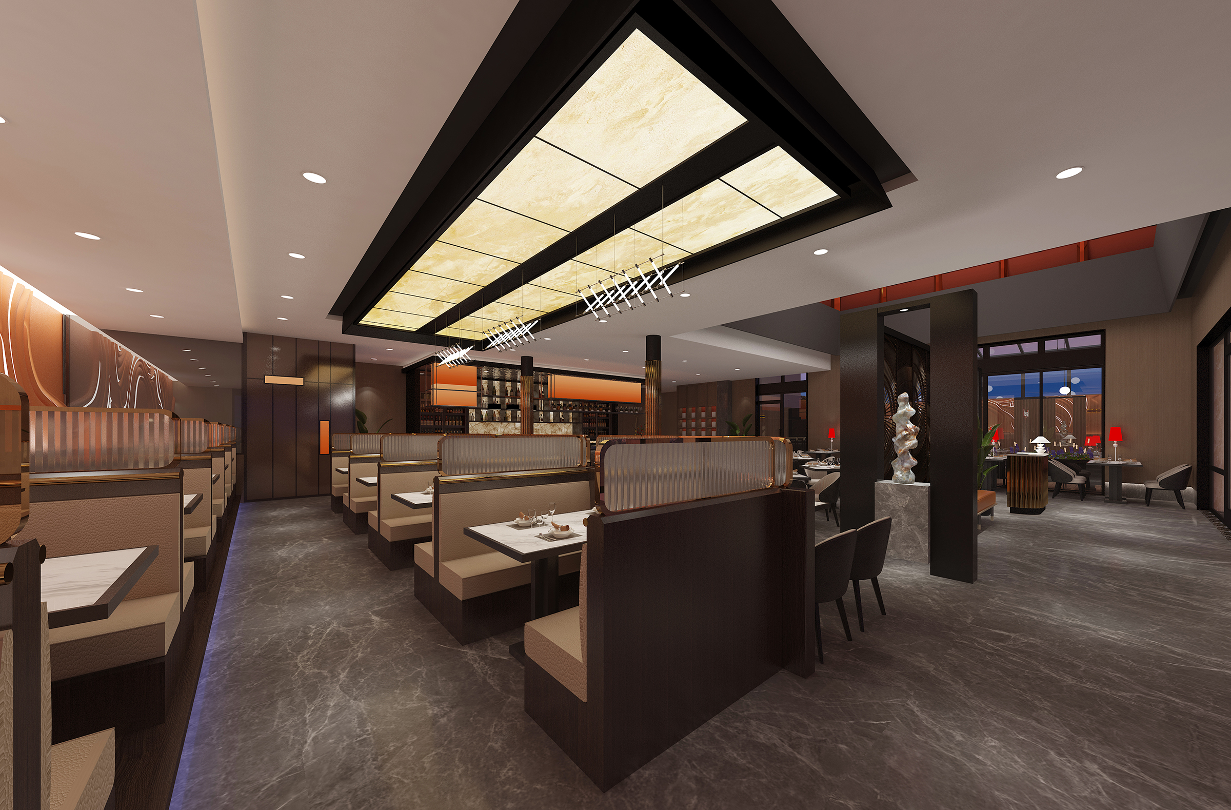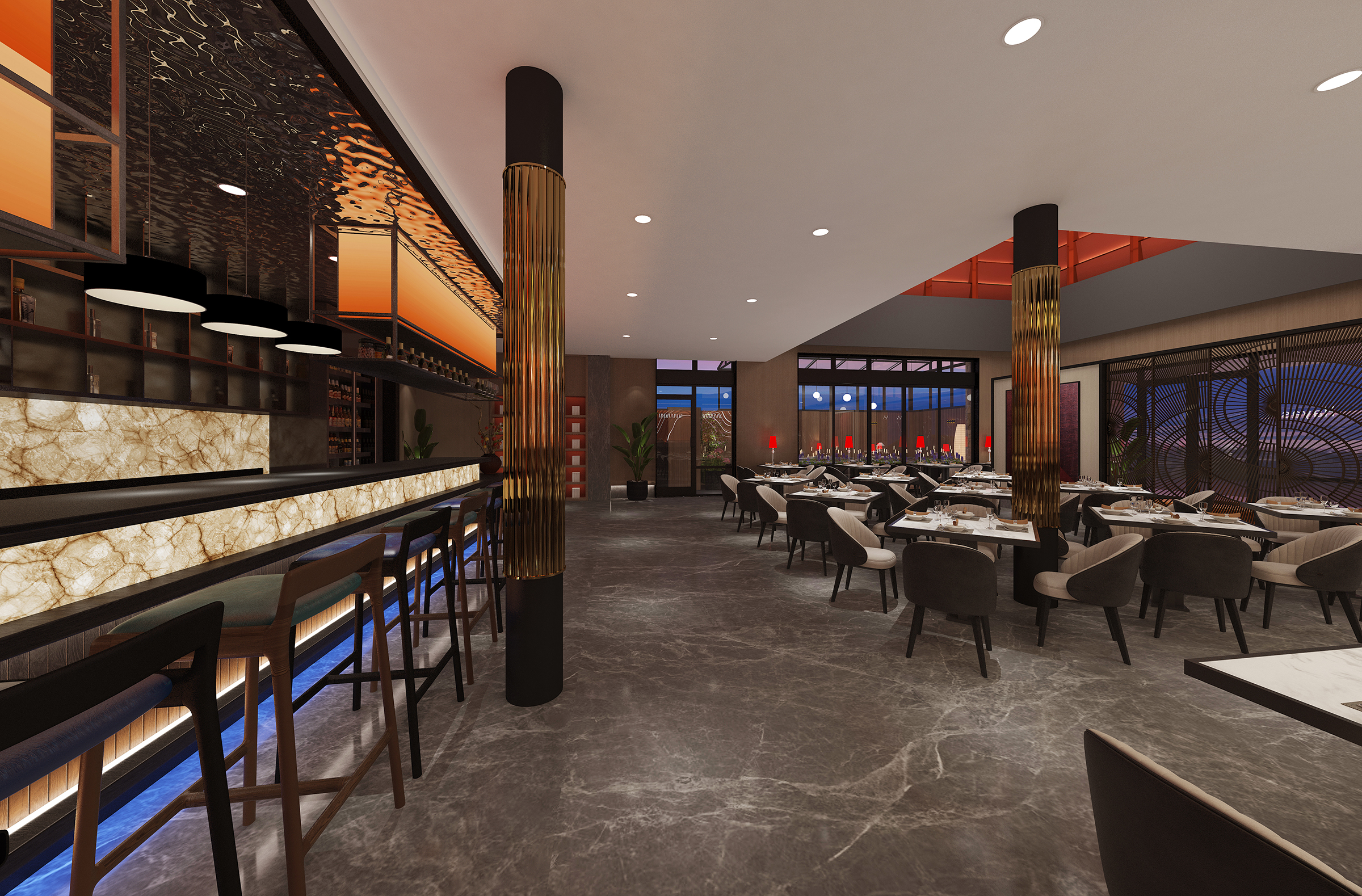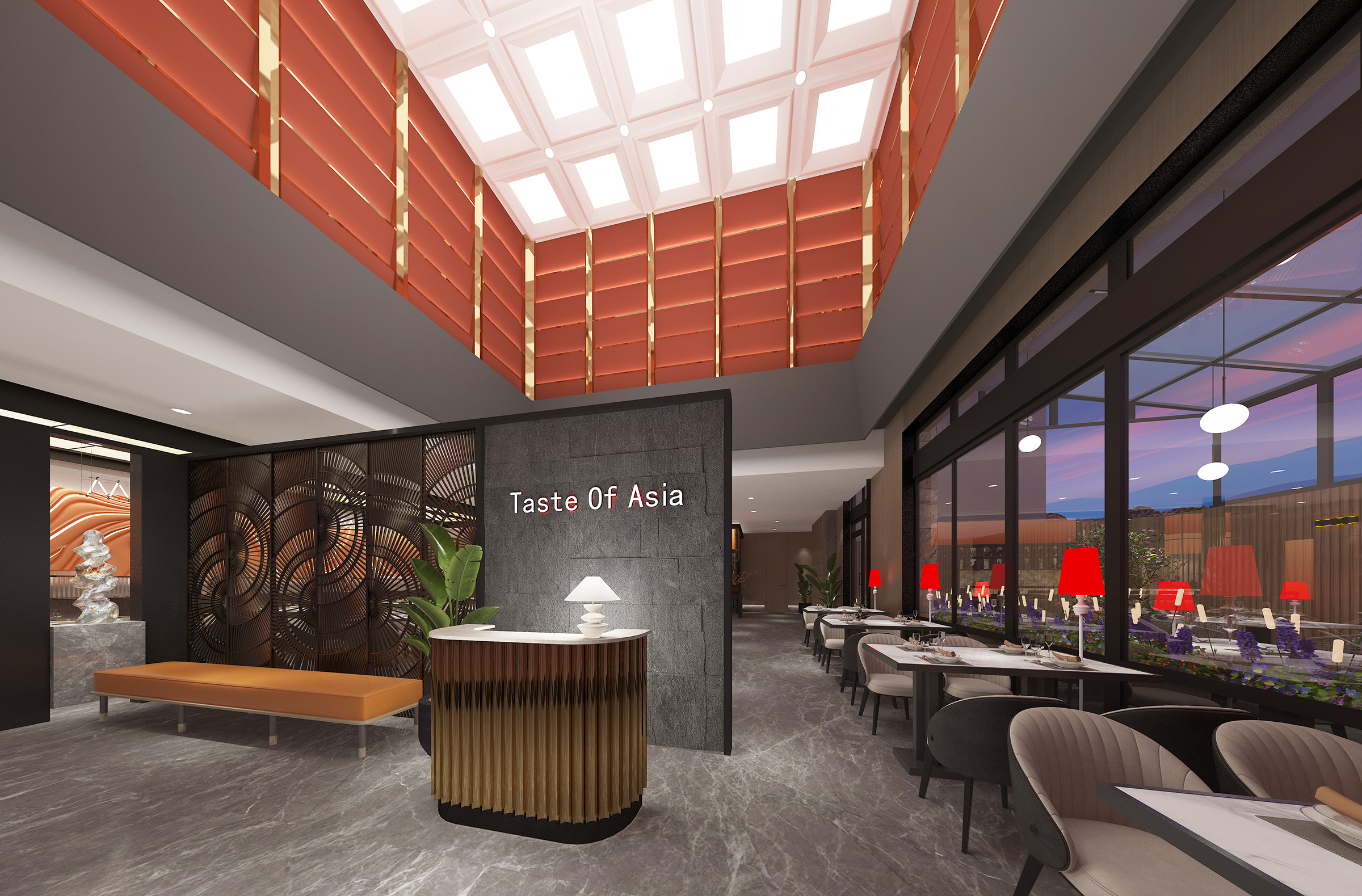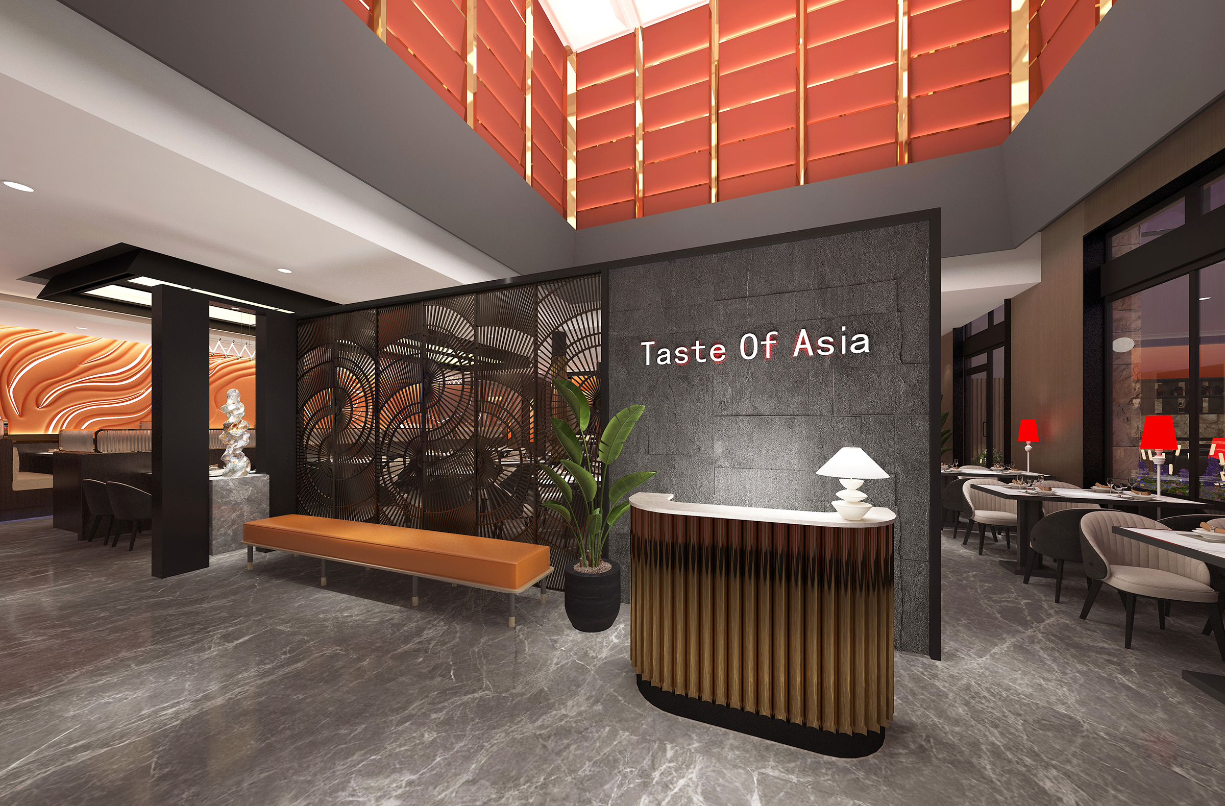 Located in Lubbock County, Texas, the United States, this restaurant is a large-scale comprehensive high-end luxury Asian restaurant that aims to redefine the dining experience through the elegant fusion of Asian culture and high-end luxury. The design concept is derived from the in-depth exploration of Asian culture and the fusion of modern luxury fashion, striving to create a unique dining space for customers. We draw inspiration from it and cleverly interweave the exquisiteness and restraint of Asian culture with modern luxury elements to create a unique environment that is both fashionable and full of cultural heritage.The lighting system has been carefully designed to highlight the key areas of the restaurant and create a warm atmosphere. The design of the chandelier incorporates elements of traditional Asian lanterns, such as the shape of Chinese palace lanterns and Japanese bamboo lanterns. The light shines through the lampshade, emitting soft and warm light. The wall lamps are modeled after the style of ancient Asian candlesticks, and the light and shadow effects of the spotlights are like the projection of moonlight on ancient Asian buildings. The combination of multiple lighting methods ensures sufficient light while using light and shadow effects to enhance the layering and three-dimensional sense of space. The soft light sprinkled on the dining table makes the food more tempting and also brings a comfortable dining experience to customers.The main colors are gold and wood, which are common in Asian culture. Gold symbolizes the nobility and splendor in traditional Asian culture, such as the golden decorations of the ancient Chinese royal family and the gold foil veneer of Thai temples;wood reflects Asians' respect for nature. From the wooden structure of traditional Japanese architecture to the wood carvings of Southeast Asia,the simplicity and warmth of wood are displayed.The combination of dark-colored decorations, such as Chinese red and Indian blue, reflects stability and luxury. In short, the design of this restaurant perfectly combines Asian culture with high-end light luxury style. From material selection to space layout, lighting and color matching, all aspects are committed to creating a unique, comfortable and luxurious dining environment for customers.