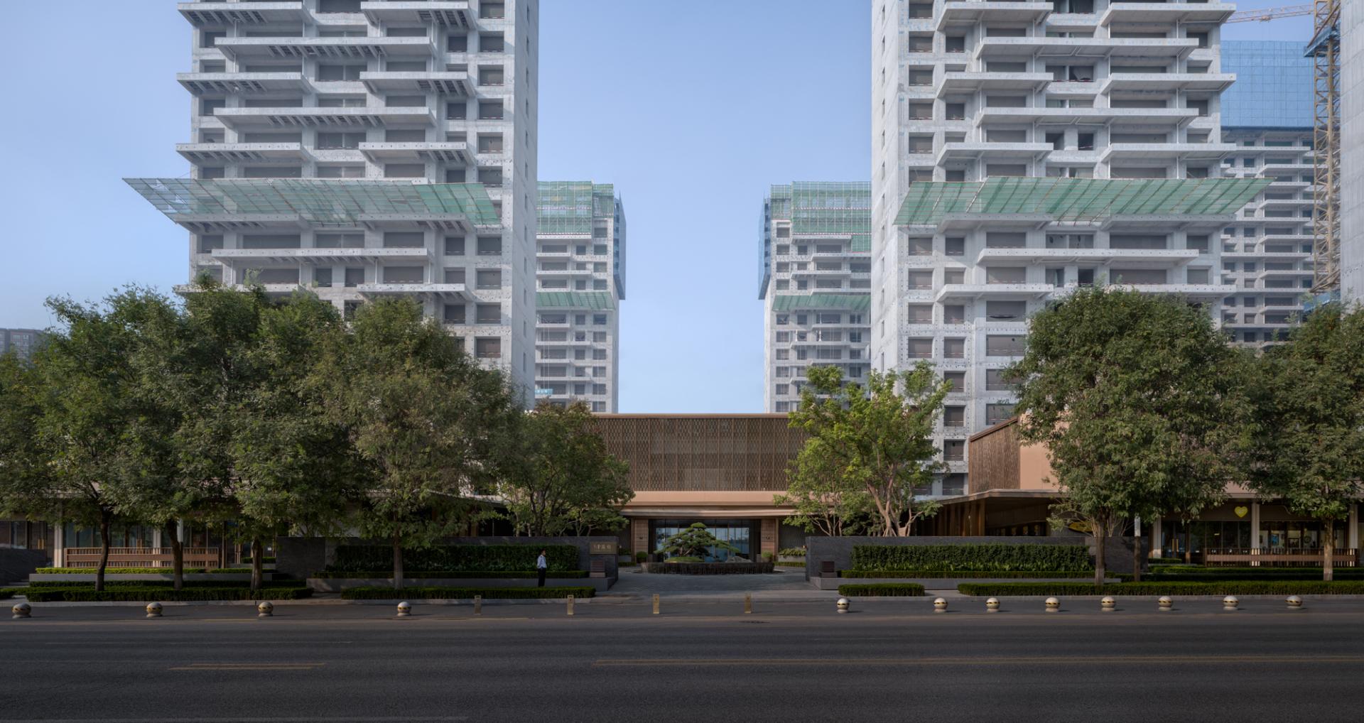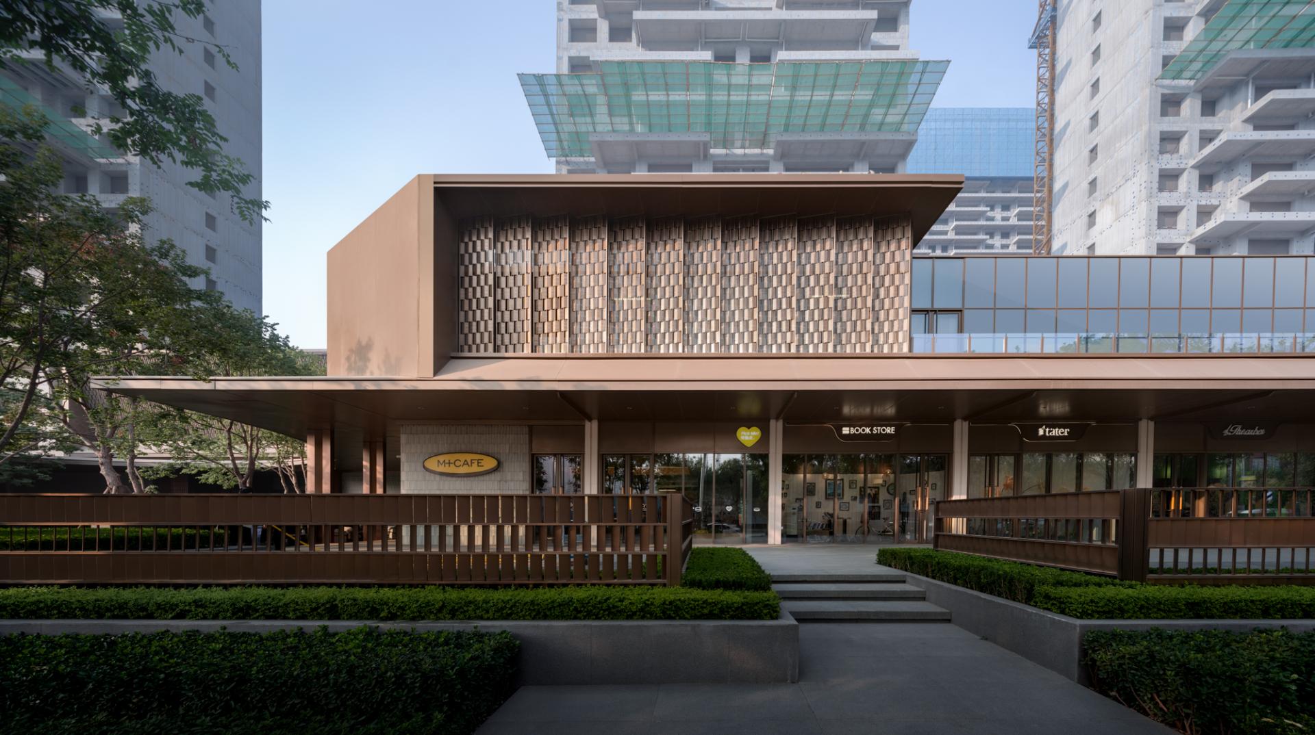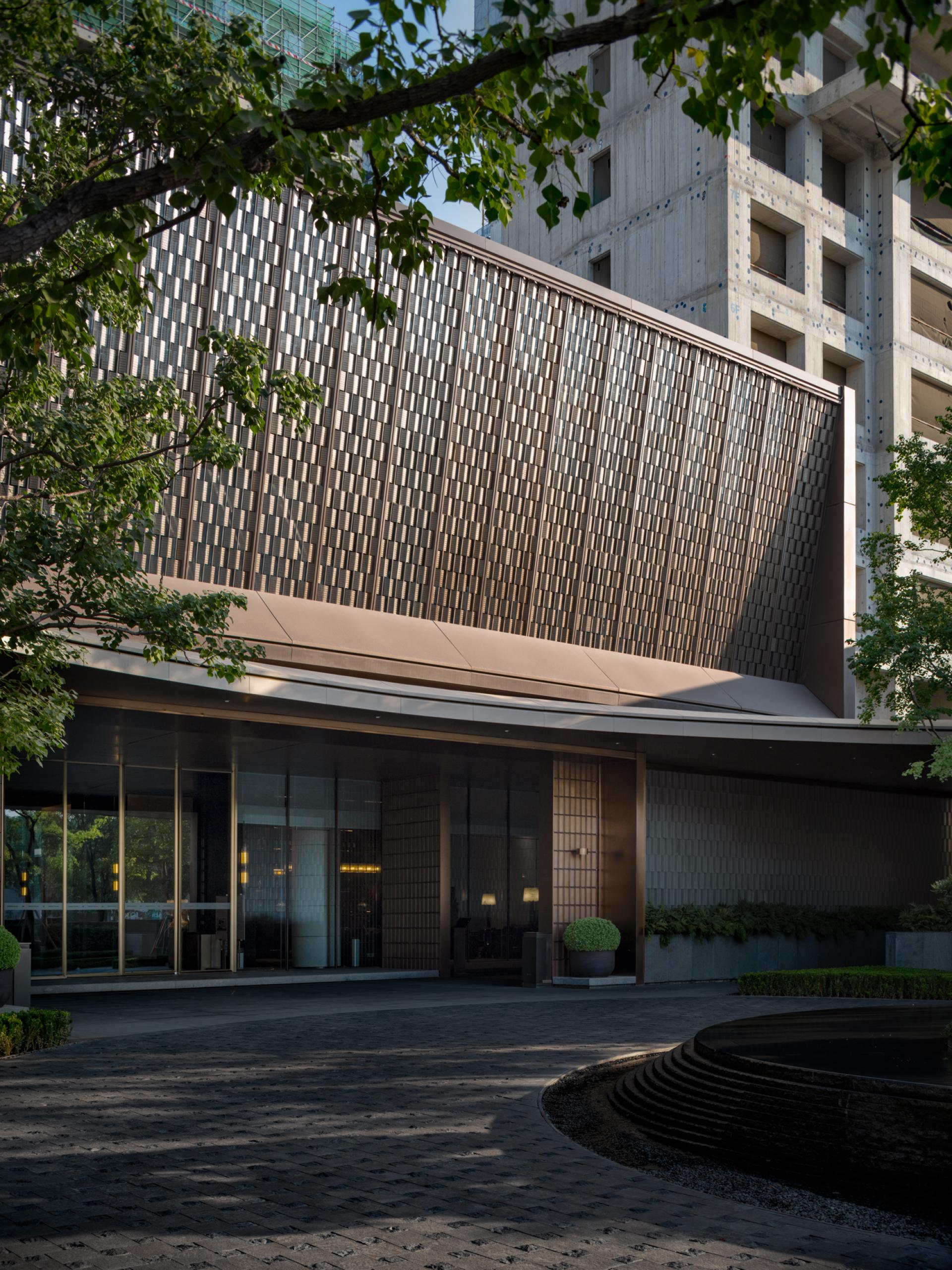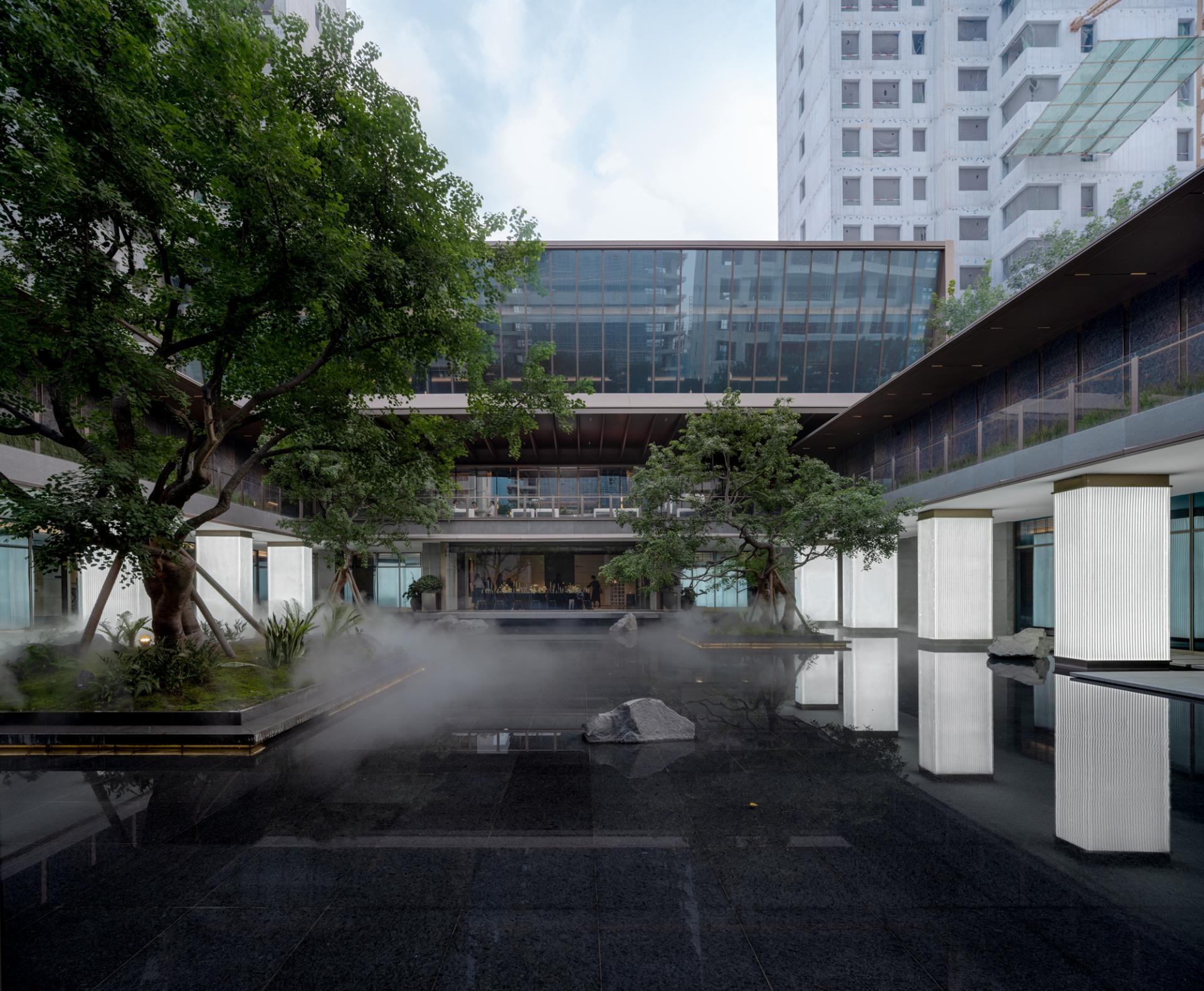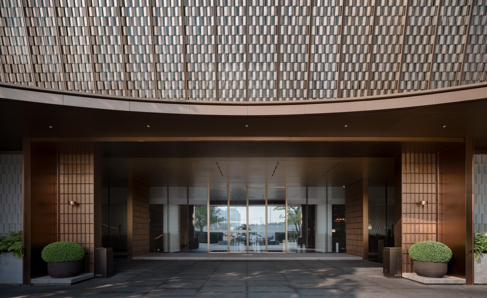 A large area of the entrance adopts an art landscape wall made of champagne aluminum panels, which Outlines a light shape, and pulls back tens of meters to form an outward arc. The magnificent horizontal overhang is combined with a special shape pine tree, which is full of aesthetic tension. This drop-off area elevates the sense of hospitality to the extreme.