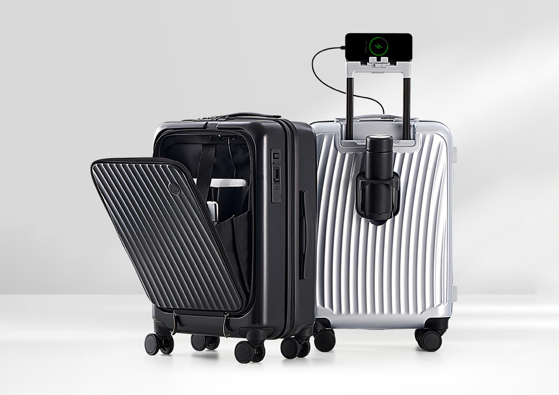 Additionally, the product places great emphasis on practicality and ease of use. An internal specific area for power banks, paired with an external USB interface, enables on-the-go charging; a hidden phone support and a foldable cup holder facilitate easier travel; the rectangular rounded handle provides a comfortable grip for labor saving; the anti-wear side foot support prevents the luggage from scratching; the TSA password lock locks both compartments and allows for easy opening; the HINOMOTO silent wheels, compared to regular wheels, reduce noise by 20 decibels, making travel quieter and more elegant.