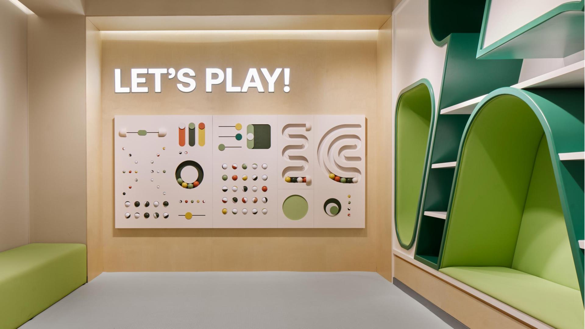 The children's area, adjacent to the women's section, is safely tucked in an inset space with interactive toys, creating a warm and playful shopping environment for families.