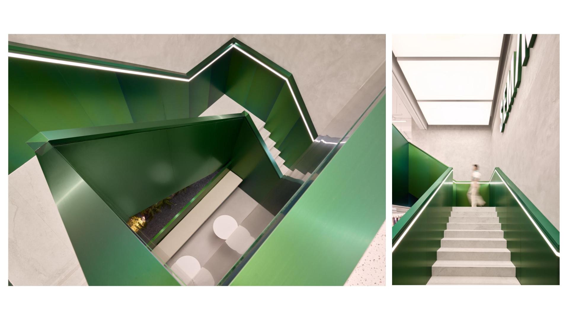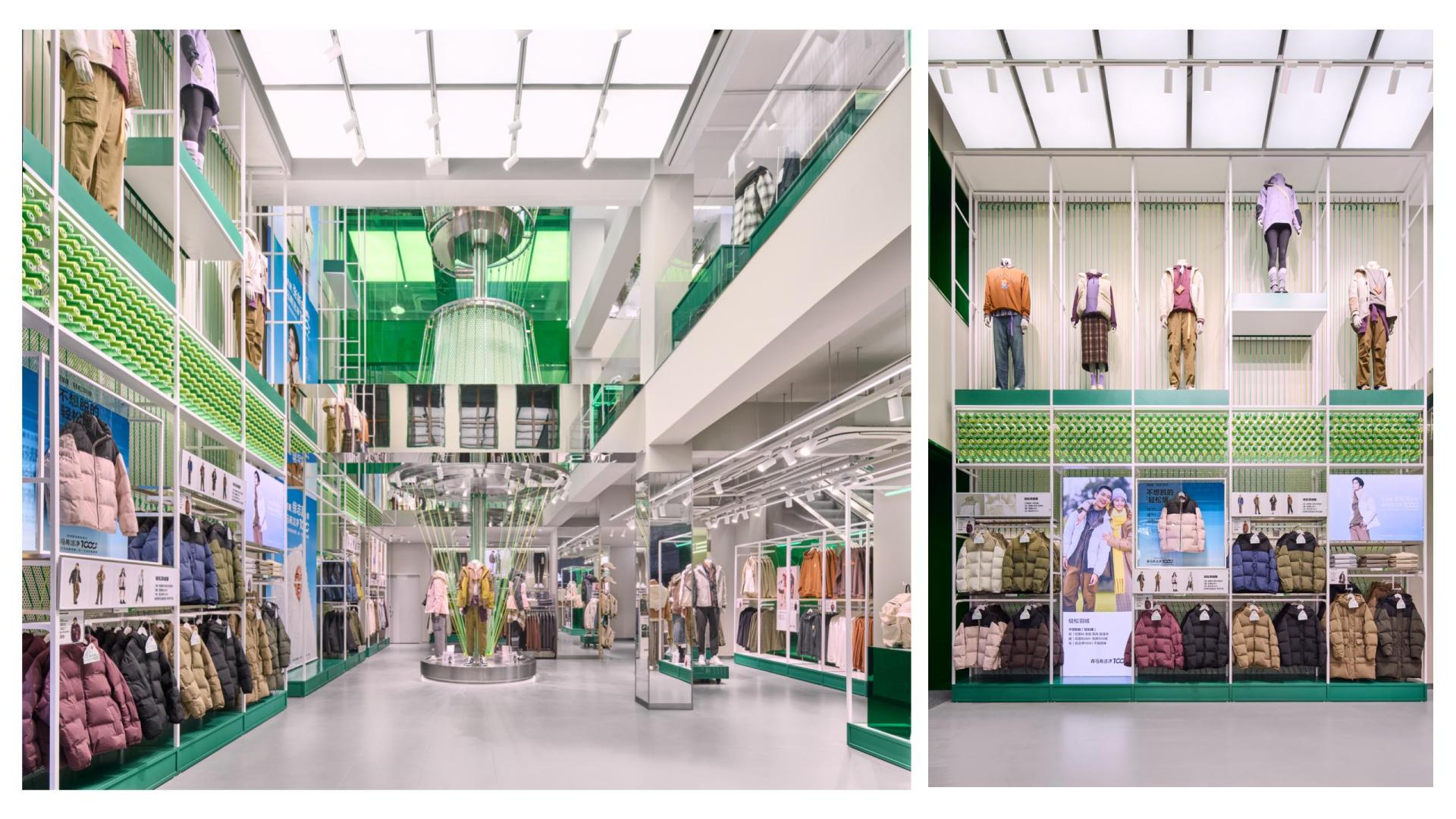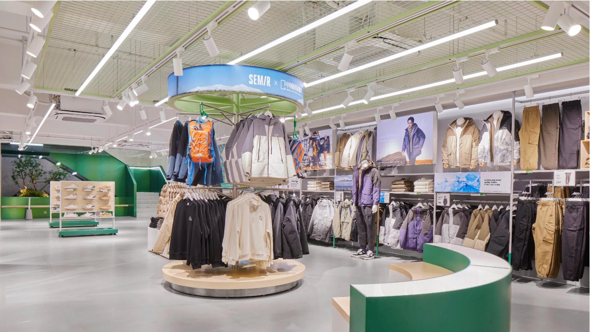 Upon entering, the layered green coil installations bring a sense of freshness, immediately conveying the brand's vibrant green ethos. The optimized flow of the space, with three open entrances, enhances customer movement. The horizontal and vertical display fixtures at the entrance showcase high-demand products, while the combination of model displays and back walls creates a narrative flow, strengthening emotional engagement with customers.