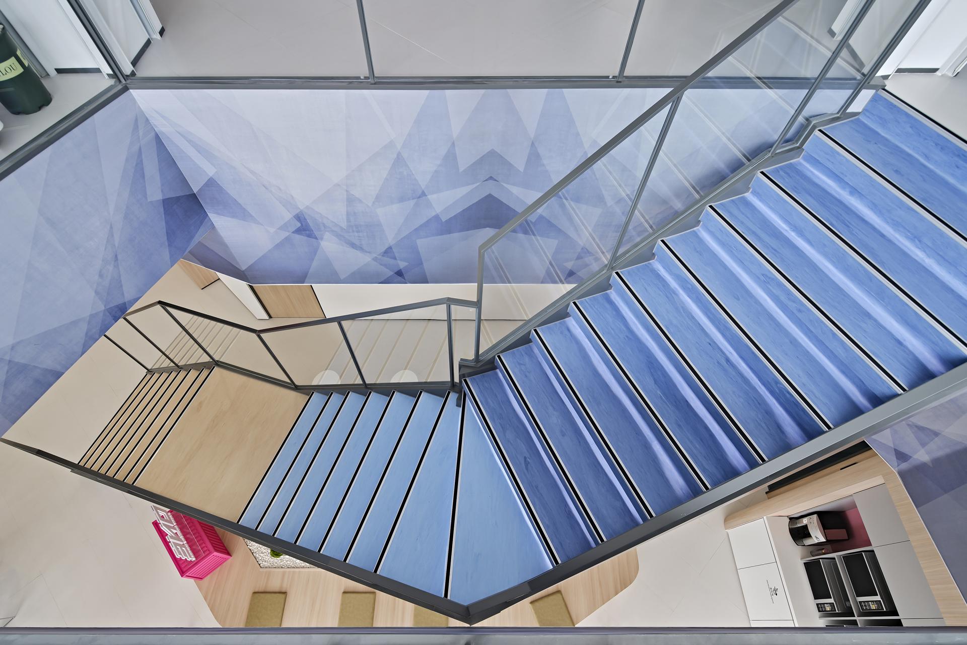 Ocean blue color on the 26th floor, land wood color on the 25th floor, and the beach image of staircase set up as a link between the upper and lower floors, create a strong internal link to visually guide the function.