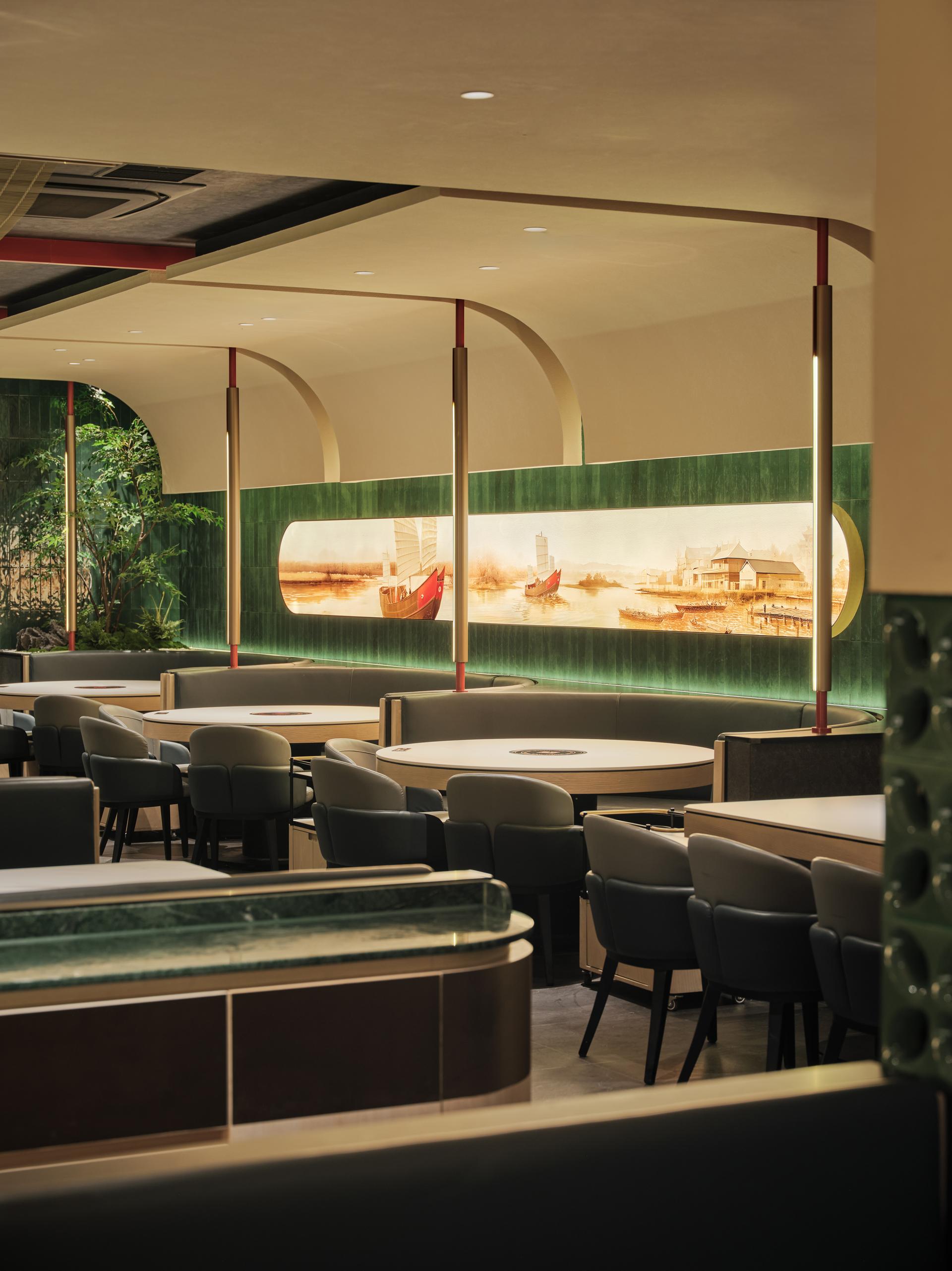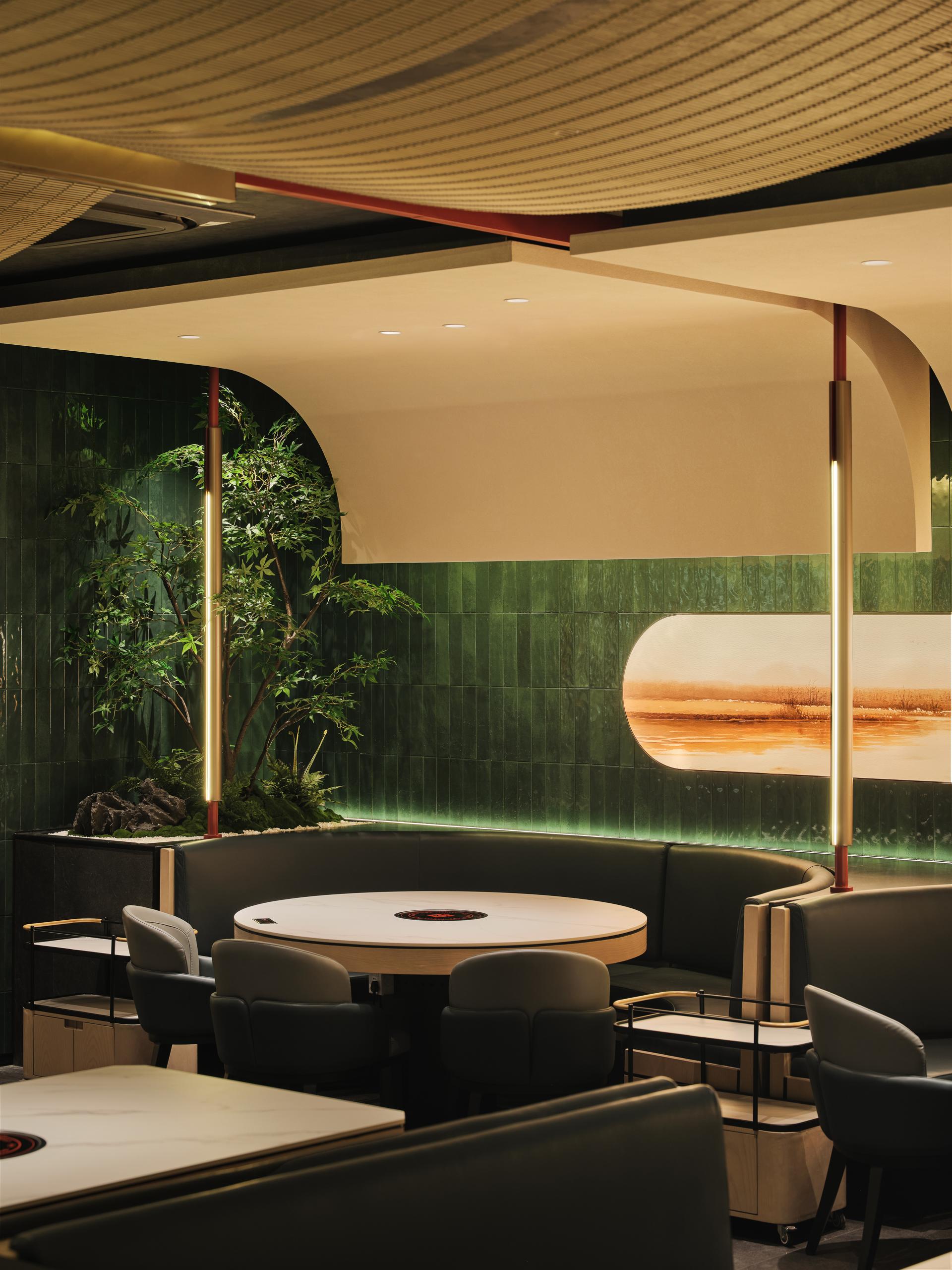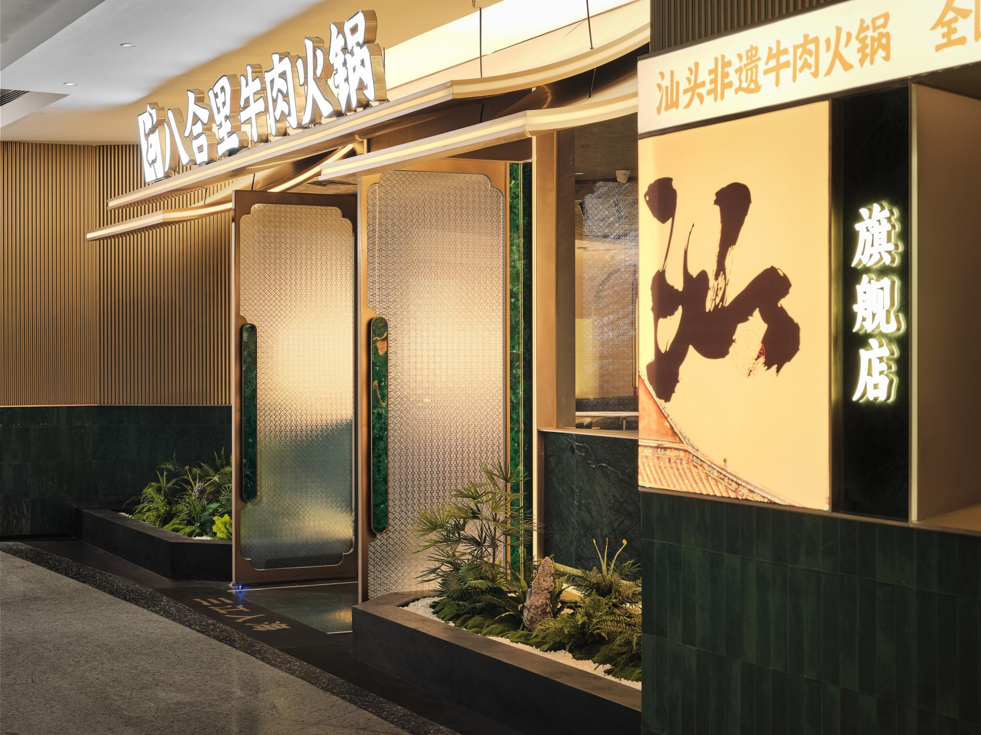 The design draws inspiration from the vibrant Chaoshan wharf culture, incorporating notable architectural elements such as hollowed-out glazed tiles and flying eaves and arches. These features accentuate the rich heritage of the local culture and foster a classical elegance throughout the space. The colour palette of the Baheli Flagship Store adheres to the traditional grey, white, and green hues characteristic of Chaoshan architecture. These classic tones are seamlessly integrated into the modern design, presenting a distinctive and harmonious aesthetic. Additionally, the use of warm yellow lighting, contrasted with carefully selected greenery representative of Chaoshan specialities, contributes to a warm, elegant, and comfortable dining atmosphere.
