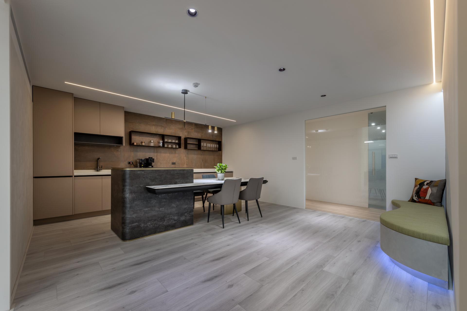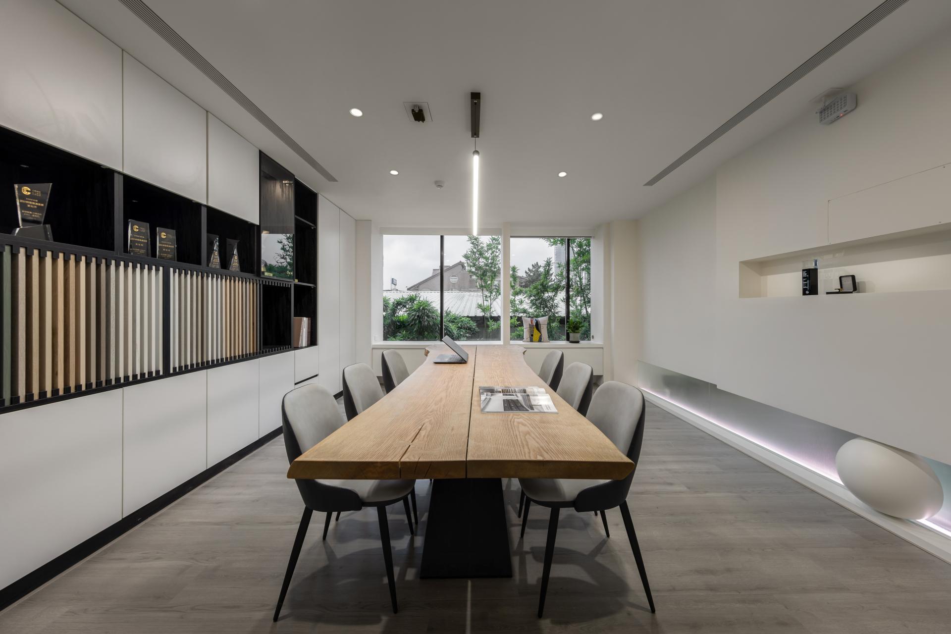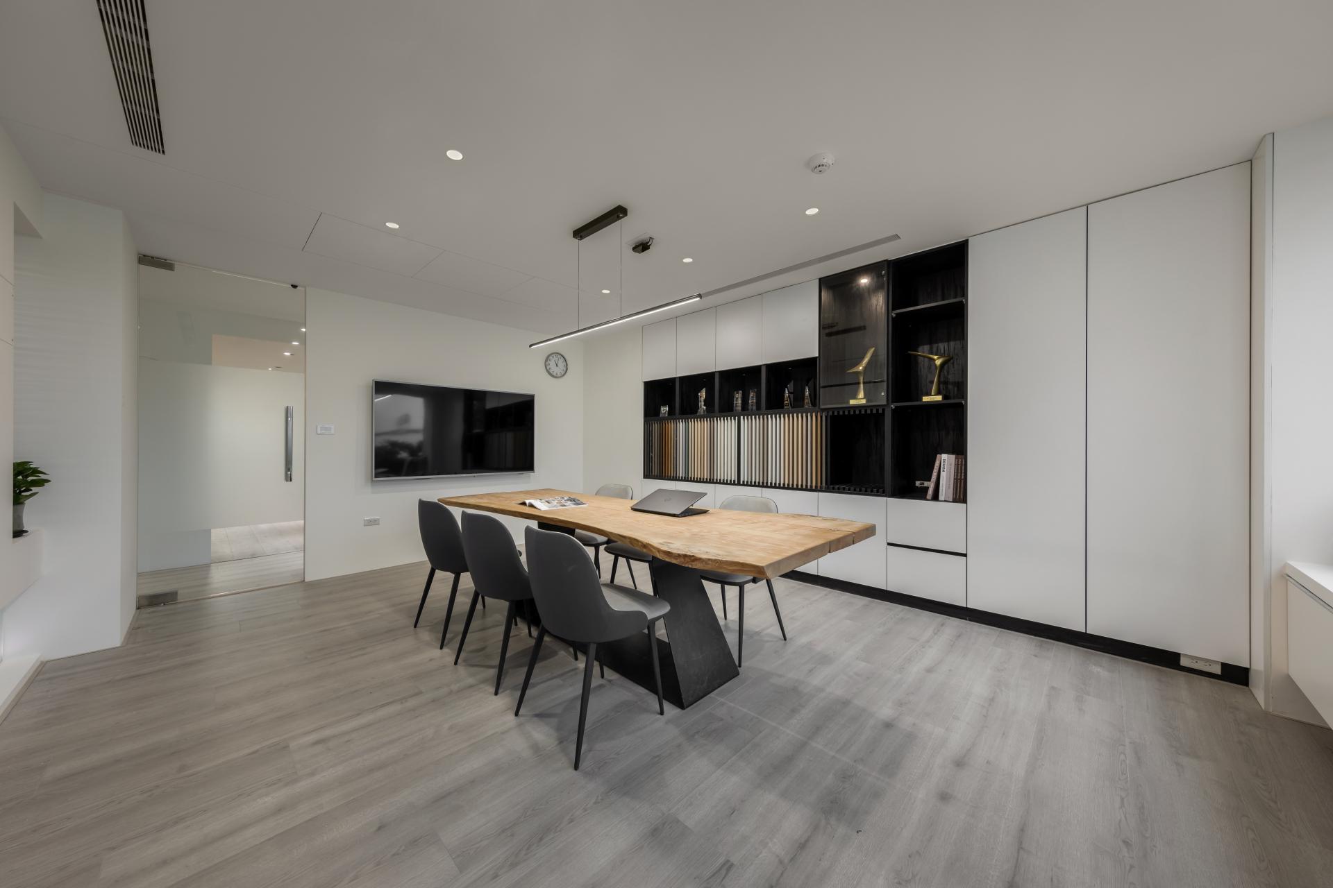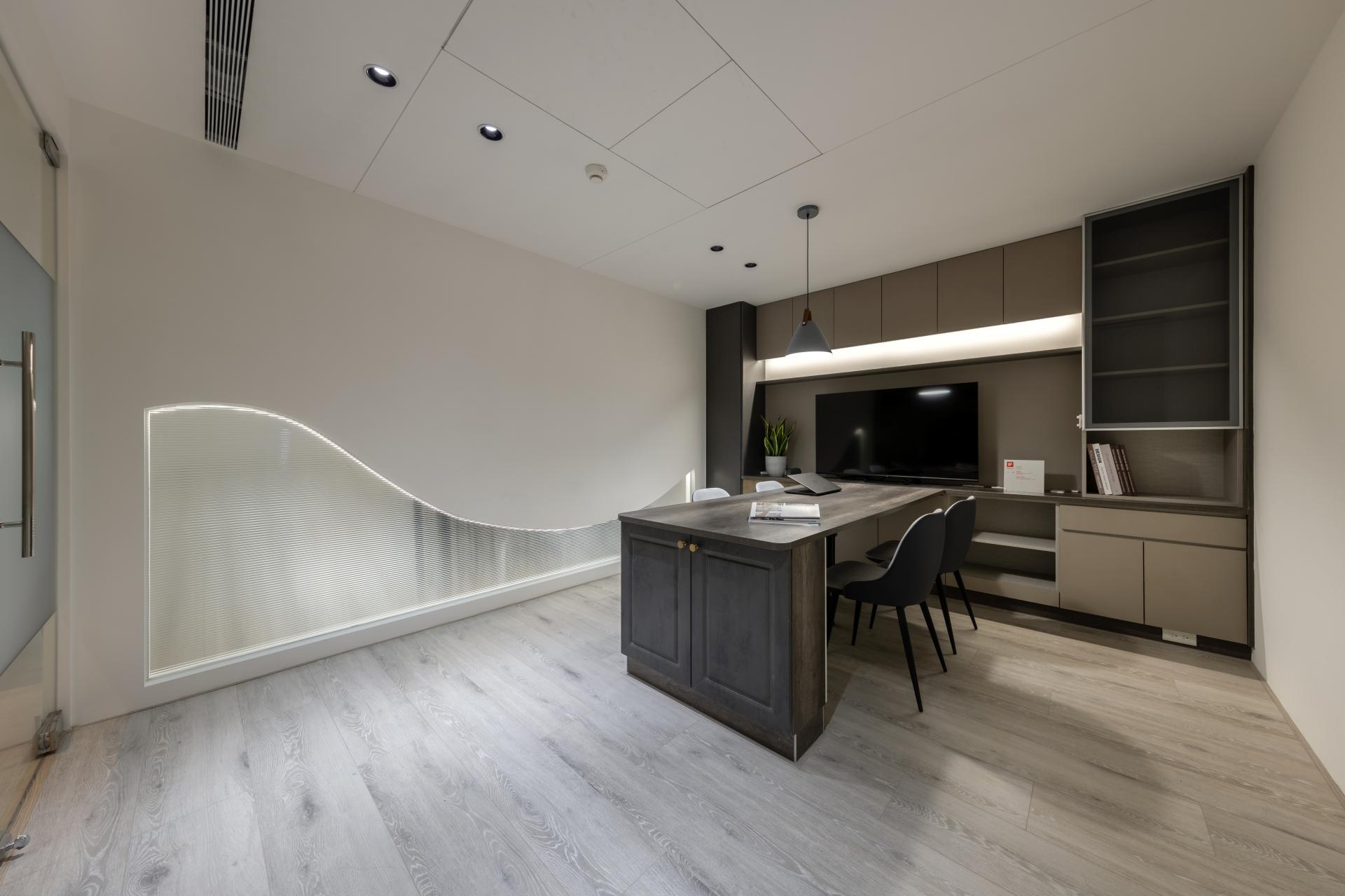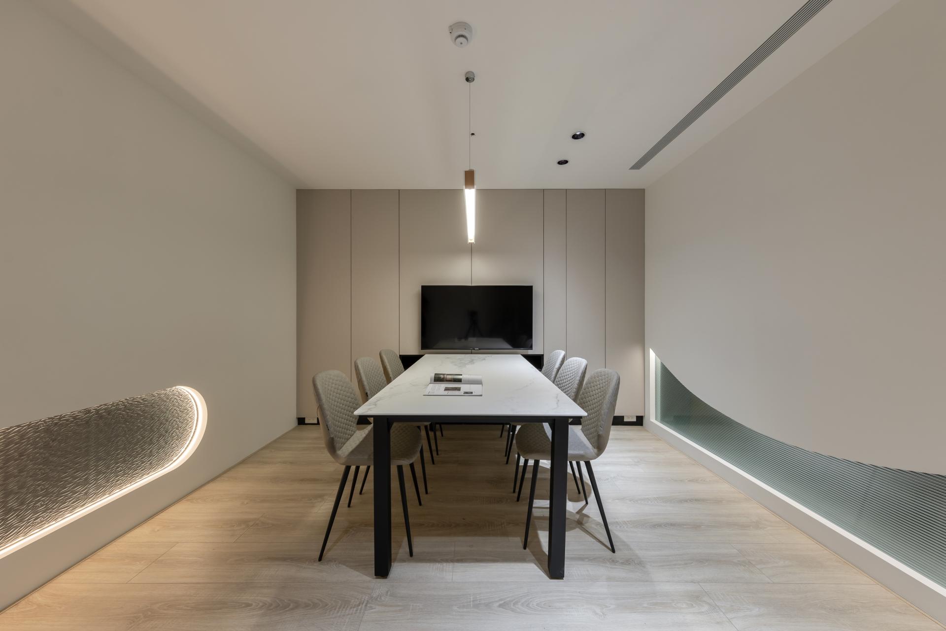 The meeting room explores the theme of light with artistic glass, creating a smooth and fluid look that reflects the idea of "Light Passes, Shadow Fades." At the same time, the cabinetry becomes an artistic centerpiece, blending function and beauty. Together, these elements transform the commercial space into an elegant and practical environment where art and purpose coexist seamlessly.