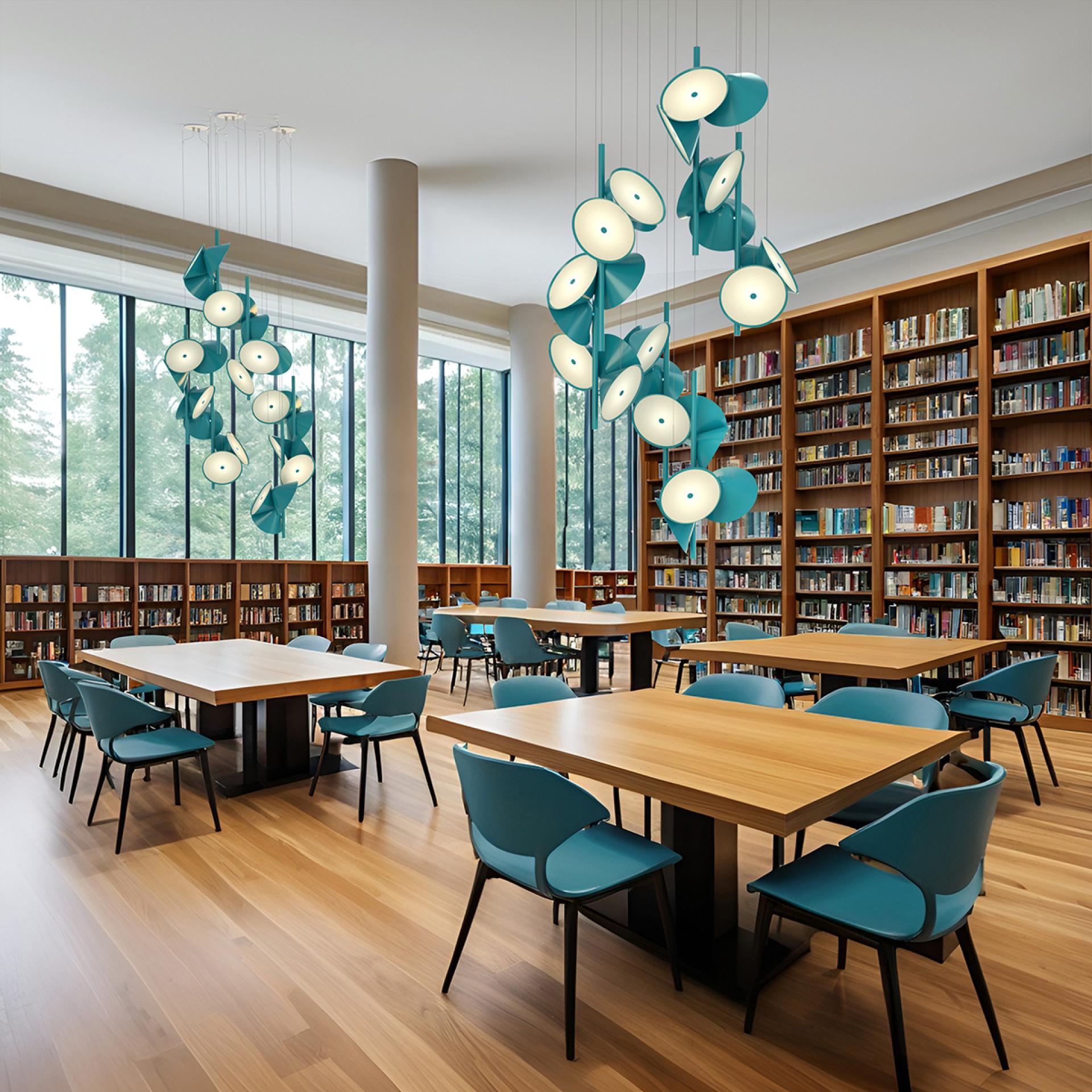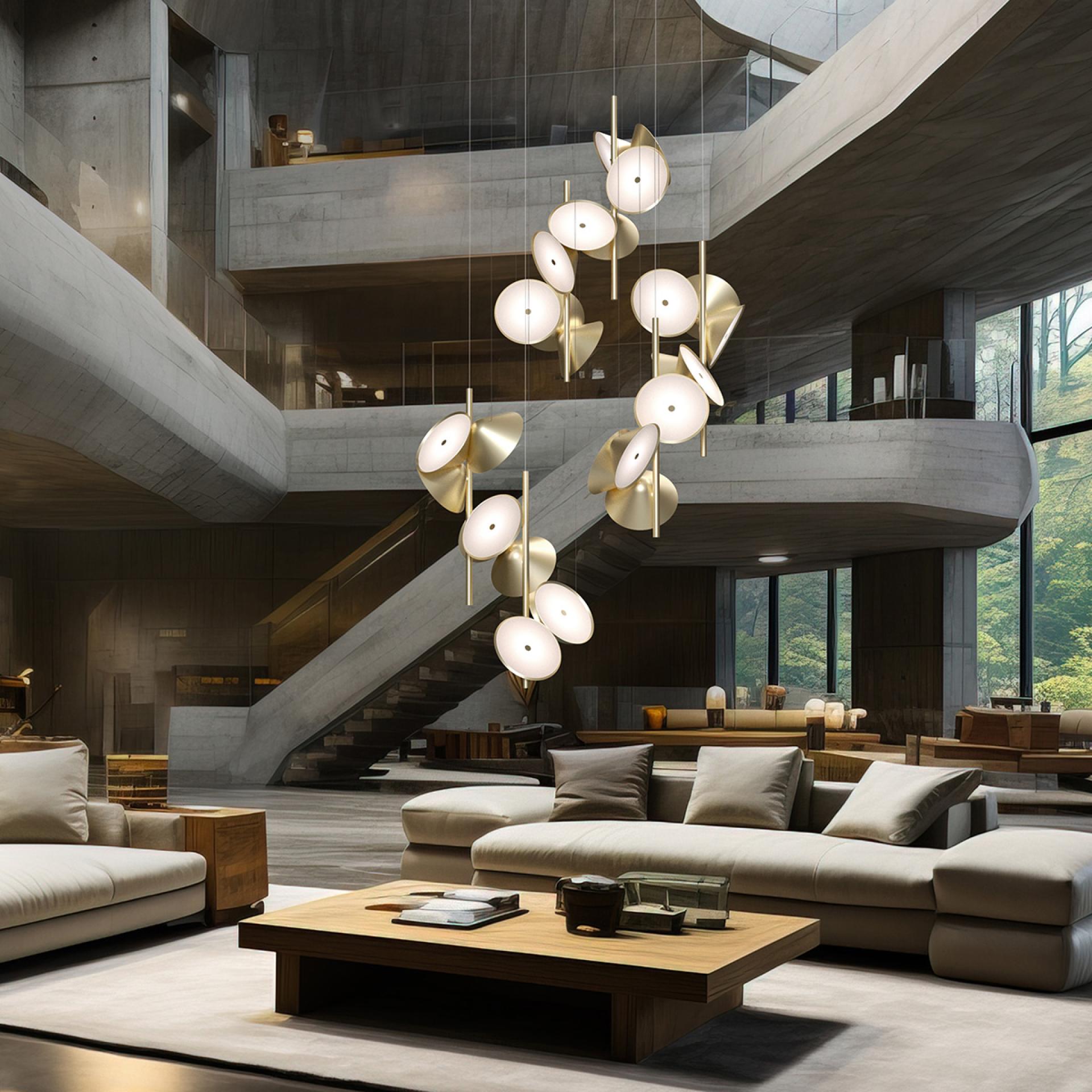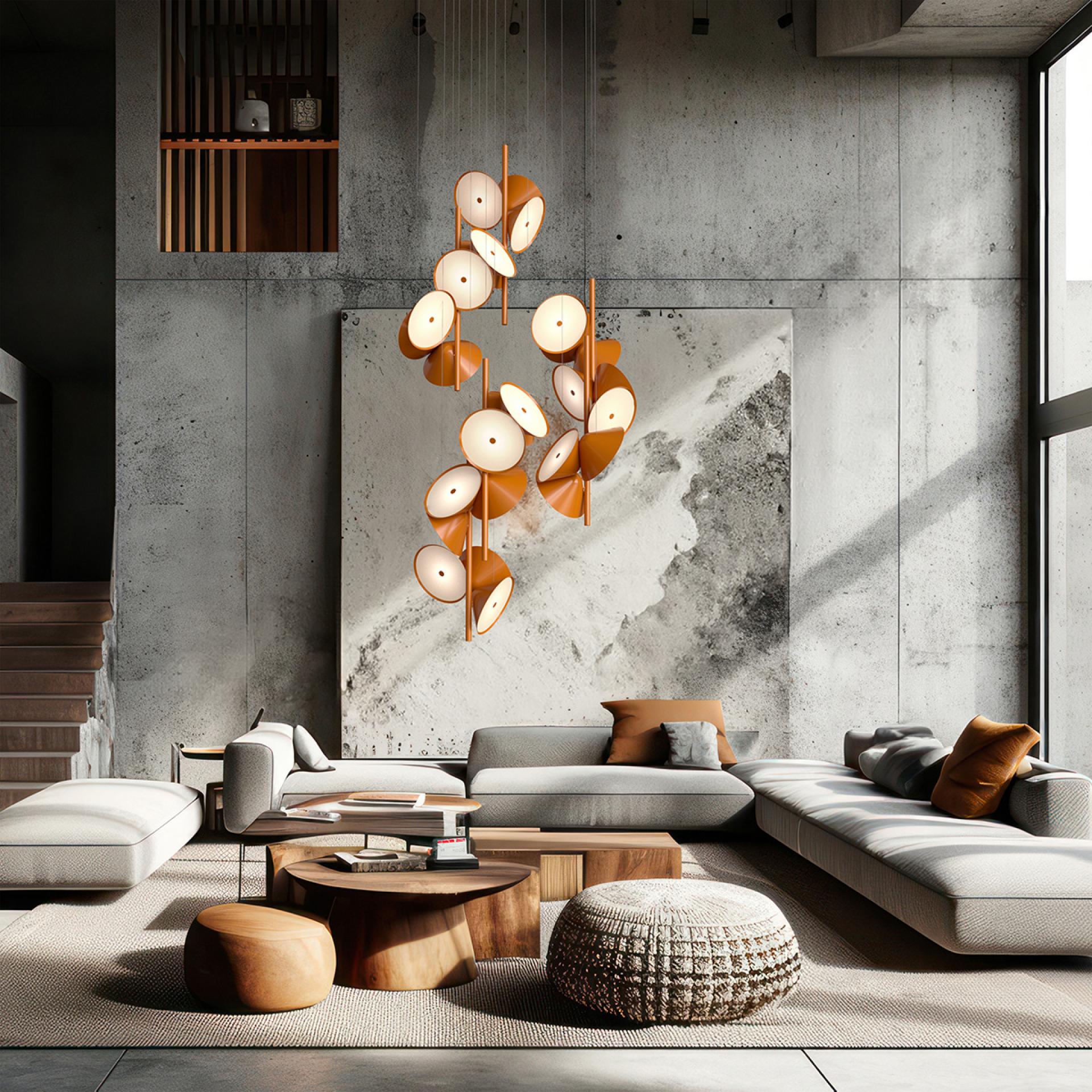 This design beautifully balances the interaction between simplicity and chaos, offering a vibrant and engaging visual experience. A playful sonata of light, Pizzicato custom fixture is fabricated from (9) internally lit interconnected Ø8” x 3.5” metal shades, each with an acrylic diffuser, joined to (2) metal tubes.
