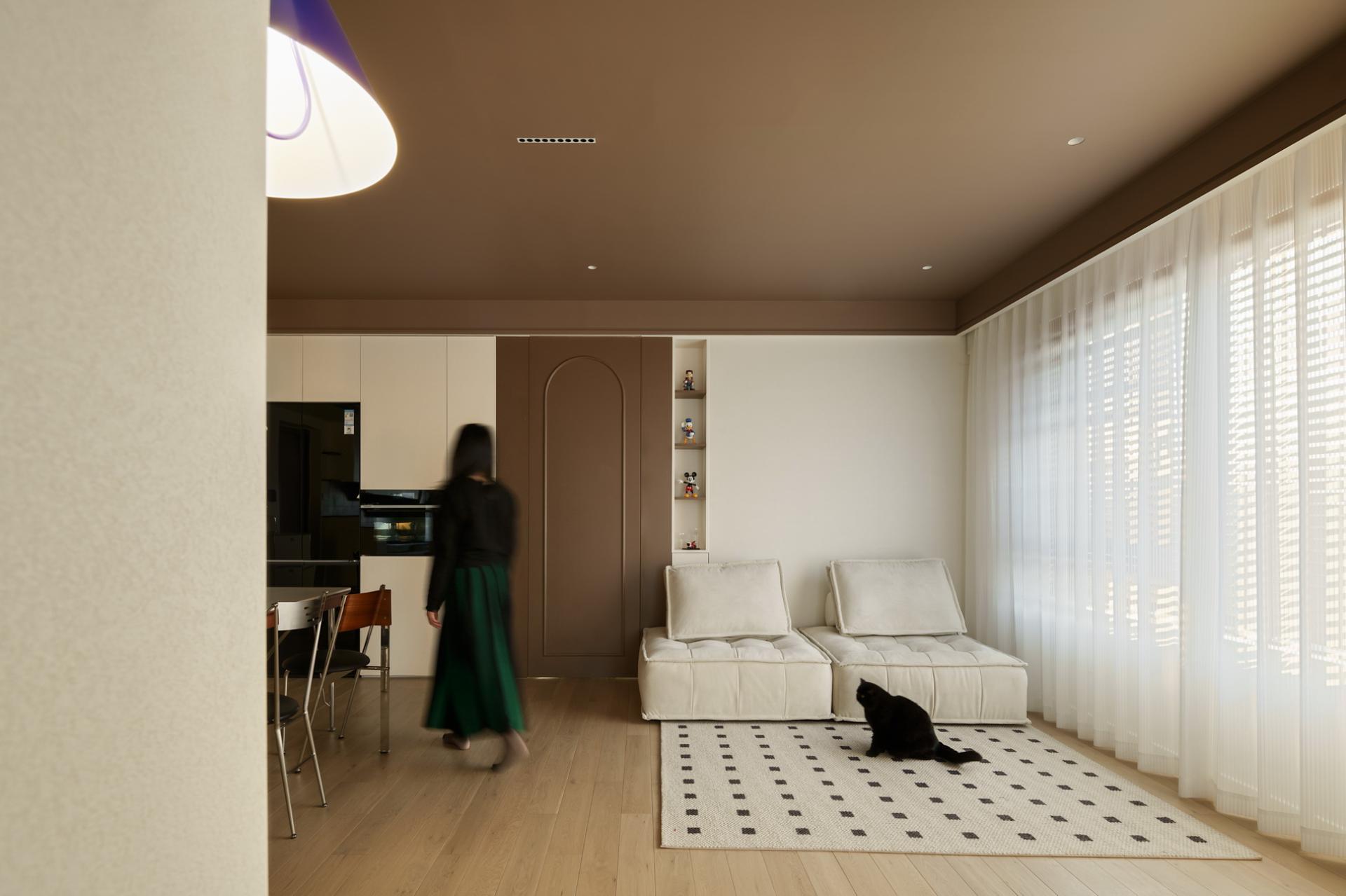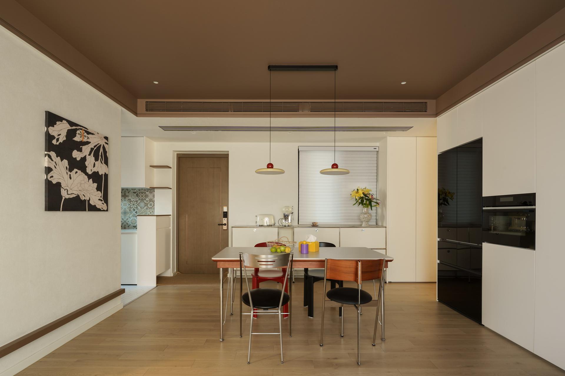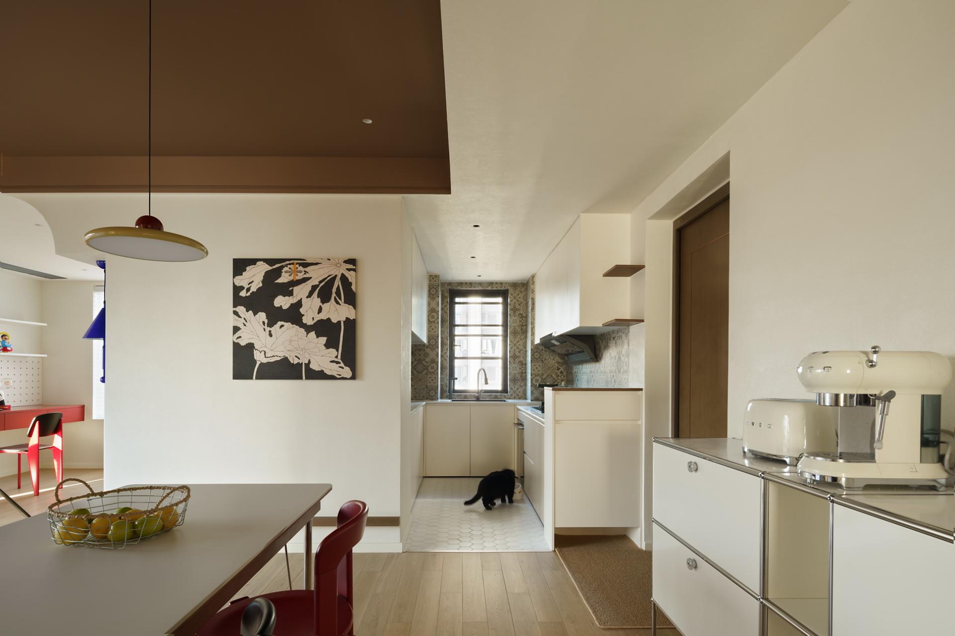 Most of the home space is in simple colors or localized colors. In this case, a large area of chocolate color was used, combined with bright red, making the entire color quite prominent. By using wooden blinds, glass tiles, and open spaces, the sunlight changes and creates a rotation of time in the house. The colors of independent women are diverse, and the vitality of young women is colorful. The original structure of the house did not have a large activity area, and the lighting was weak, so the original layout of one room was abandoned. The open space was relatively "hollow", and the warmth was felt by the occupants through the embrace of color temperature and space. Based on her sleep schedule, I found that the relationship between sunlight and color during her resting time at home, and also used some color contrasts to create an open and rich living experience. The original structure was three rooms, with the living room surrounded by rooms and a kitchen. The lighting was unidirectional, so entering this house was very oppressive and the light was relatively dim. In the early design stage, I observed the changes in lighting in the house over time for several days. When planning the space, I directly opened a room and modified the structure of the kitchen space, allowing sunlight to reach the living room area to a greater extent. The same color has different effects on different materials, so the material supplier needs to compare various samples, and the production team needs to agree on cabinet door panels and customize red bricks of different specifications for repeated comparison, and then make the best choice. Improve the utilization rate of natural lighting in the space to reduce electricity consumption during the day without the need for lighting equipment; The required materials are mainly purchased locally, reducing transportation costs.