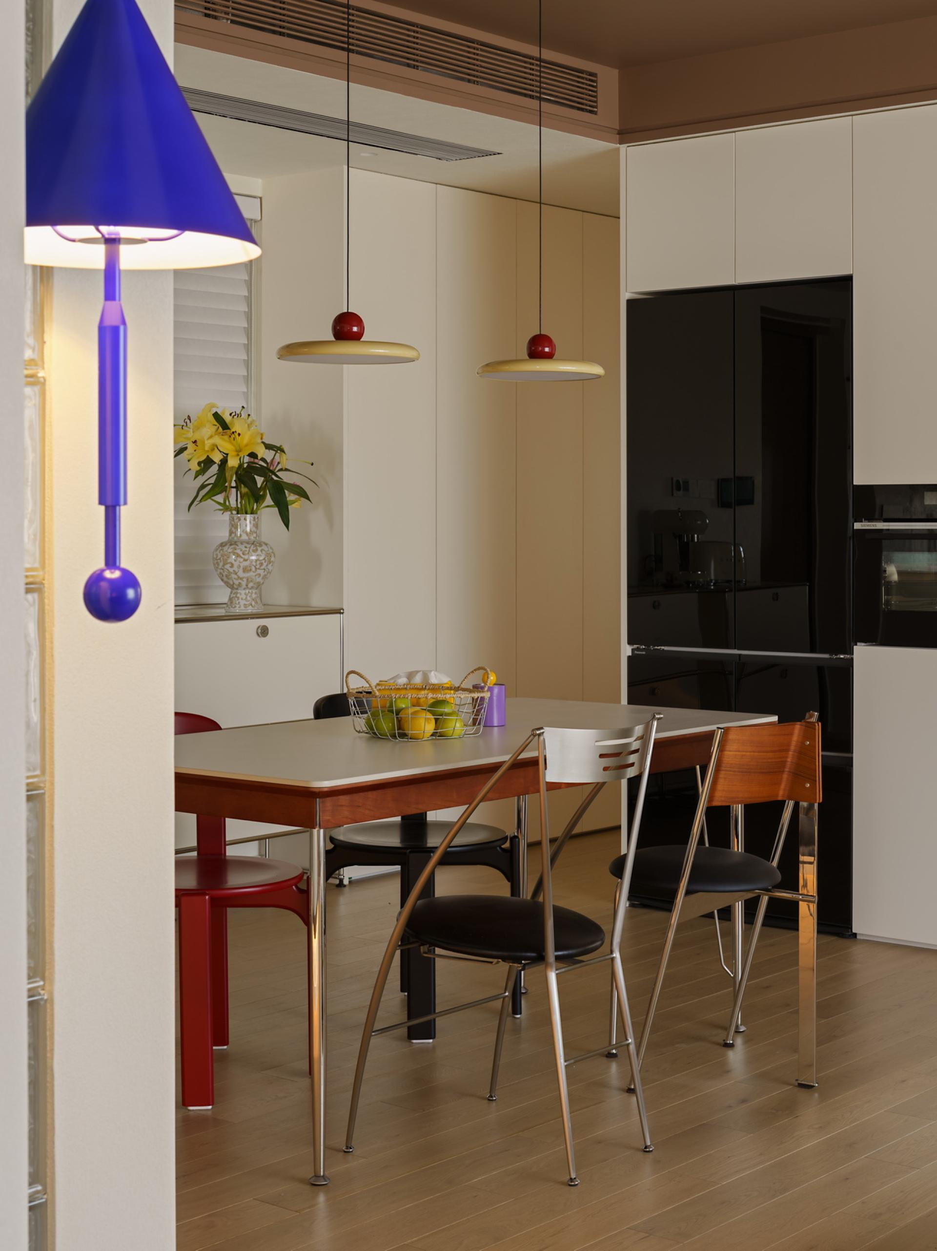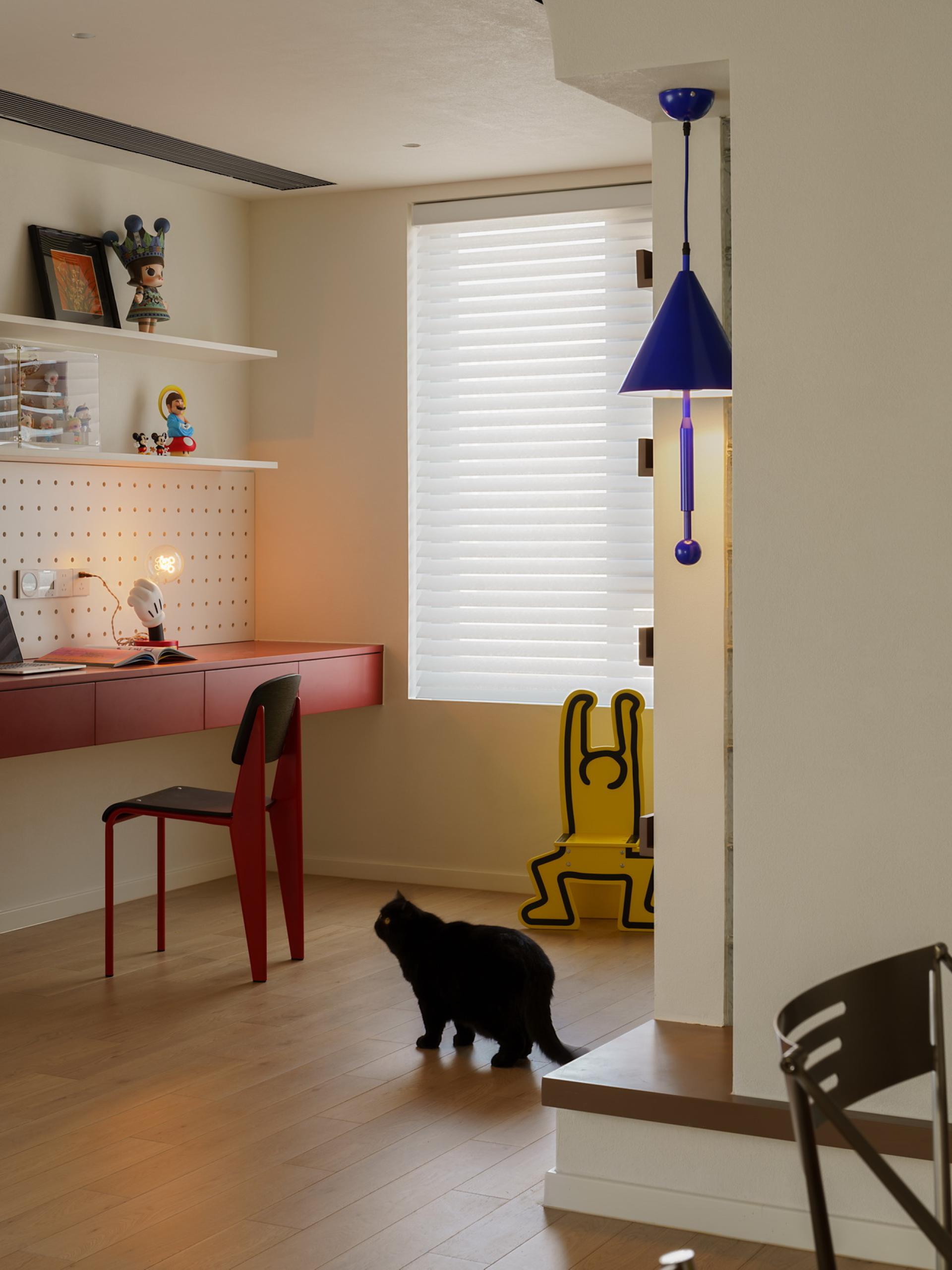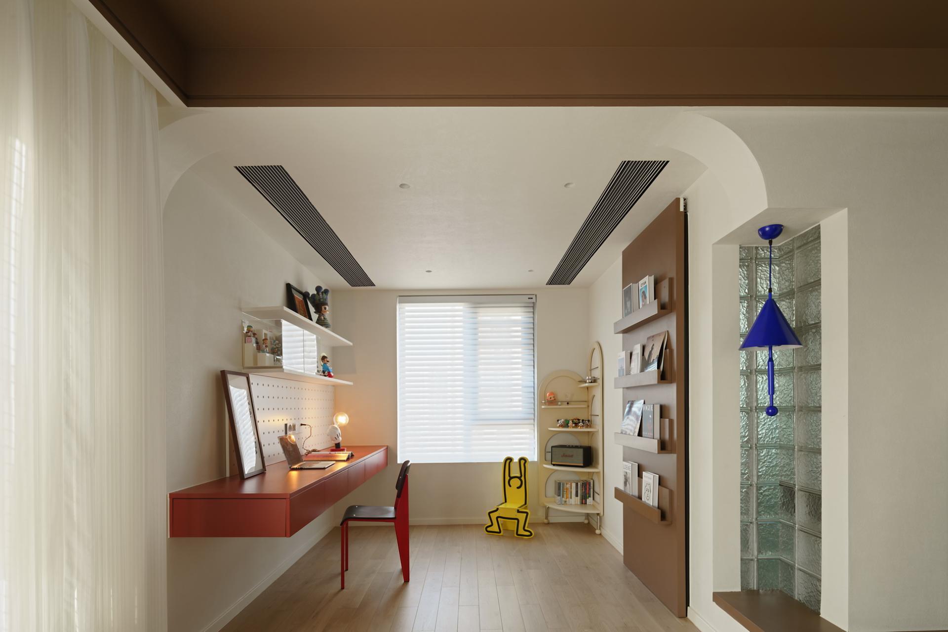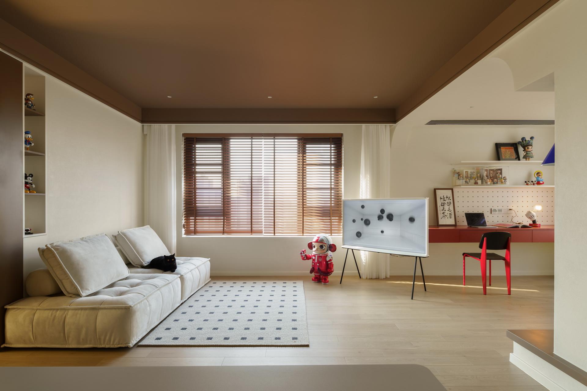 Most of the home space is in simple colors or localized colors. In this case, a large area of chocolate color was used, combined with bright red, making the entire color quite prominent. By using wooden blinds, glass tiles, and open spaces, the sunlight changes and creates a rotation of time in the house. The colors of independent women are diverse, and the vitality of young women is colorful. The original structure of the house did not have a large activity area, and the lighting was weak, so the original layout of one room was abandoned. The open space was relatively "hollow", and the warmth was felt by the occupants through the embrace of color temperature and space. Based on her sleep schedule, I found that the relationship between sunlight and color during her resting time at home, and also used some color contrasts to create an open and rich living experience. The original structure was three rooms, with the living room surrounded by rooms and a kitchen. The lighting was unidirectional, so entering this house was very oppressive and the light was relatively dim. In the early design stage, I observed the changes in lighting in the house over time for several days. When planning the space, I directly opened a room and modified the structure of the kitchen space, allowing sunlight to reach the living room area to a greater extent. The same color has different effects on different materials, so the material supplier needs to compare various samples, and the production team needs to agree on cabinet door panels and customize red bricks of different specifications for repeated comparison, and then make the best choice. Improve the utilization rate of natural lighting in the space to reduce electricity consumption during the day without the need for lighting equipment; The required materials are mainly purchased locally, reducing transportation costs.