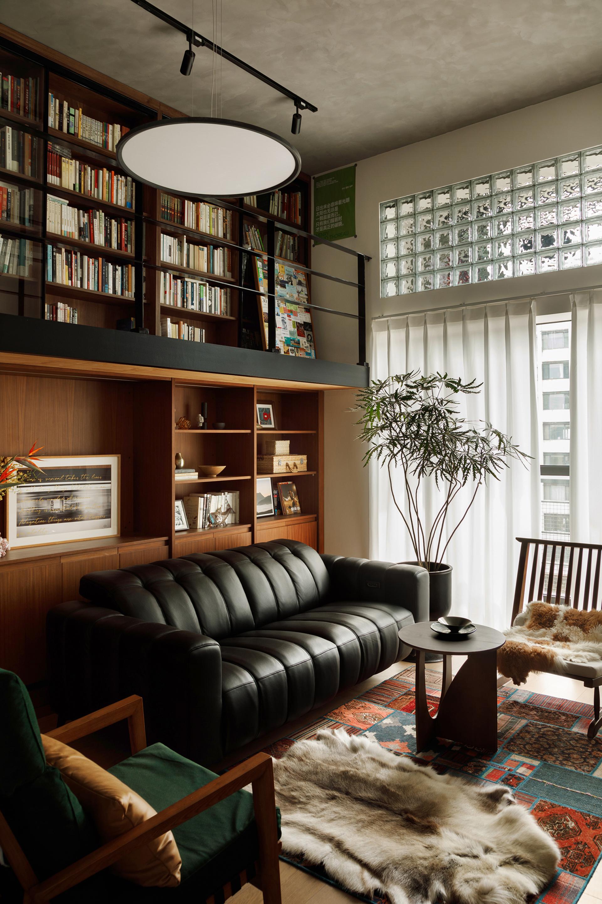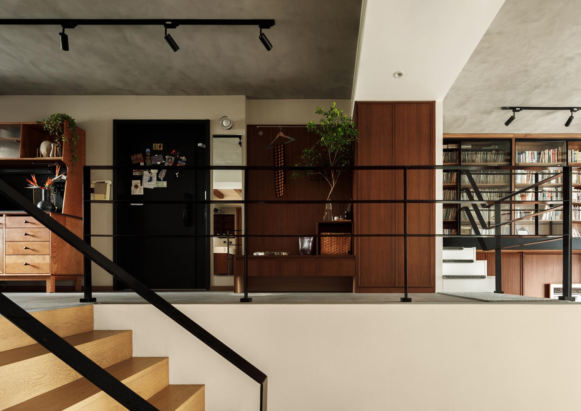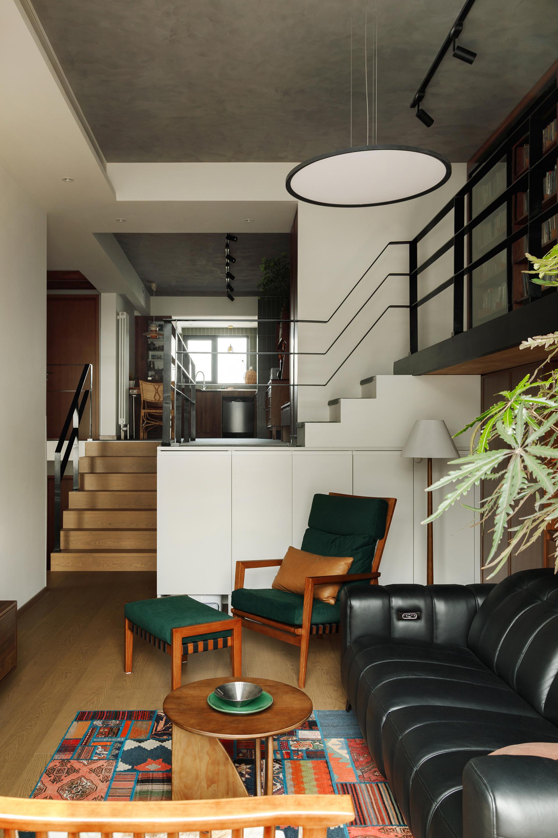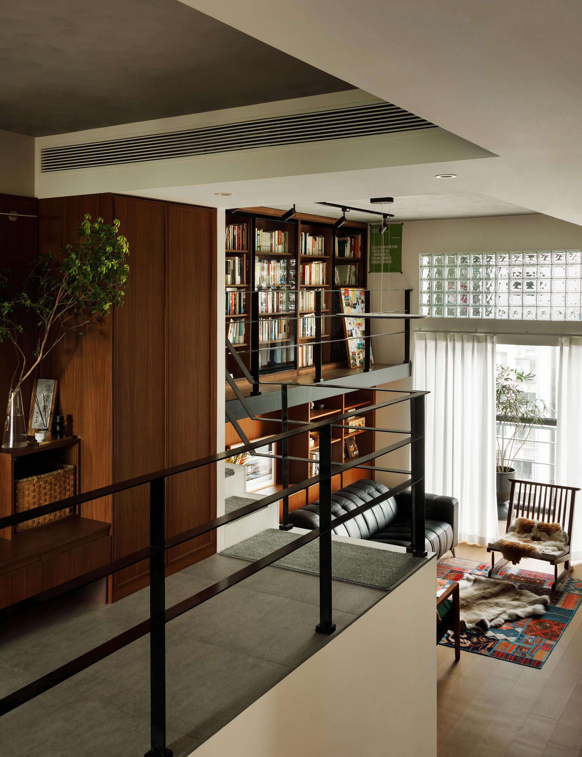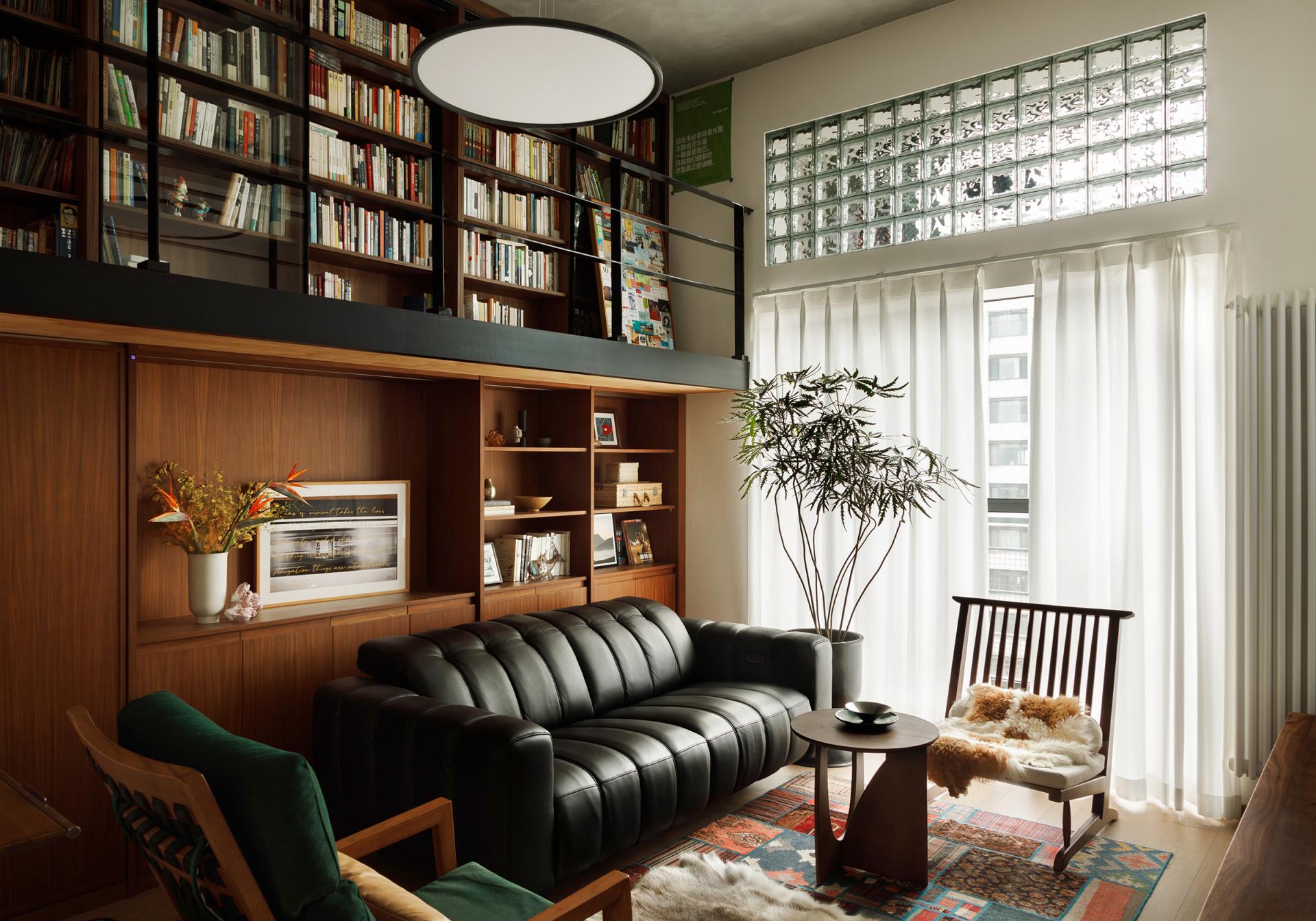 The residence is located in Daxing District, Beijing, and is a high-rise residential renovation project with an interior area of 110㎡. The living room and master bedroom have a ceiling height of 3.5 meters, while the remaining spaces have a standard ceiling height. The design introduces a mezzanine structure in the living room’s double-height area, which serves as a reading loft for the homeowner's book collection. Additionally, a staircase-cabinet design has been incorporated to connect the entry level to the reading loft, solving the circulation issue without taking up living room space—an efficient and multifunctional solution. Meanwhile, the lower, shorter space is filled with display cabinets that showcase the homeowner’s passion for films, books, and hiking, reflecting their spiritual world. The entire space utilizes cool materials such as concrete, metal, and glass bricks to balance the abundance of wood elements, creating a home that exudes neutral aesthetics while remaining warm and comfortable.