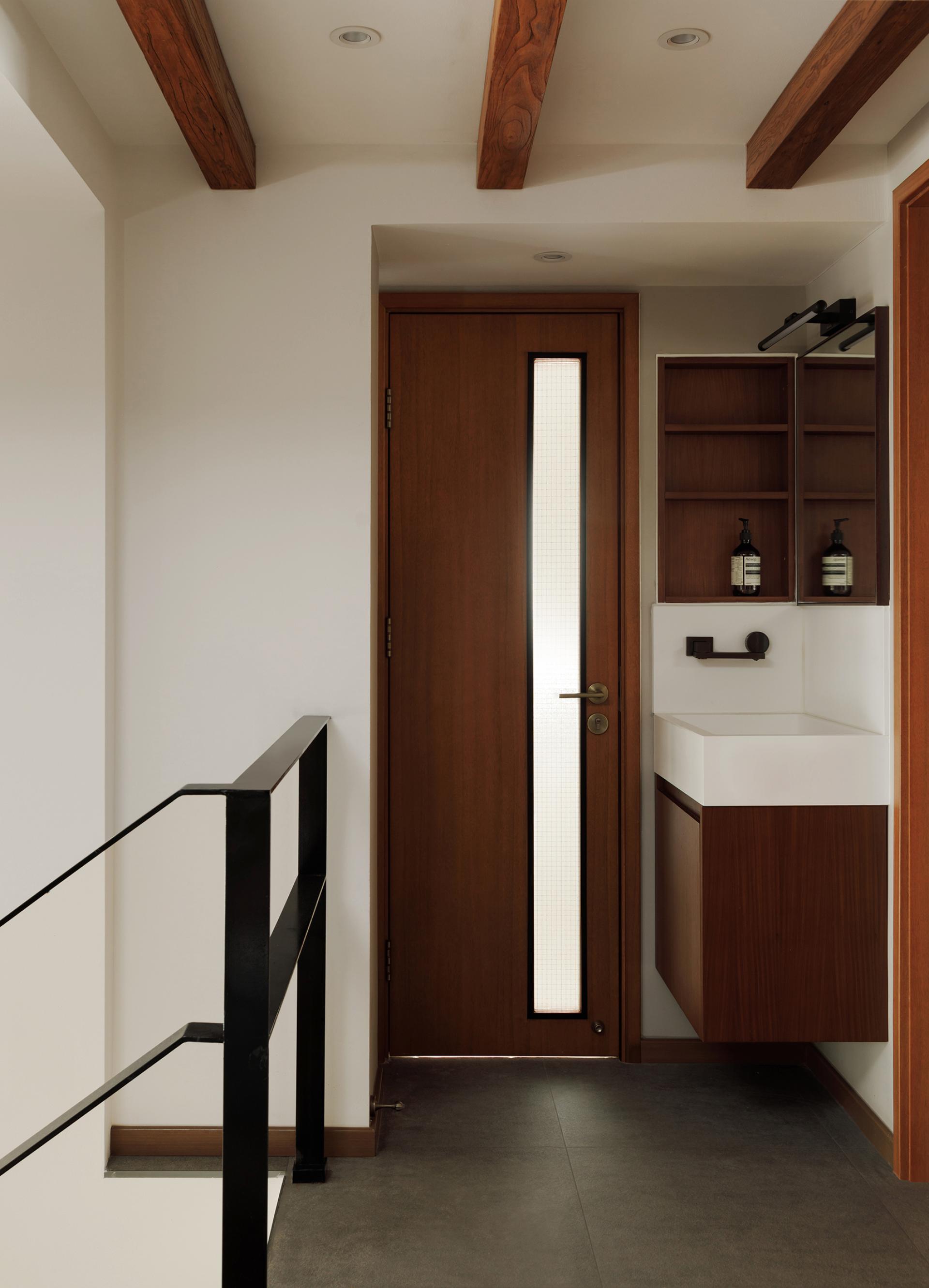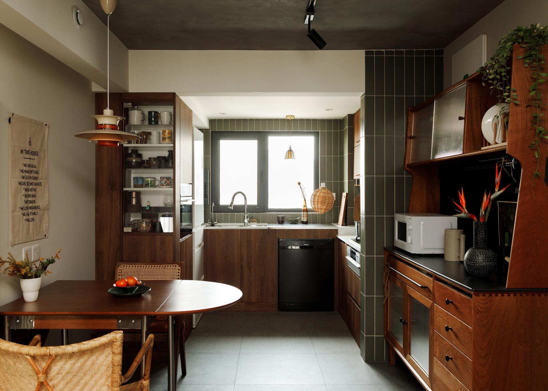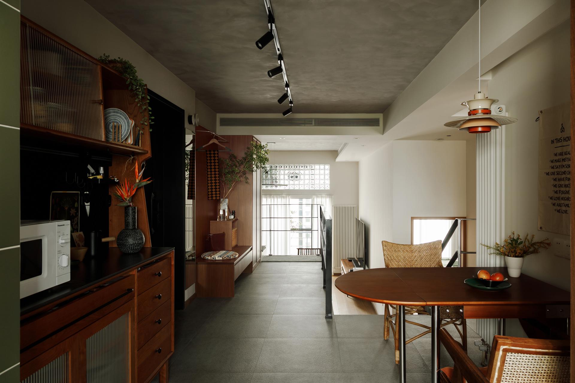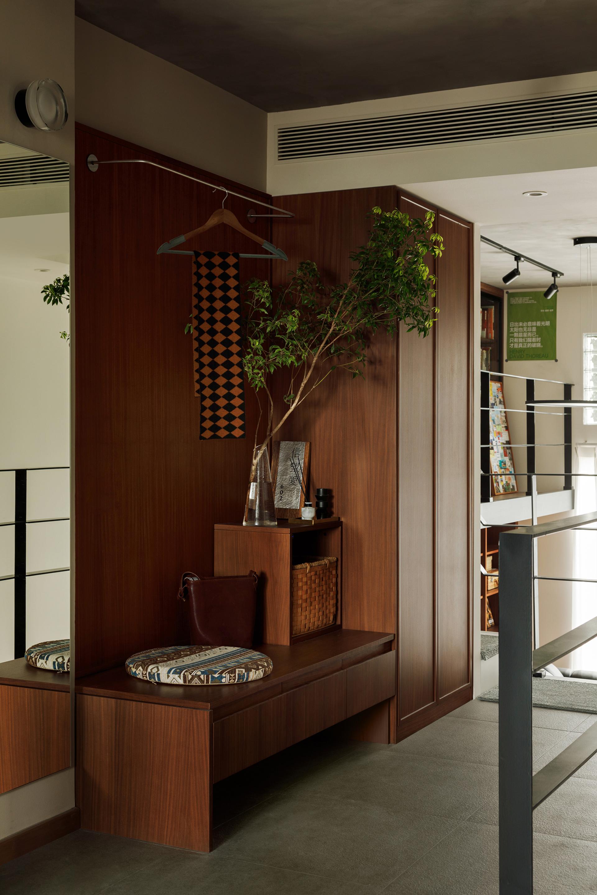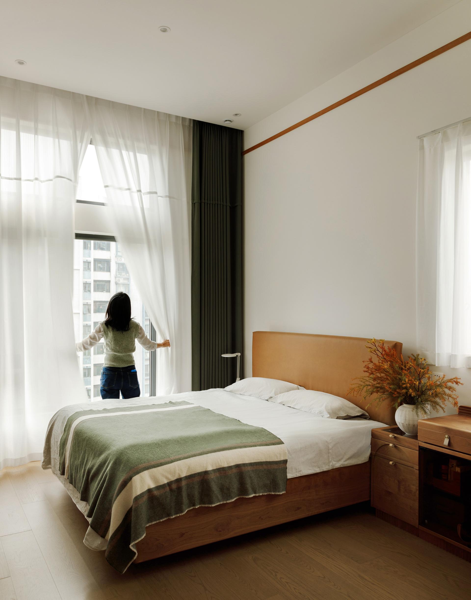 The residence is located in Daxing District, Beijing, and is a high-rise residential renovation project with an interior area of 110㎡. The living room and master bedroom have a ceiling height of 3.5 meters, while the remaining spaces have a standard ceiling height. The design introduces a mezzanine structure in the living room’s double-height area, which serves as a reading loft for the homeowner's book collection. Additionally, a staircase-cabinet design has been incorporated to connect the entry level to the reading loft, solving the circulation issue without taking up living room space—an efficient and multifunctional solution. Meanwhile, the lower, shorter space is filled with display cabinets that showcase the homeowner’s passion for films, books, and hiking, reflecting their spiritual world. The entire space utilizes cool materials such as concrete, metal, and glass bricks to balance the abundance of wood elements, creating a home that exudes neutral aesthetics while remaining warm and comfortable.