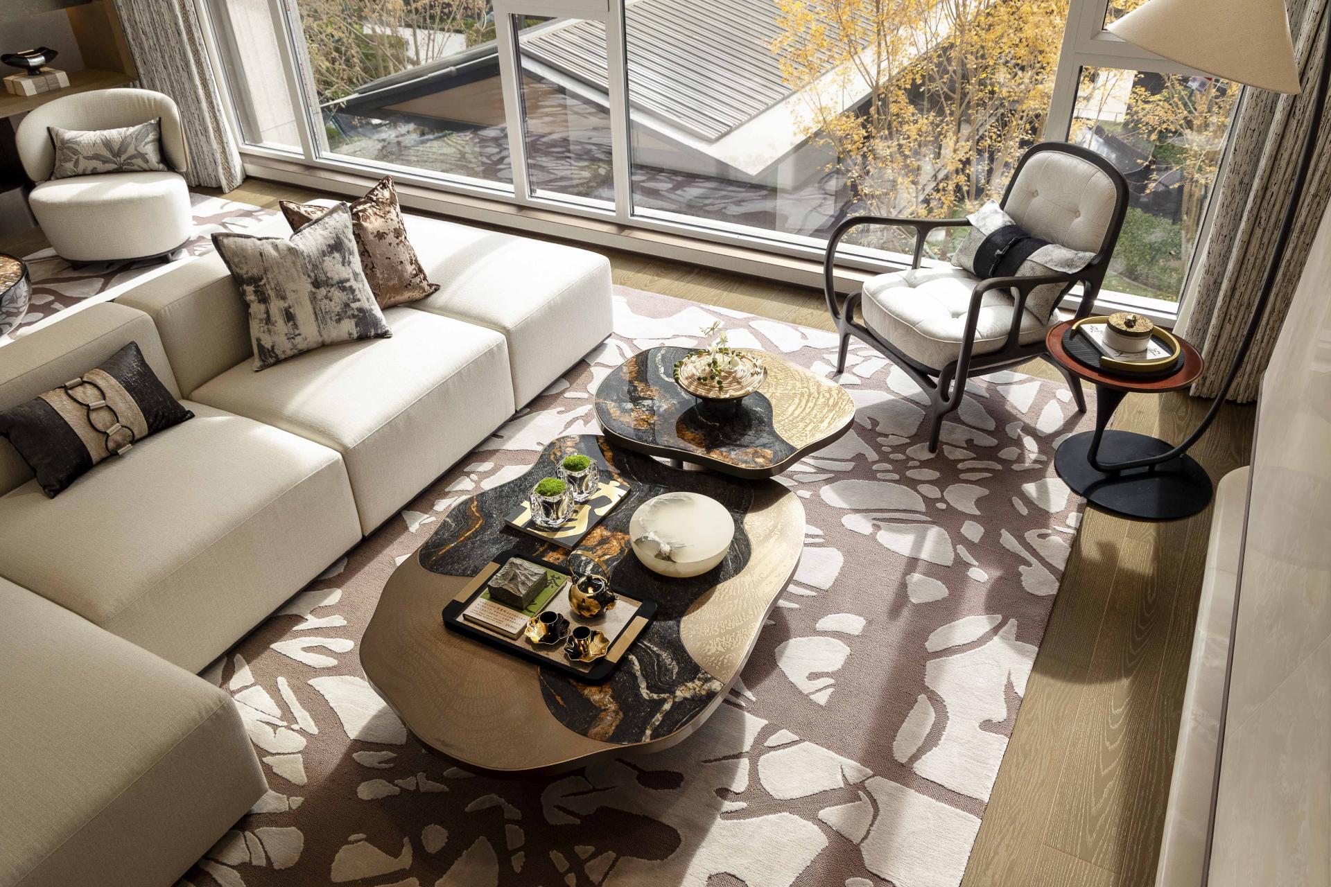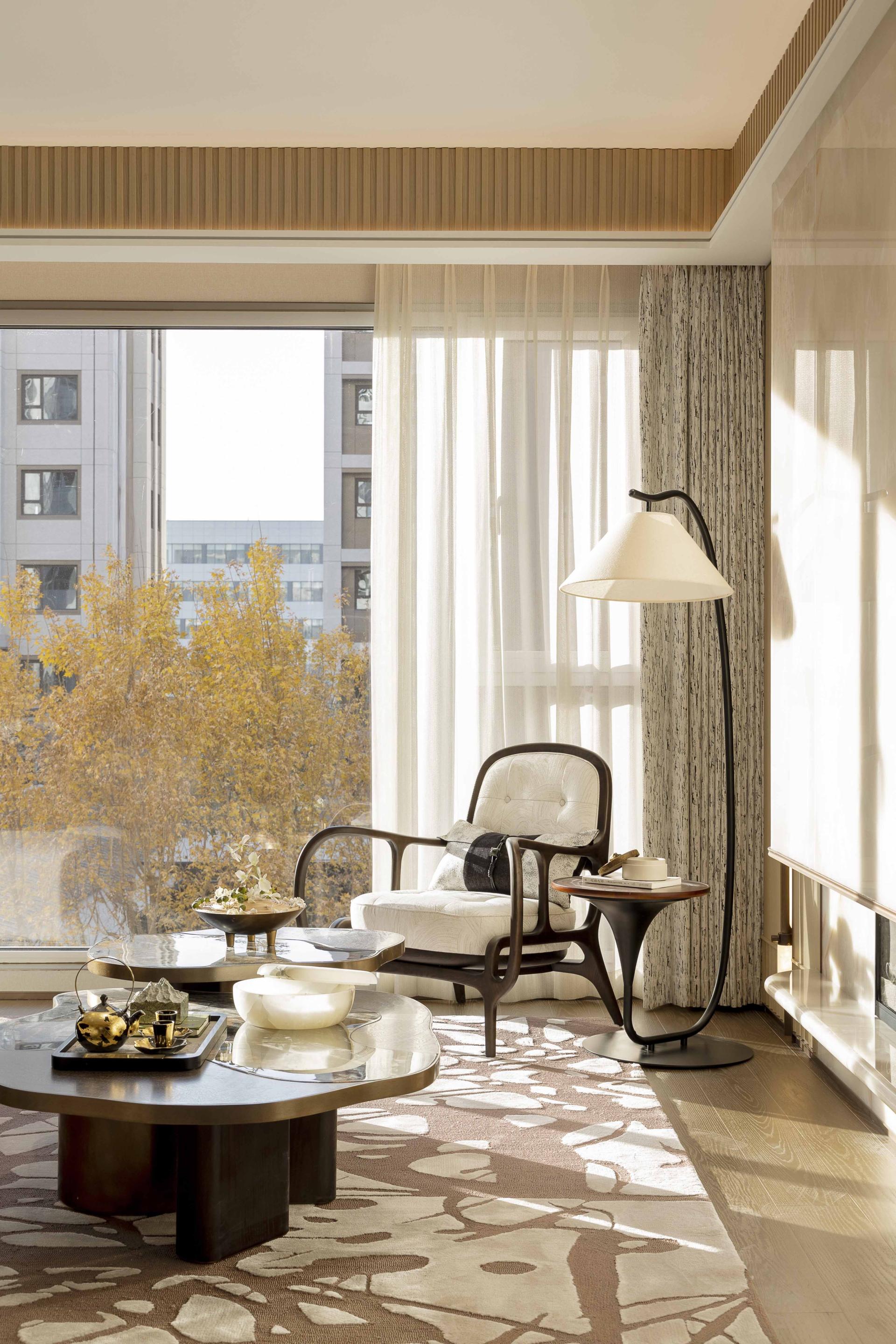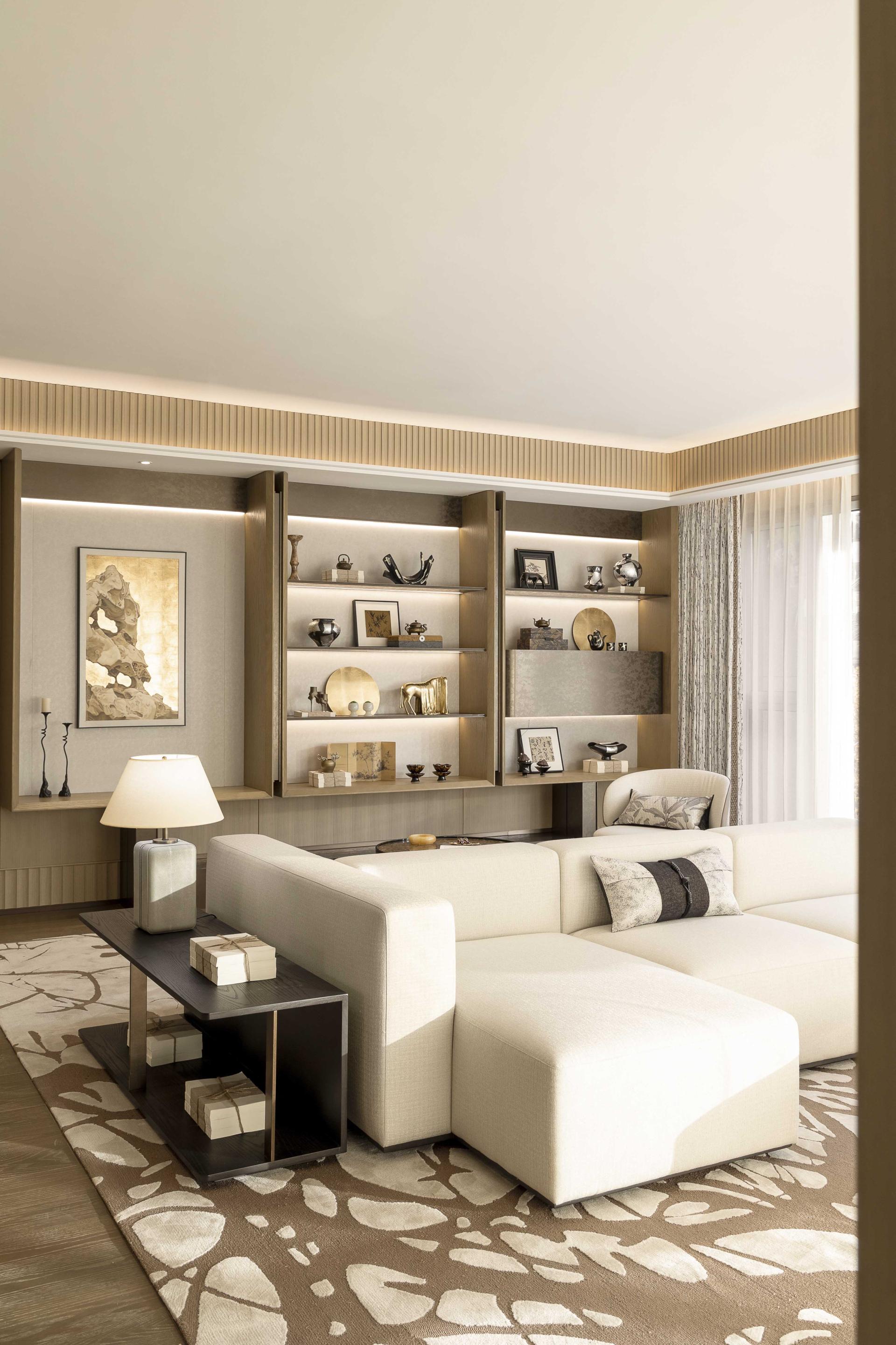 The living room breaks away from the conventional patterns of traditional living spaces. The boundaries between the living room, dining area, and study are blurred, offering a fresh and distinctive spatial experience. The space is primarily adorned with wood finishes, white jade, and wall fabrics. Floor-to-ceiling windows connect the interior with the outdoor garden, creating a sense of transparency and allowing natural light and shadow, greenery, and natural materials to blend, enhancing the spatial hierarchy while breathing in the essence of nature. Neutral colors dominate, with simple, large block-shaped furniture selected to increase the flexibility and practicality of the space. Minimalist decorations and art pieces are used to add an artistic touch, while high-quality fabric curtains and carpets in soft colors add warmth, presenting the most natural and comfortable home atmosphere.