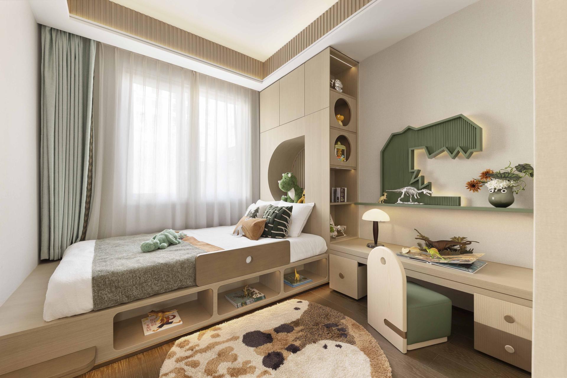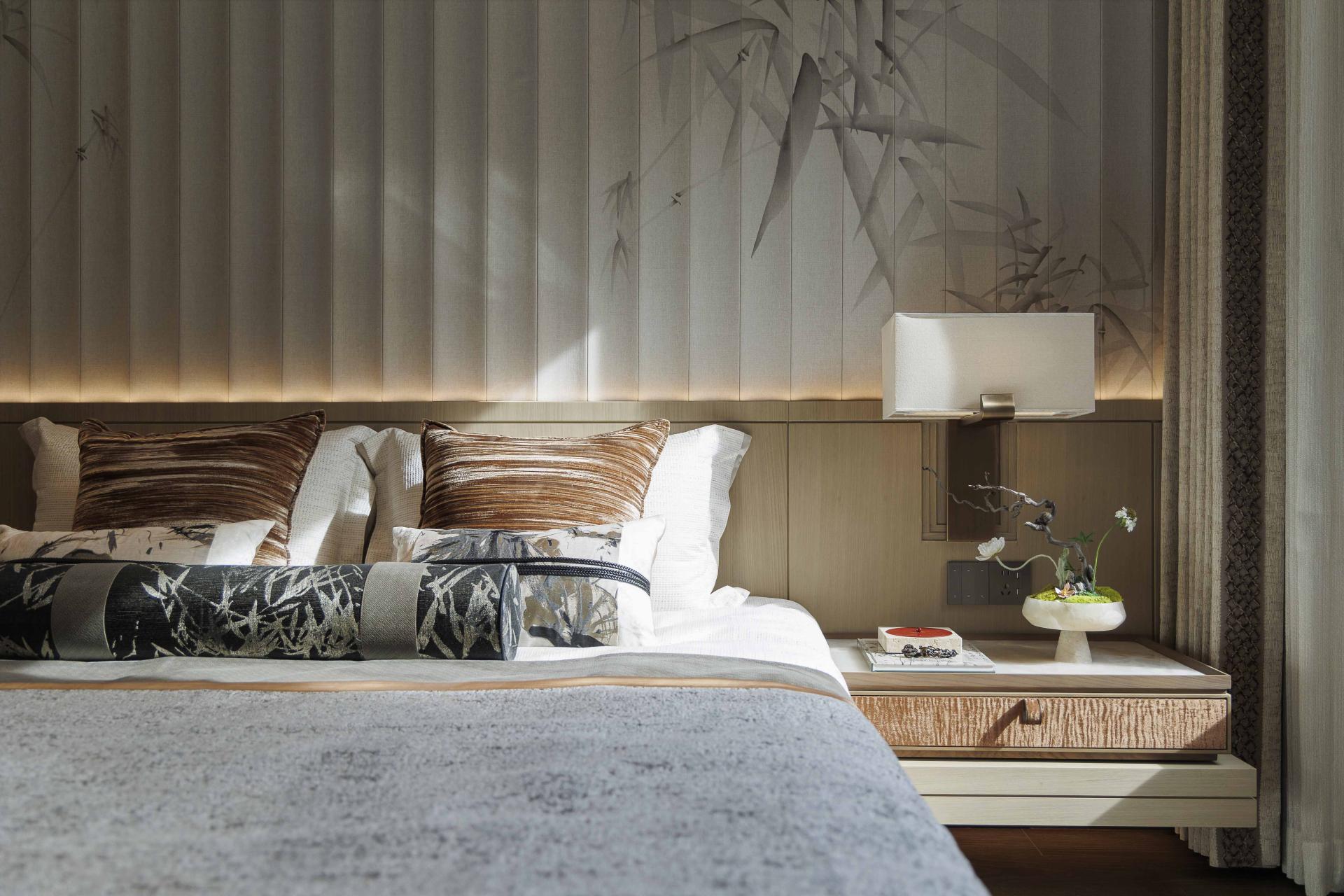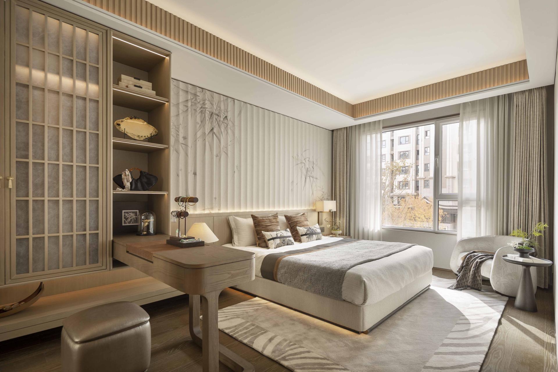 The bedroom focuses on privacy with an independent layout. The bed backdrop features a bamboo shadow pattern that exudes a calm and steady temperament, striving to create a microcosm of Eastern elegance merged with modernity. Soft furnishings and fabrics are chosen in soft tones and textured materials, allowing the resting space to blend nature and rhythm into modern design.