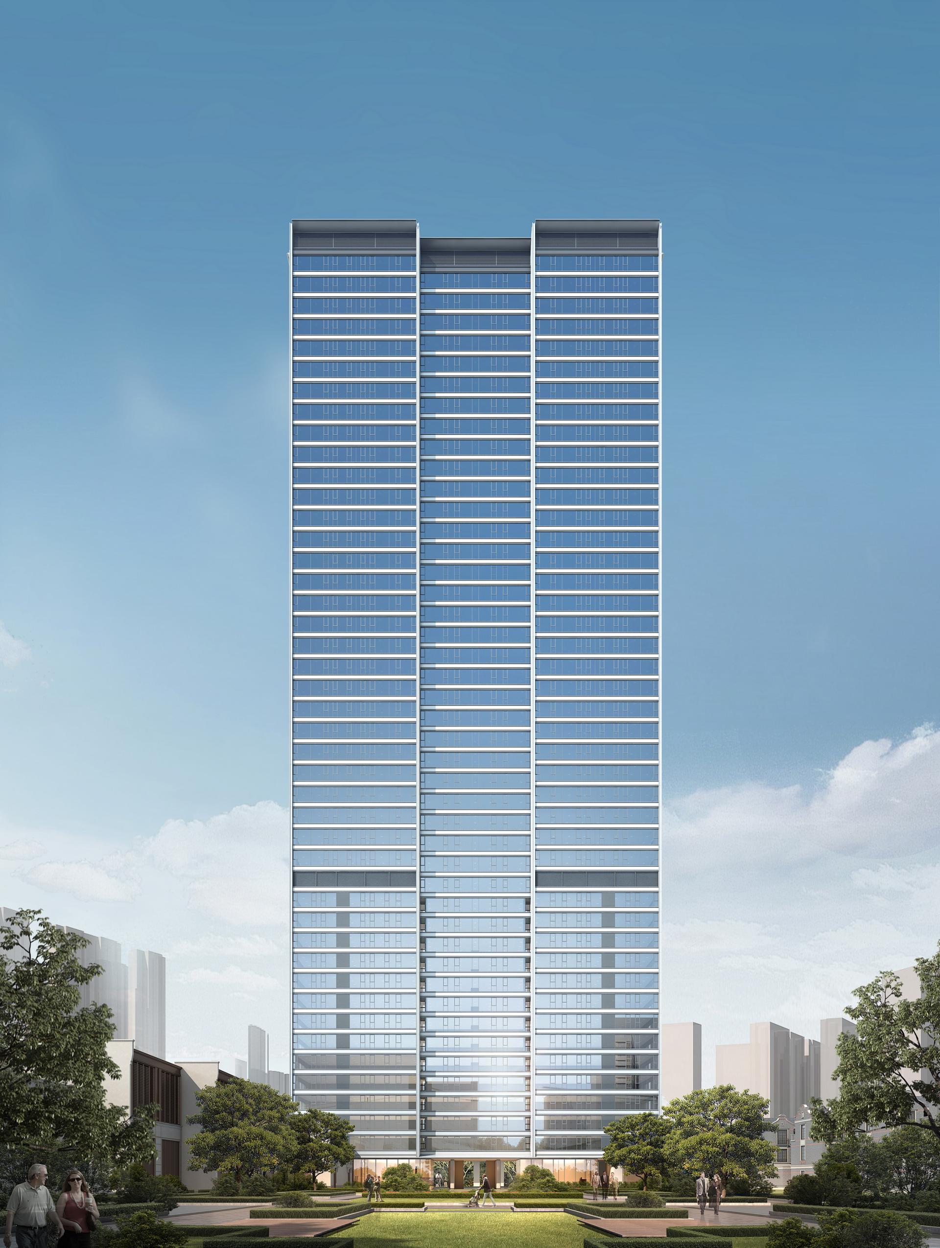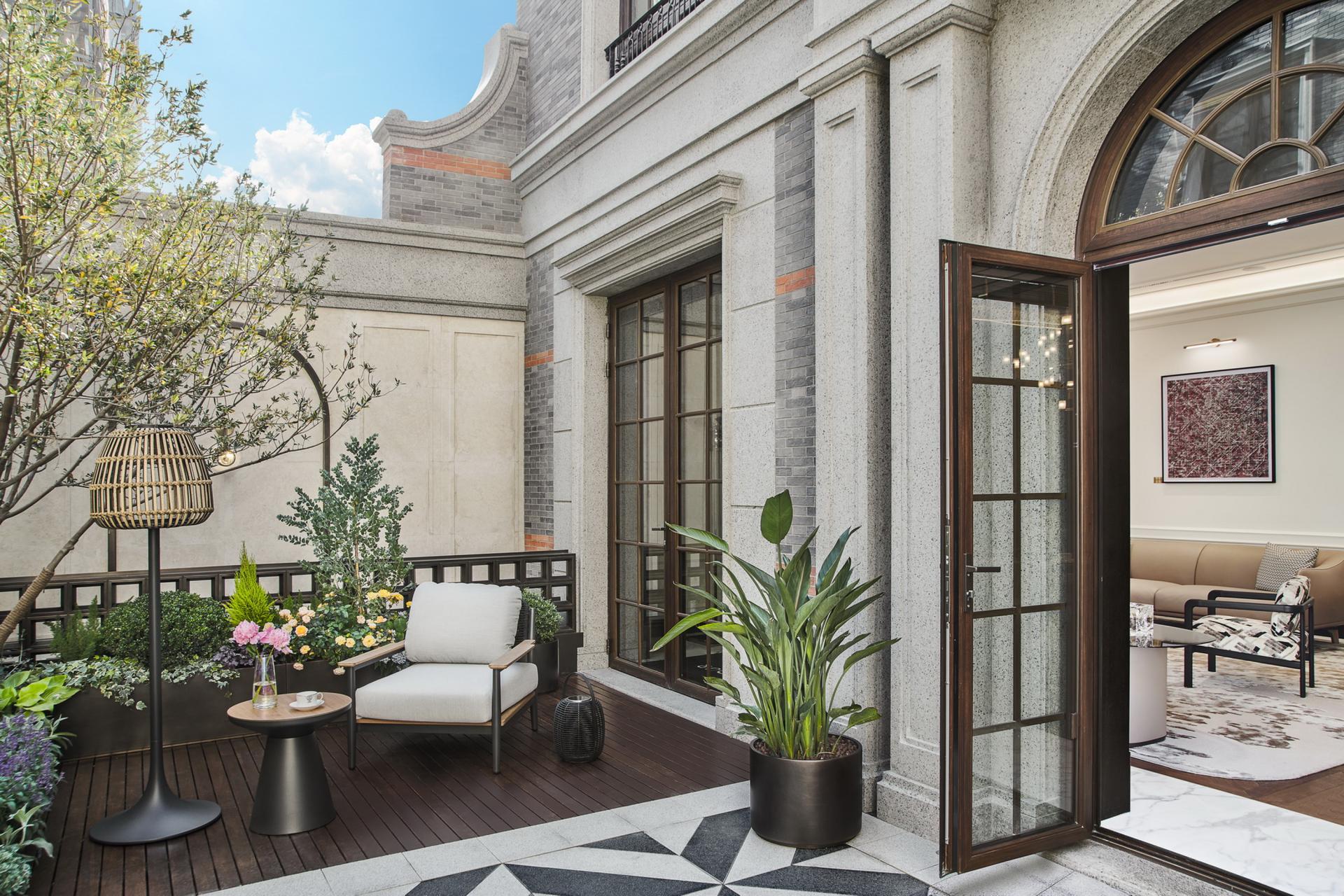 The high-rise building facade features aluminum panels and glass, while the lower level uses materials that evoke a sense of age, such as clay masonry, stone, and water-brushed granite. Drawing inspiration from classic Shanghai Shikumen buildings, the architectural form interprets the cultural essence of the "New Shanghai-style." Meticulously designed with attention to detail, the railing, floral patterns, rainwater pipes, wind caps, and various other components reflect the proportions and embellishments of traditional architecture.