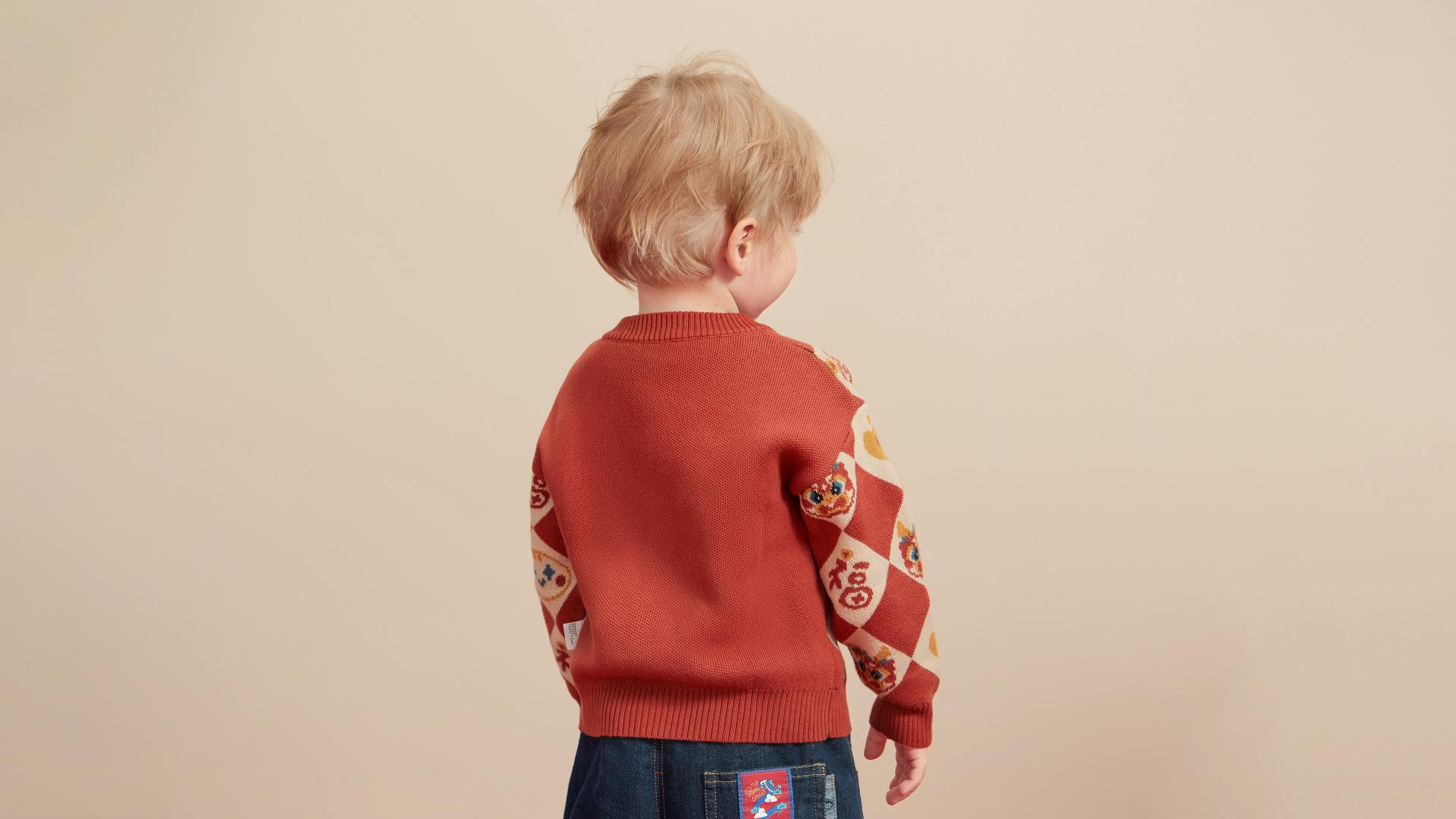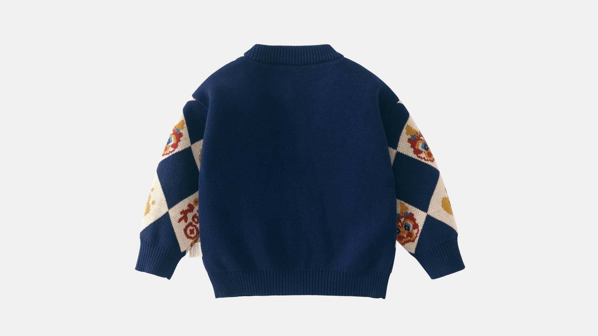 Drawing inspiration from the mythical Kirin, a benevolent creature described in The Classic of Mountains and Seas, this cardigan captures the Kirin’s auspicious symbolism while modernizing its iconic traits. The dragon-like head, lion-like eyes, and tiger-like back are “adorably” transformed into playful, cartoonish patterns that resonate with children. By intertwining these motifs with classic argyle checks and auspicious elements like gold ingots and vibrant sunshine, the design pays homage to Chinese heritage while appealing to contemporary aesthetics.