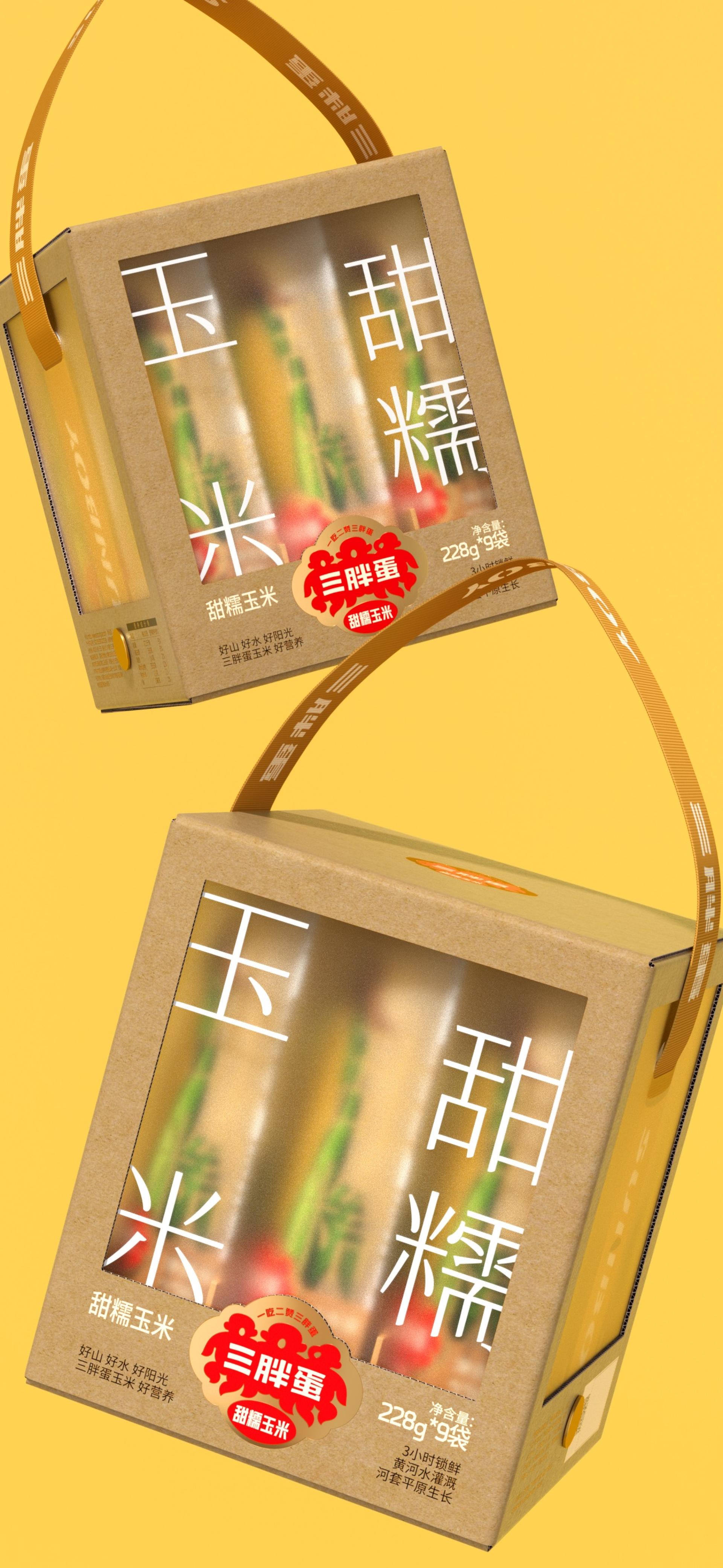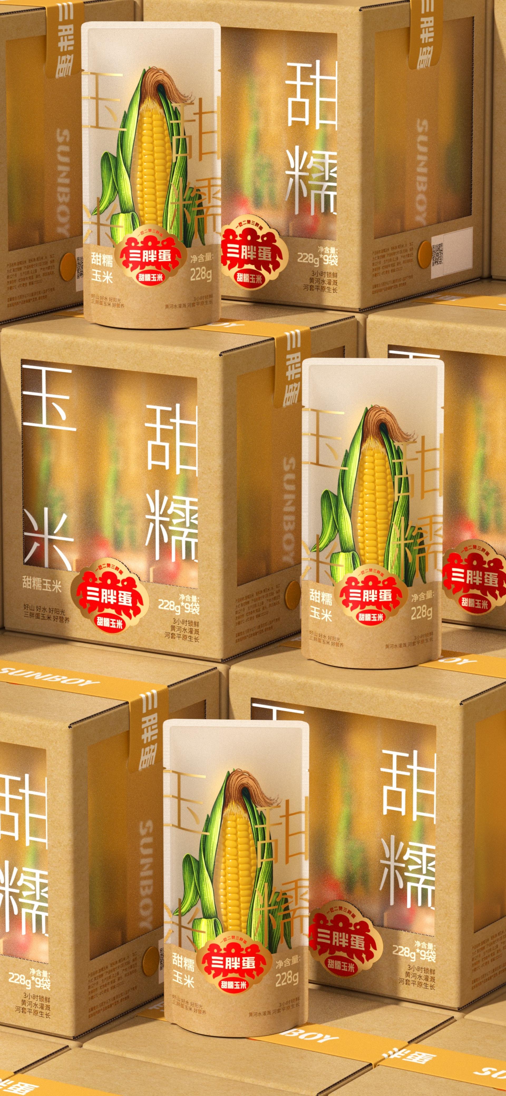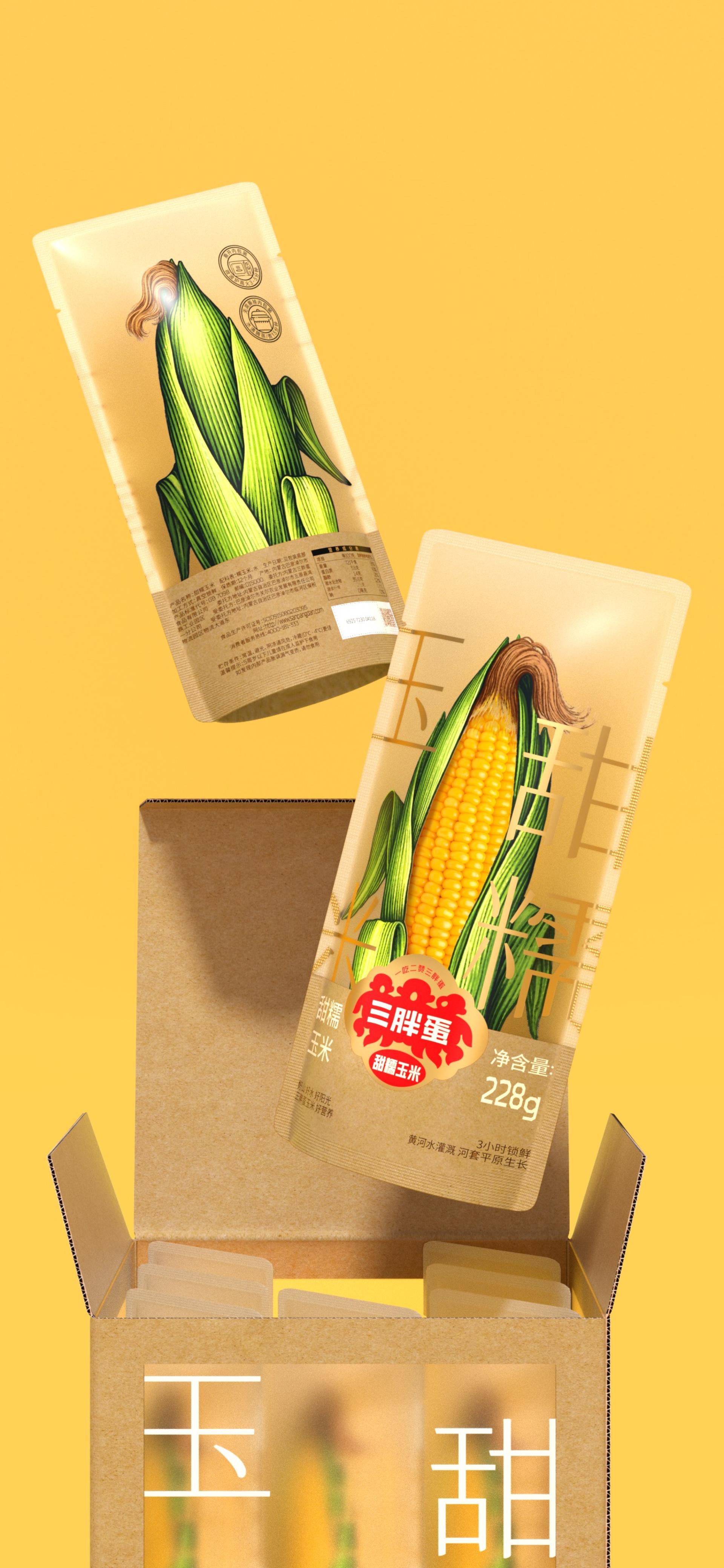 The design features a fresh ear of corn, utilizing transparent PVC material combined with corrugated kraft paper to vividly convey the product's natural freshness. The minimalist earthy tones enhance the brand’s approachable, warm image, bringing the product's "plain beauty" to life. The design also adds a modern, fashionable touch through the combination of gift box aesthetics and craft materials, offering a contemporary twist to agricultural packaging.