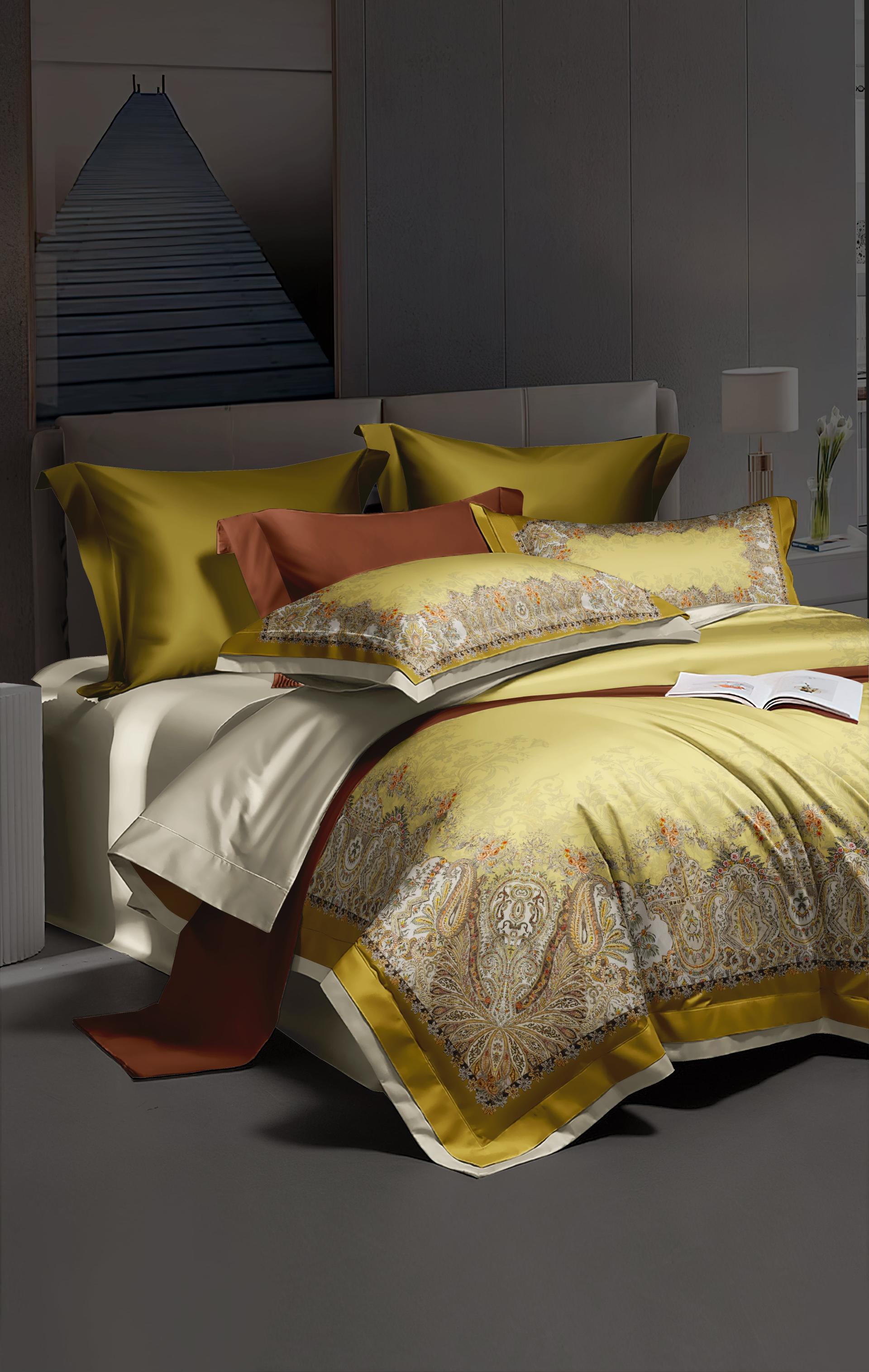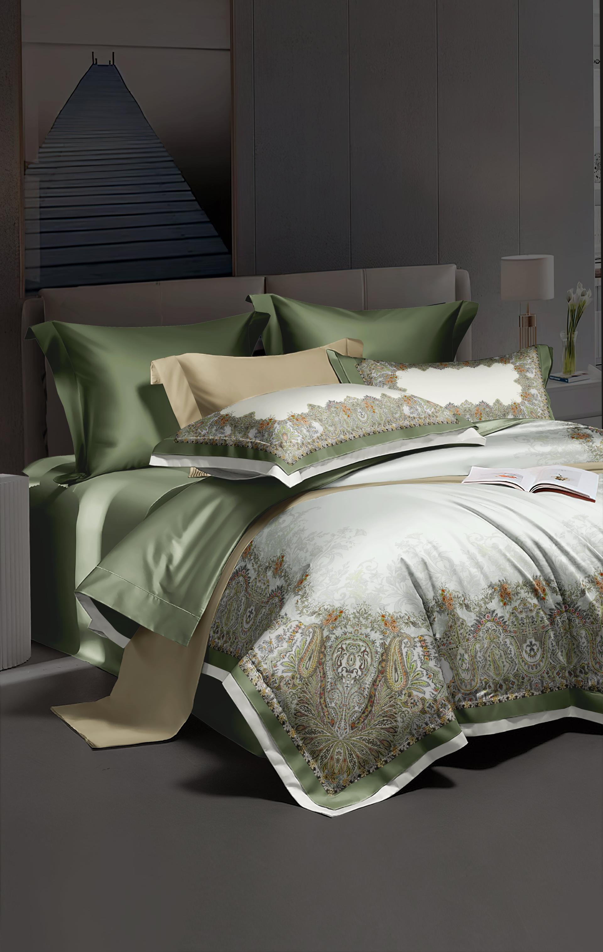 The Bourbon Stories has four series, brown, green, pink and gold, each with its own characteristics and elegant. It uses a complex floral pattern of gold, blue and green, as if the garden of the Palace of Versailles was transplanted to the bed. The alternation of green and beige adds a touch of freshness and elegance to this luxury, making the entire bedroom space both solemn and full of vitality.