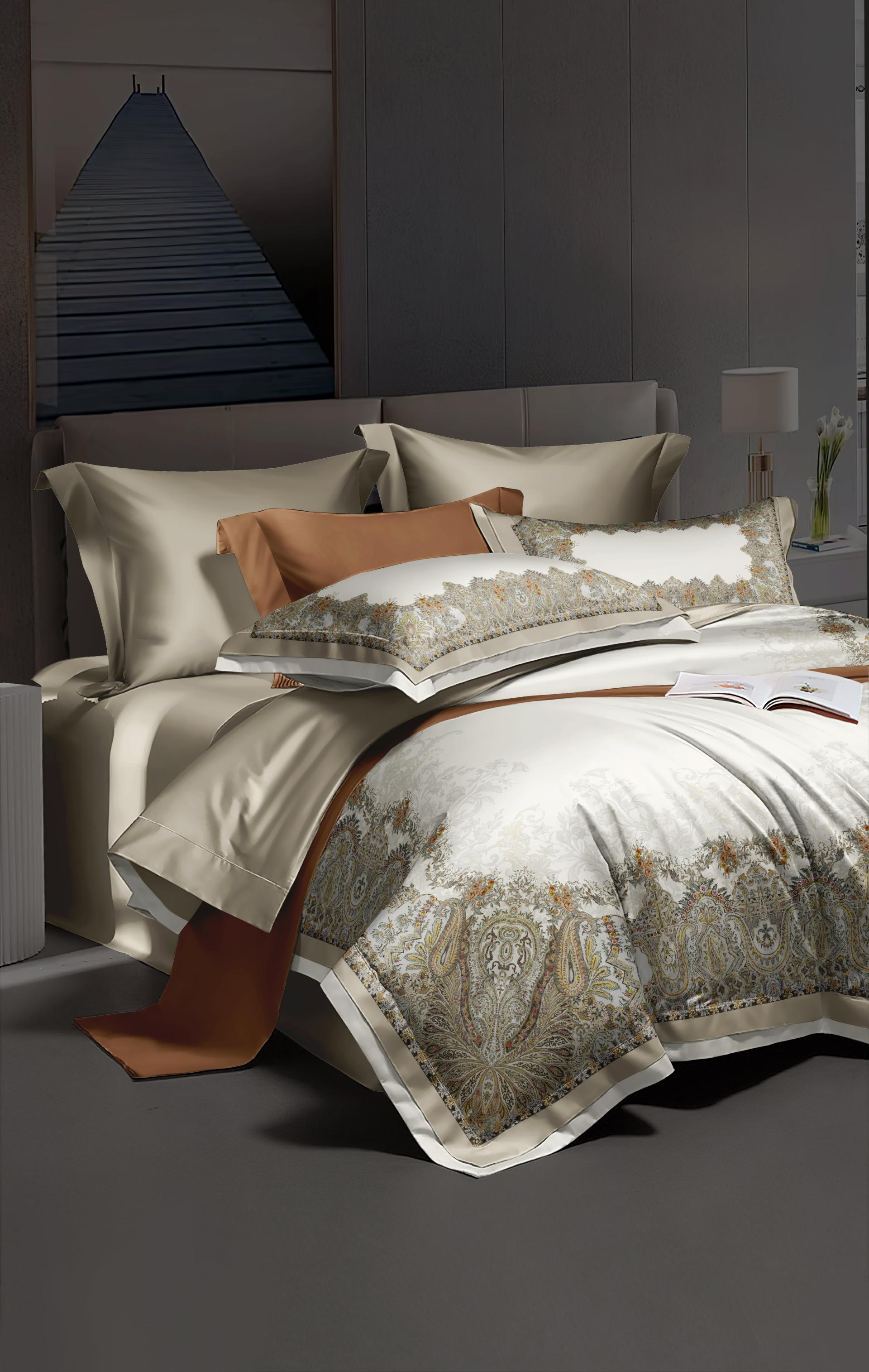 The Bourbon Stories, a high-end four-piece bed set, is inspired by the glorious Bourbon dynasty in French history. It incorporates the splendor and romance of the Palace of Versailles into every inch of fabric. This four-piece set seems to have come from the ancient palace, adding an unrepeatable dignity and magnificence to the user's bedroom.
