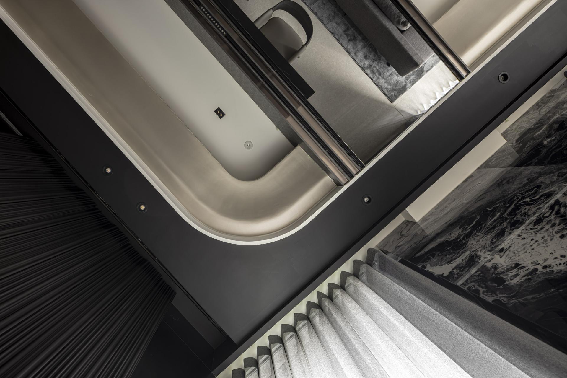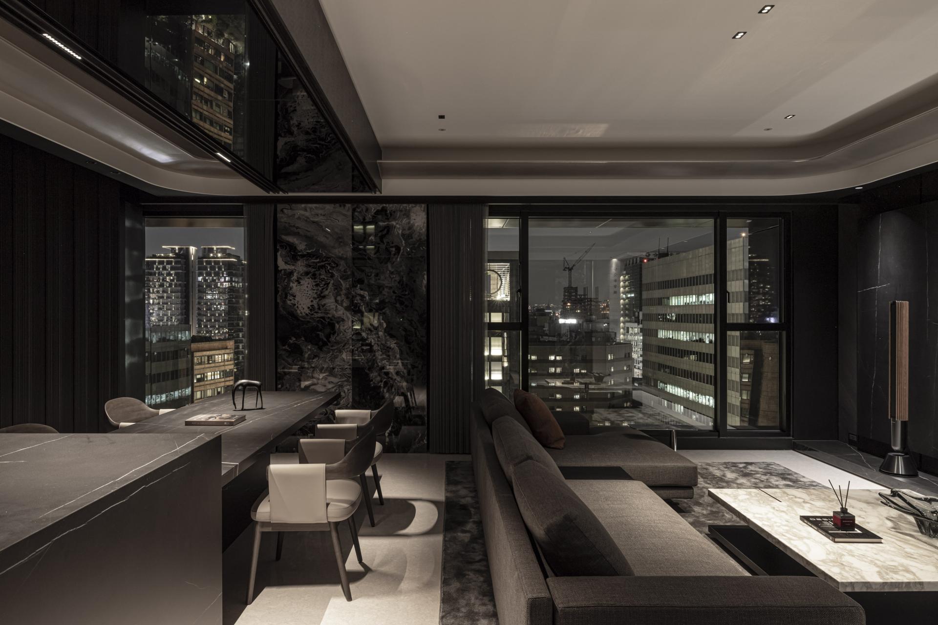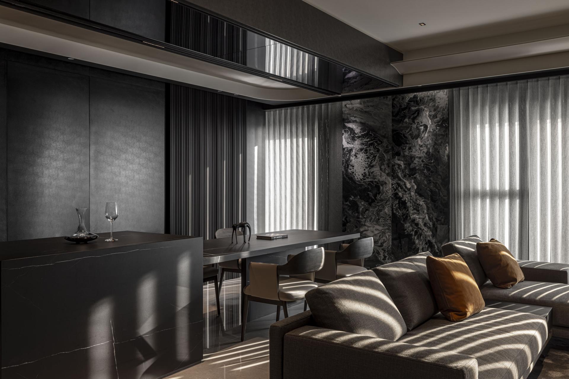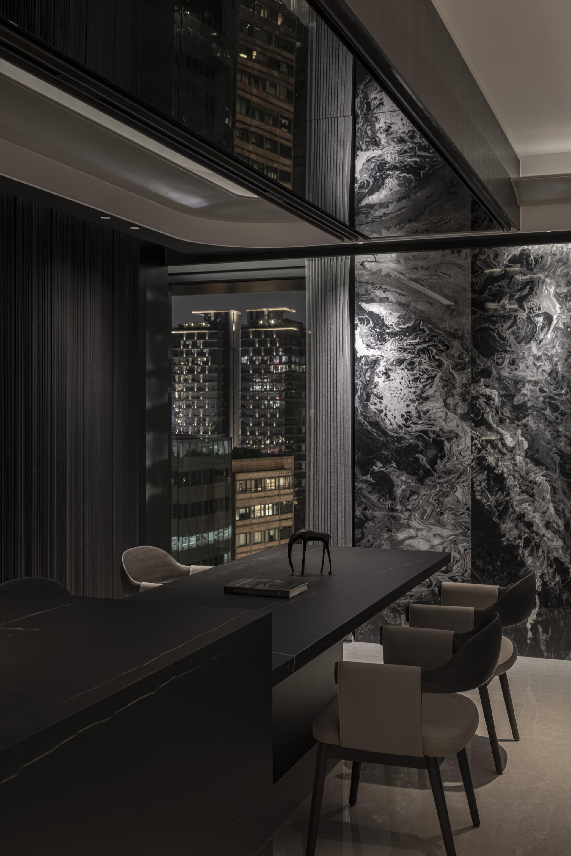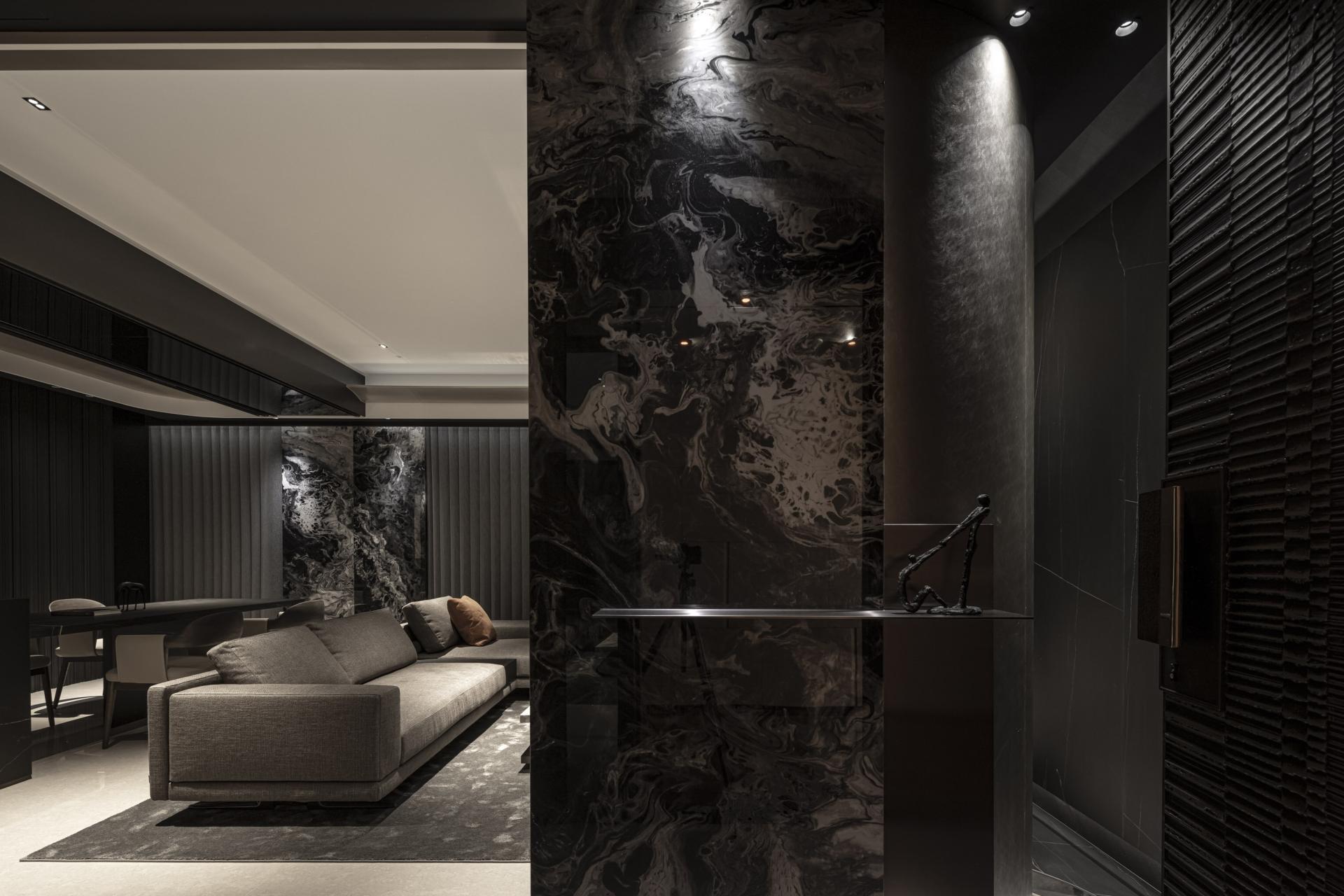 The project is built on a foundation of deep, stable hues, utilizing elements such as stone, wood, and titanium plating to create a richly layered visual effect. The open space is skillfully divided into distinct areas—a living room, dining area, and display zones—through the clever use of furniture and flooring materials. Each area remains interconnected yet retains its individuality. The lighting design integrates an intelligent control system that manages both indirect illumination and focused projections, highlighting the narrative within key spaces.