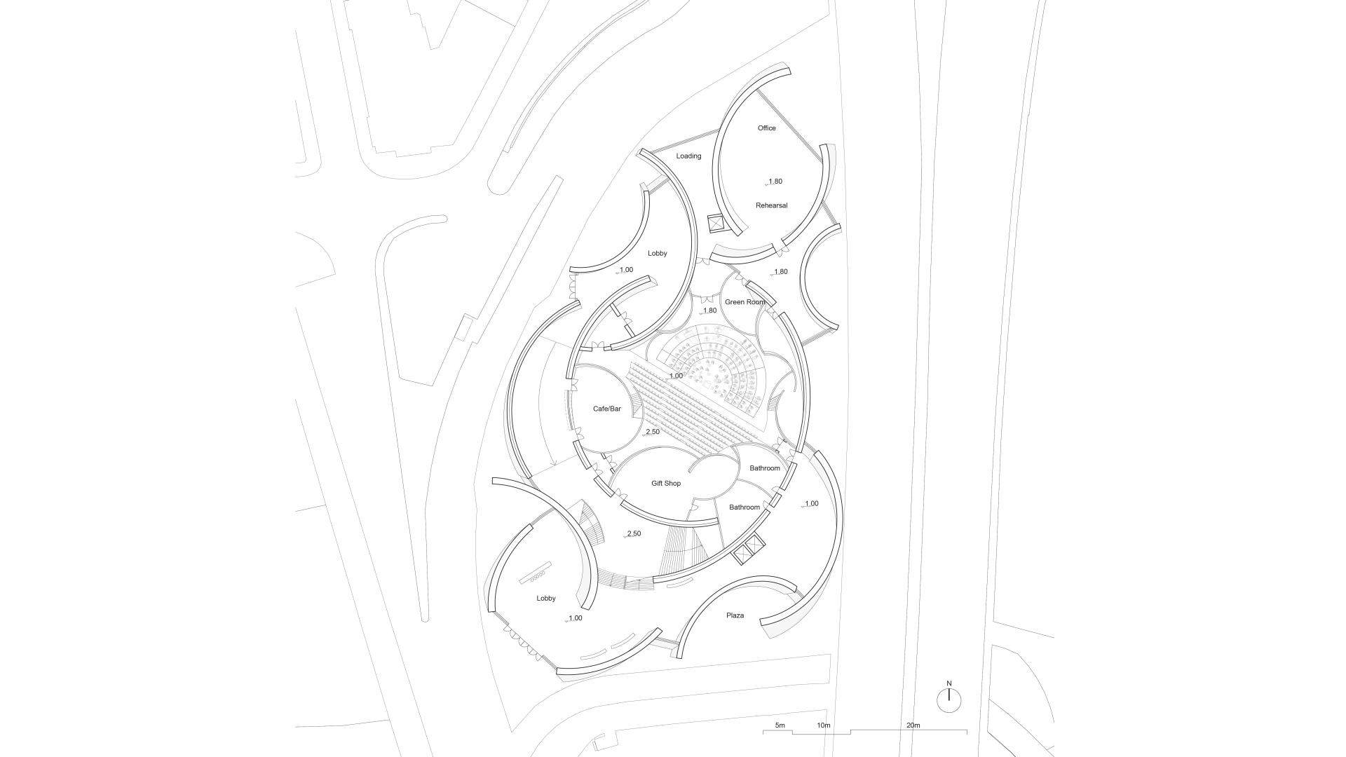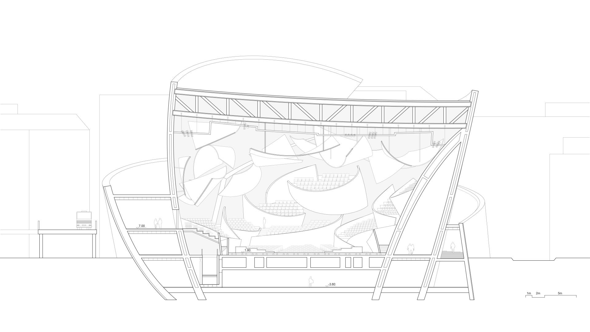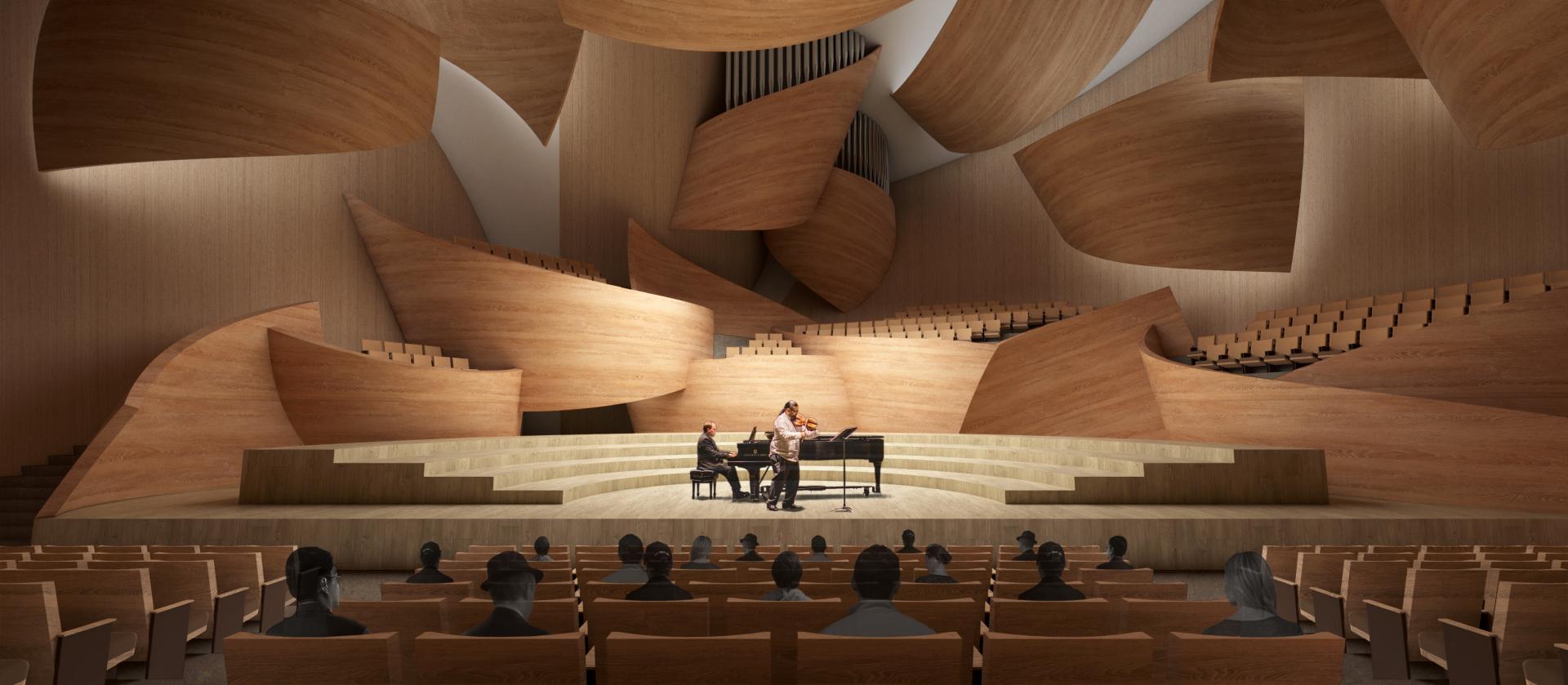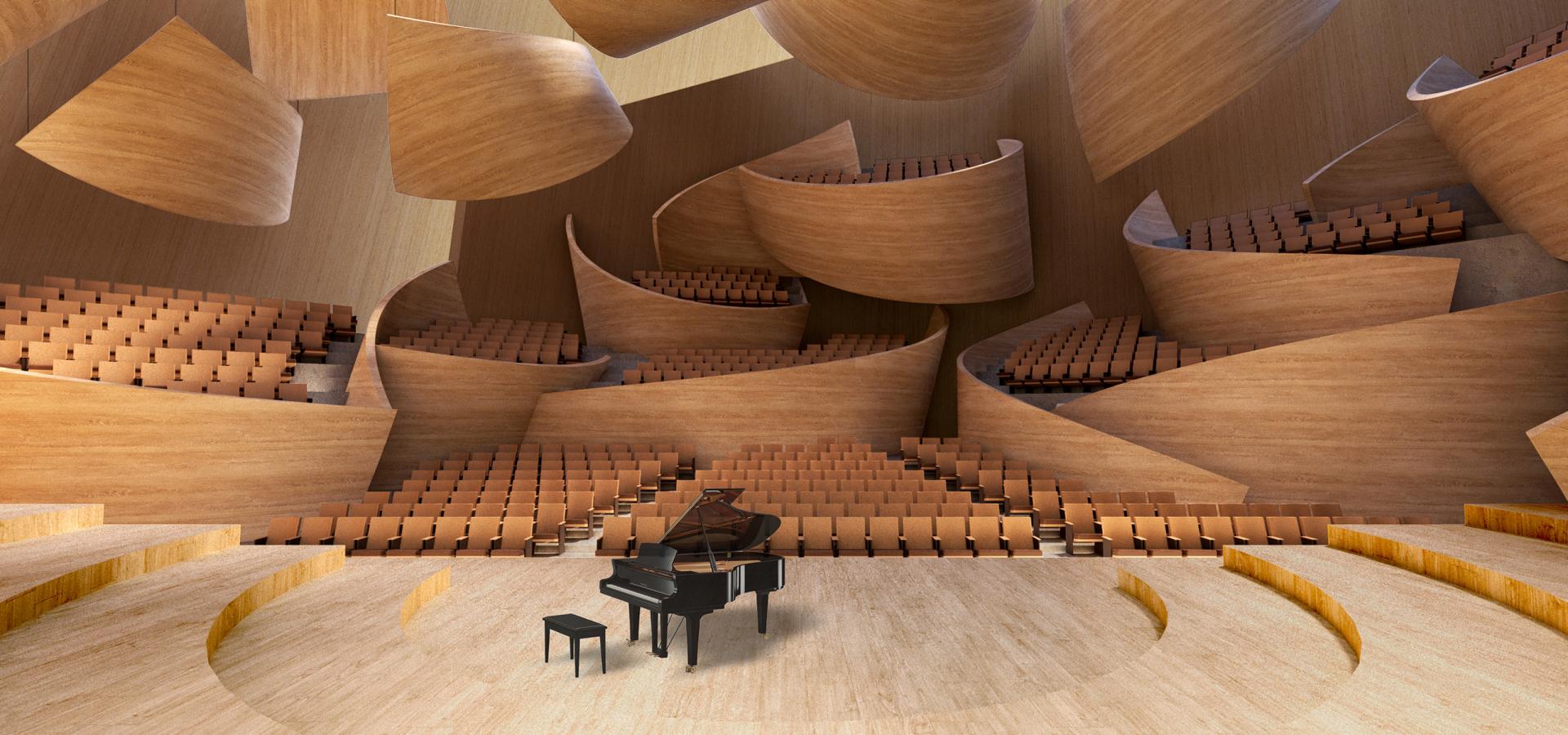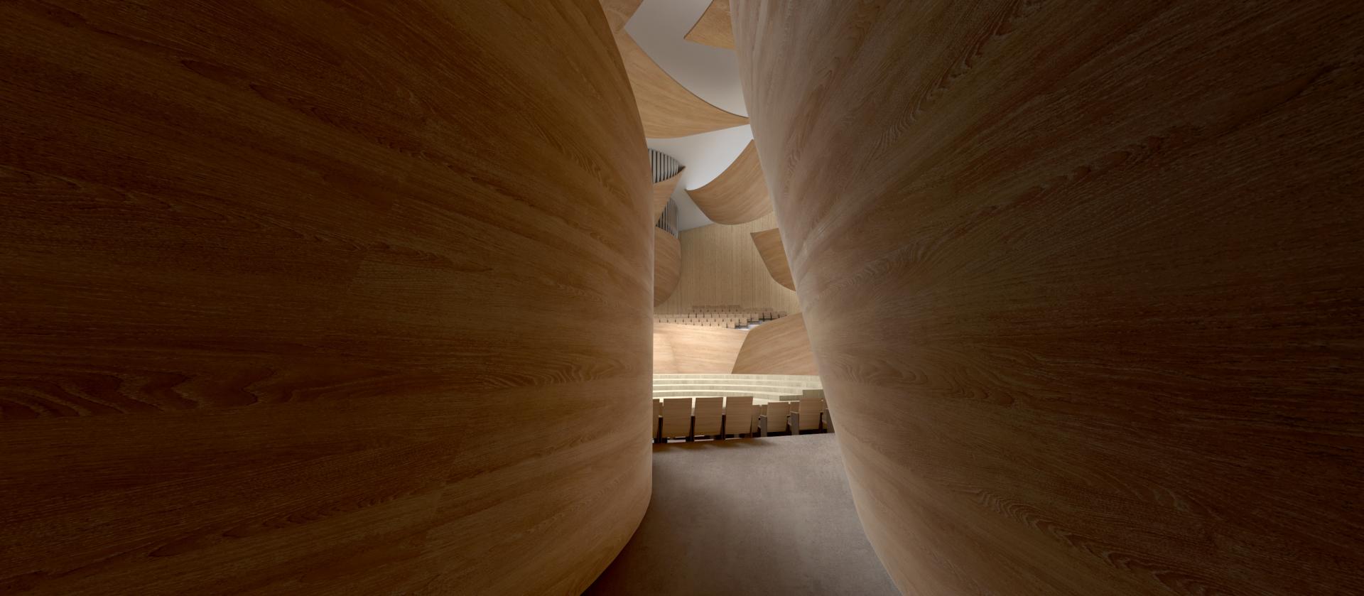 The architectural concept lies in a prototype: a piece of wood bent by a taut string, embodying the tension that harmonizes opposites. This simple yet evocative gesture evolves into an orchestration of architectural elements, including walls, balconies, and acoustic panels. Each architectural element originates from the core prototype, adapting its scale and tectonics to compose a harmonious spatial symphony.